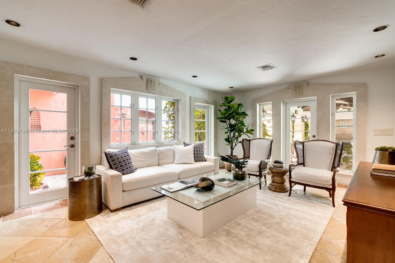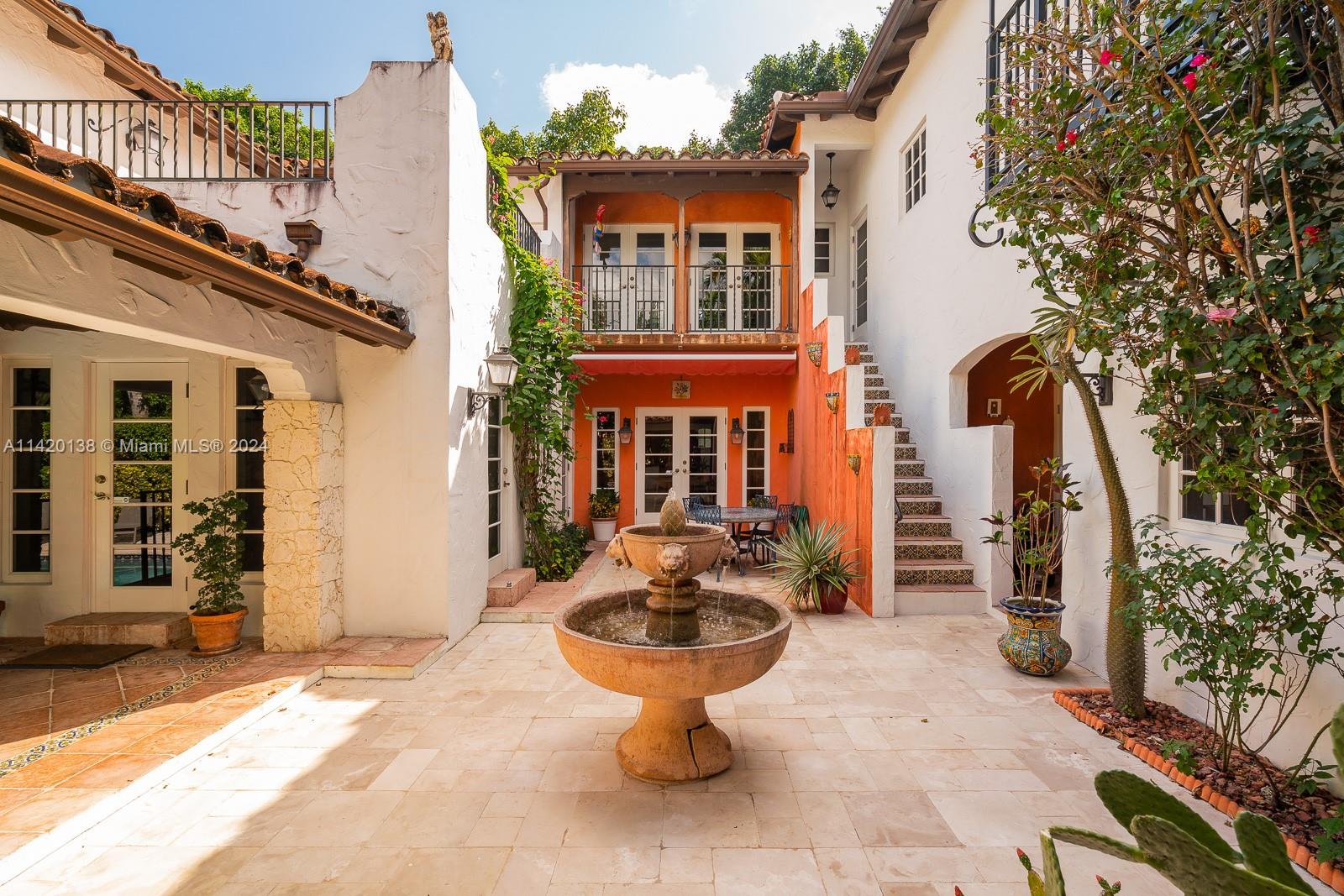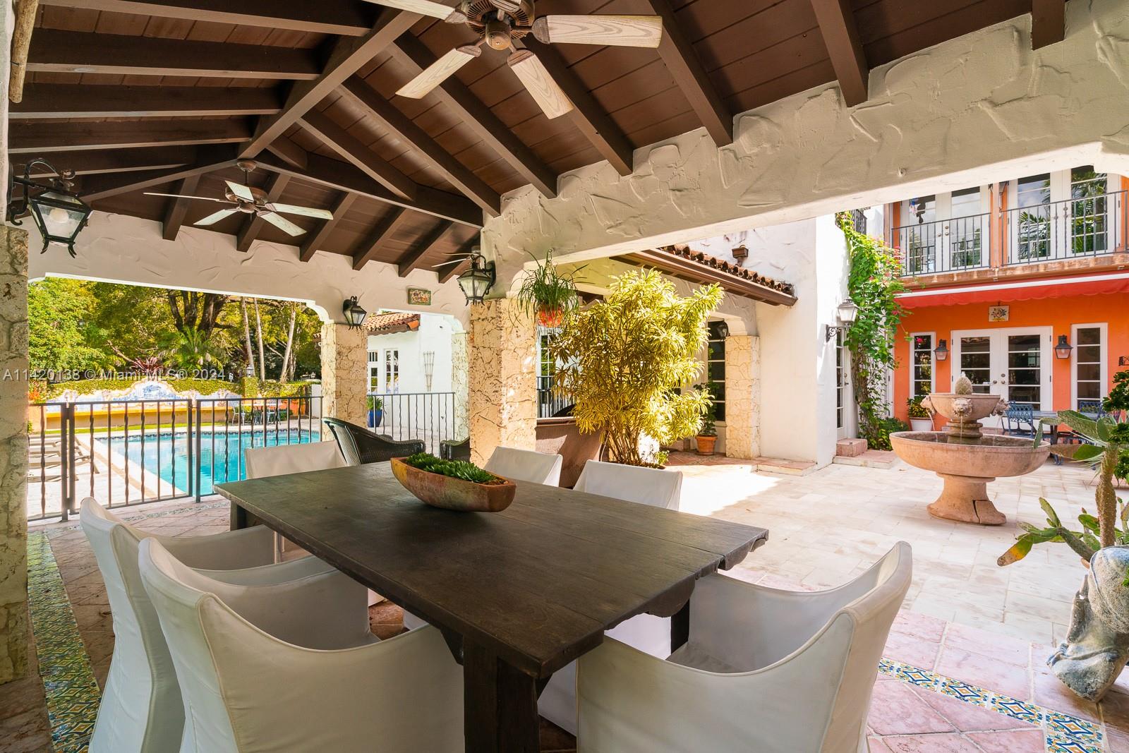 1920's Old Spanish style villa with 6397 actual square feet (5044 living area) on a 15,750 sq ft lot steps from the Biltmore Hotel & Golf Course, Salvadore Park and the Venetian Pool. Classical architecture with loggia, Palladian window frames, high timber-beamed ceiling in the main living room & sun-dappled courtyards with flowing fountains. There are 6 bedrooms and 6.5 bathrooms. The primary bedroom suite & 3 other bedrooms are upstairs. Guest bedroom and a maid's bedroom on the 1st floor. Summer kitchen, large library & office by the heated pool. The home is walled and gated and within walking distance to many Coral Gables landmark destinations and to Downtown Coral Gables. 2-car garage, impact doors & windows. Also available for annual lease at $29,000 a month or $39,000 furnished