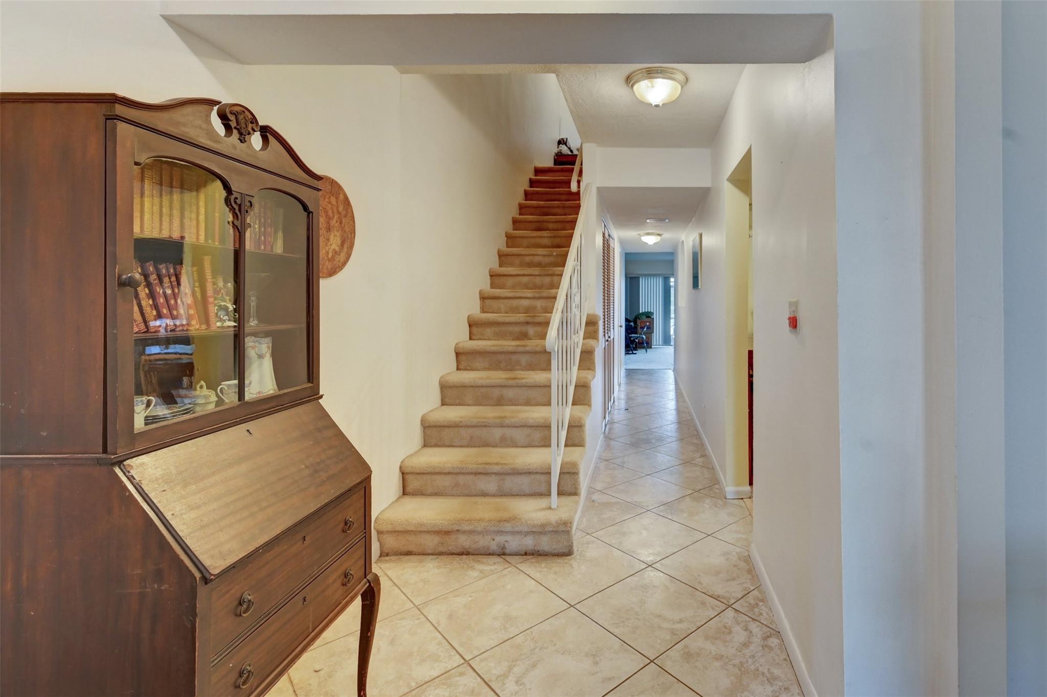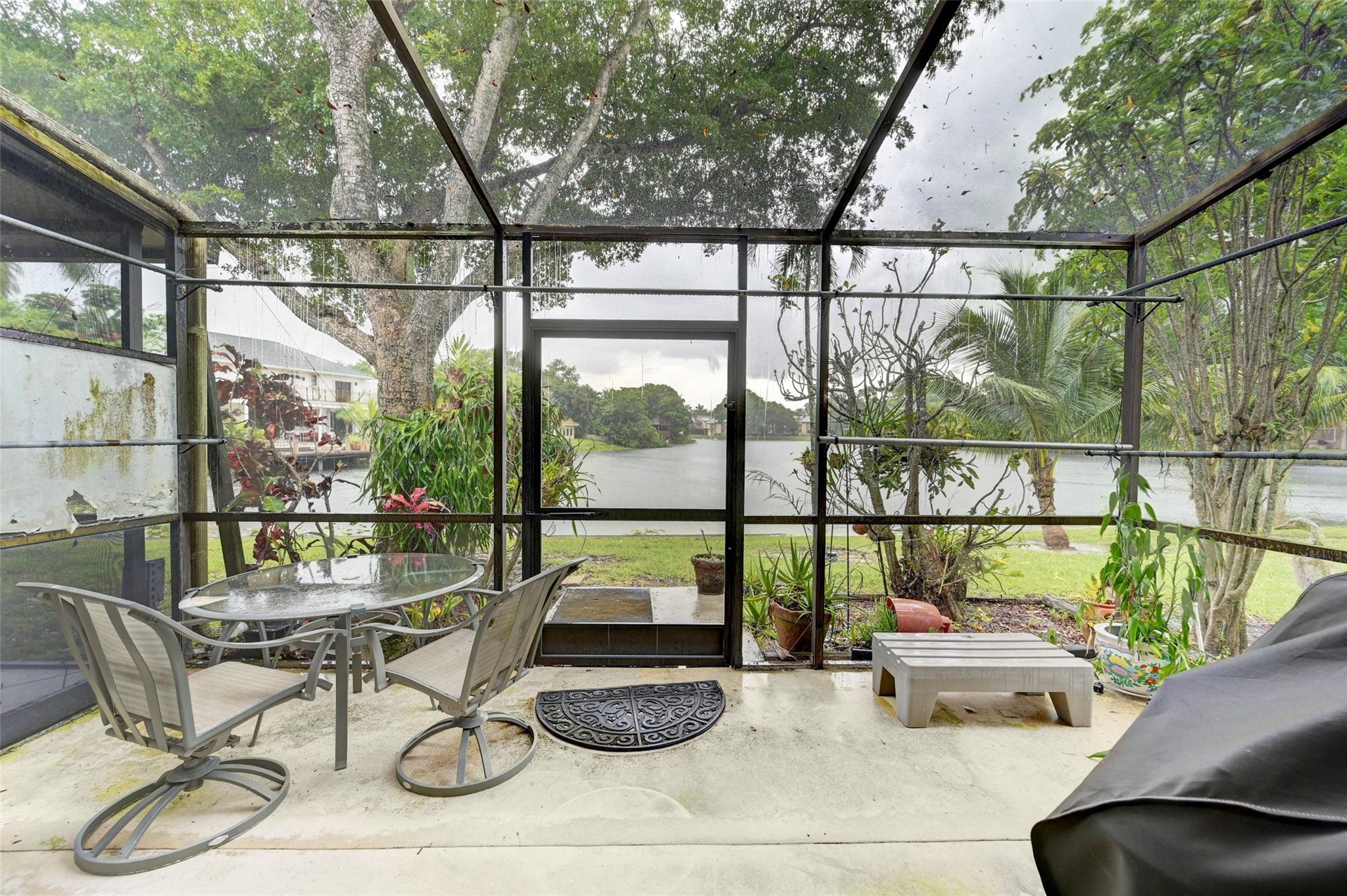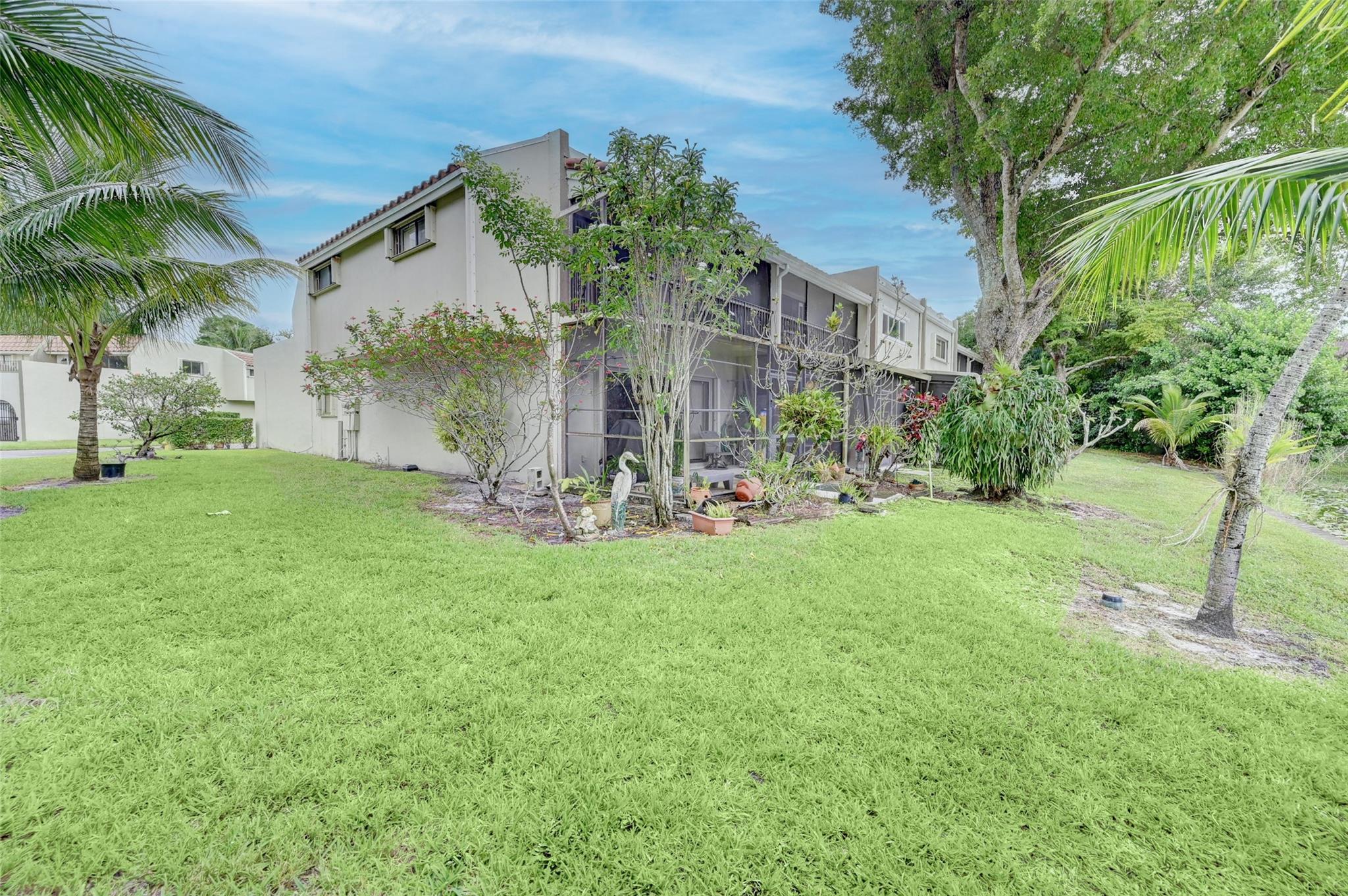 This spacious lake view corner unit townhouse has a separate room that can be a dining room, office or converted to a 4th bedroom. 3 bedrooms upstairs, secondary bedroom has a screened patio, primary bedroom has its own outdoor patio. Sit back and relax on your lake view screened in patio. Perfect home for entertaining. Accordion shutters on all windows. New roof installed 2021, exterior paint 2019 and new pavement in 2022. Walking distance to Central Park and Jacaranda Country Club. Information believed to be accurate but not warranted.