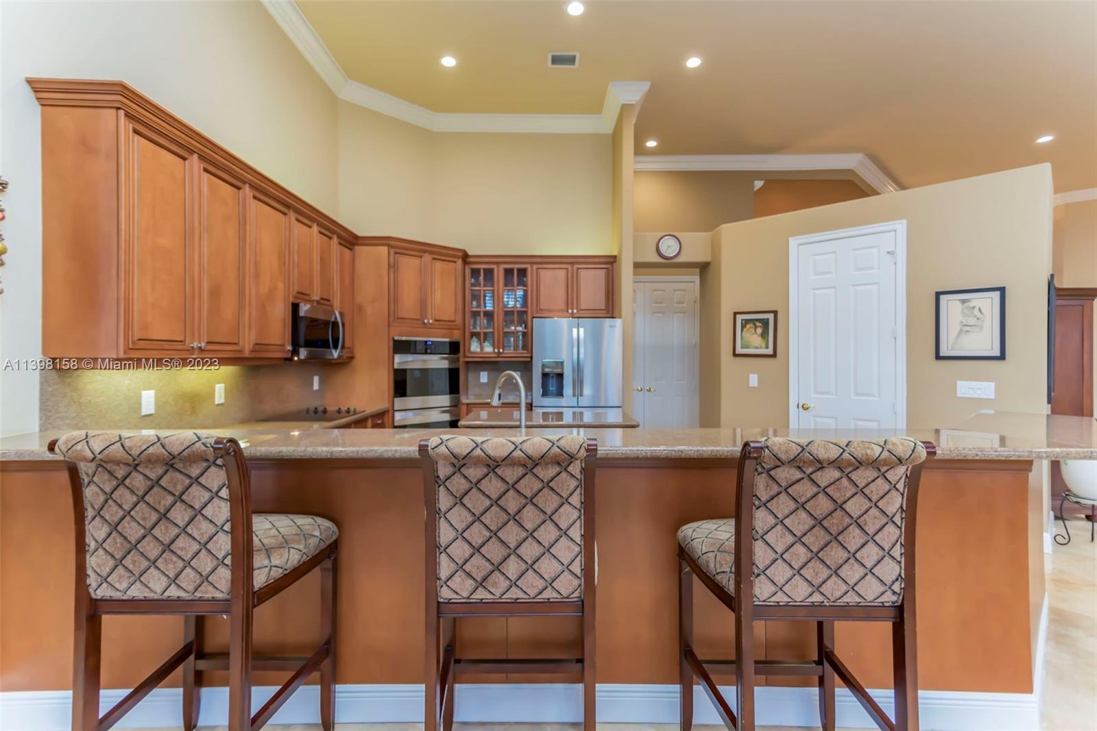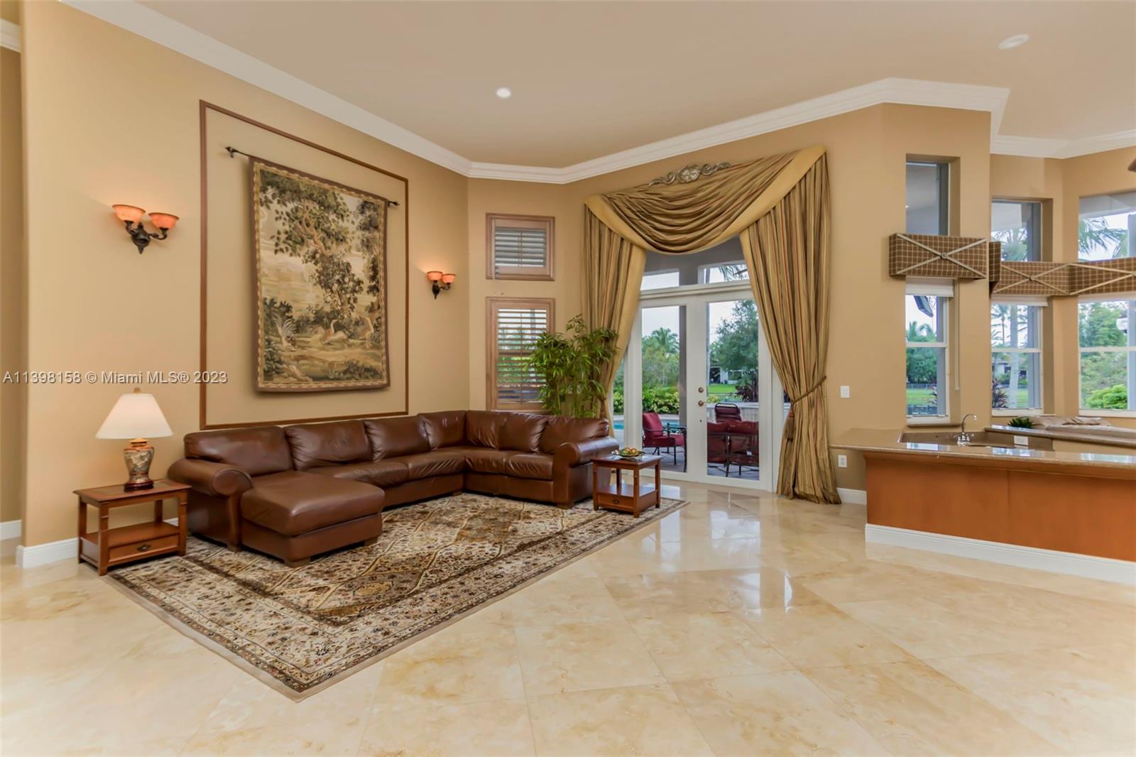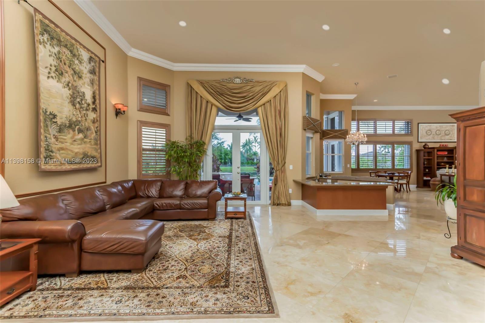 STUNNING ONE STORY HOME ON A BUILDERS ACRE, IN THE MANNED GUARD GATED COMMUNITY OF RIVERSTONE, WITH 4 BEDROOMS, PLUS AN OFFICE & 4 FULL BATHROOMS. THIS HOME FEATURES MARBLE FLOORING IN THE MAIN LIVING AREAS, REAL HARDWOOD FLOORING IN THE BEDROOMS, VOLUME CEILINGS, CROWN MOLDING, PLANTATION SHUTTERS, WET BAR & CLOSET BUILT-INS. THE UPGRADED KITCHEN IS COMPLETE WITH GRANITE COUNTERTOPS, WOOD CABINETRY WITH PULLOUTS AND NEWER STAINLESS STEEL APPLIANCES. THIS SPLIT FLOOR PLAN OFFERS AN OFFICE NEXT TO THE MASTER SUITE & JACK/JILL BEDROOMS, ANOTHER BEDROOM WITH ITS OWN PRIVATE BATH ON THE OTHER SIDE OF THE HOUSE. THE HUGE BACKYARD HAS AN OVERSIZED COVERED SITTING AREA, GORGEOUS HEATED FREE FORM POOL & SPA WITH LUSH LANDSCAPING OVERLOOKING THE LAKE. THIS HOME IS PROTECTED BY ACCORDION SHUTTERS.