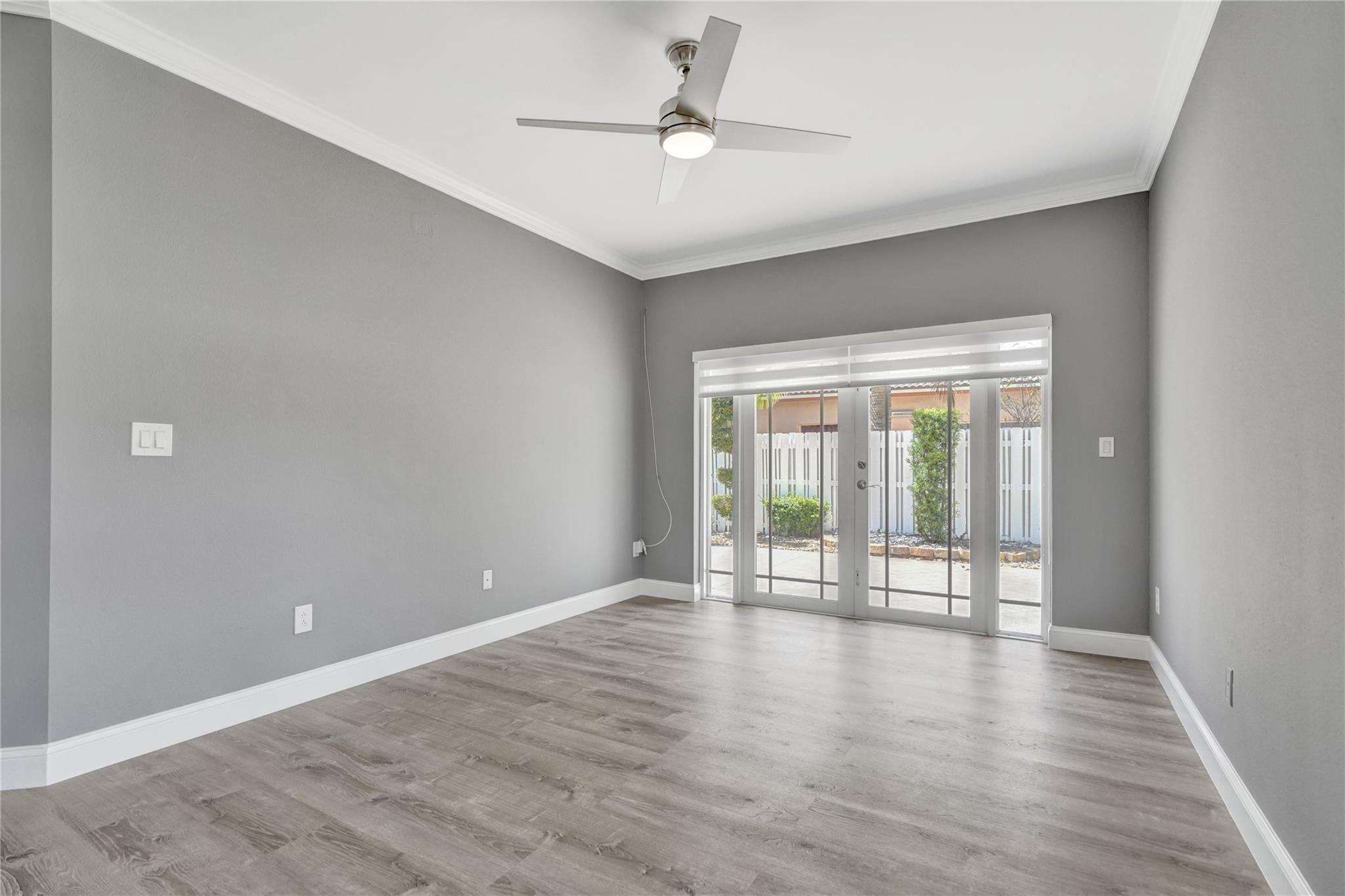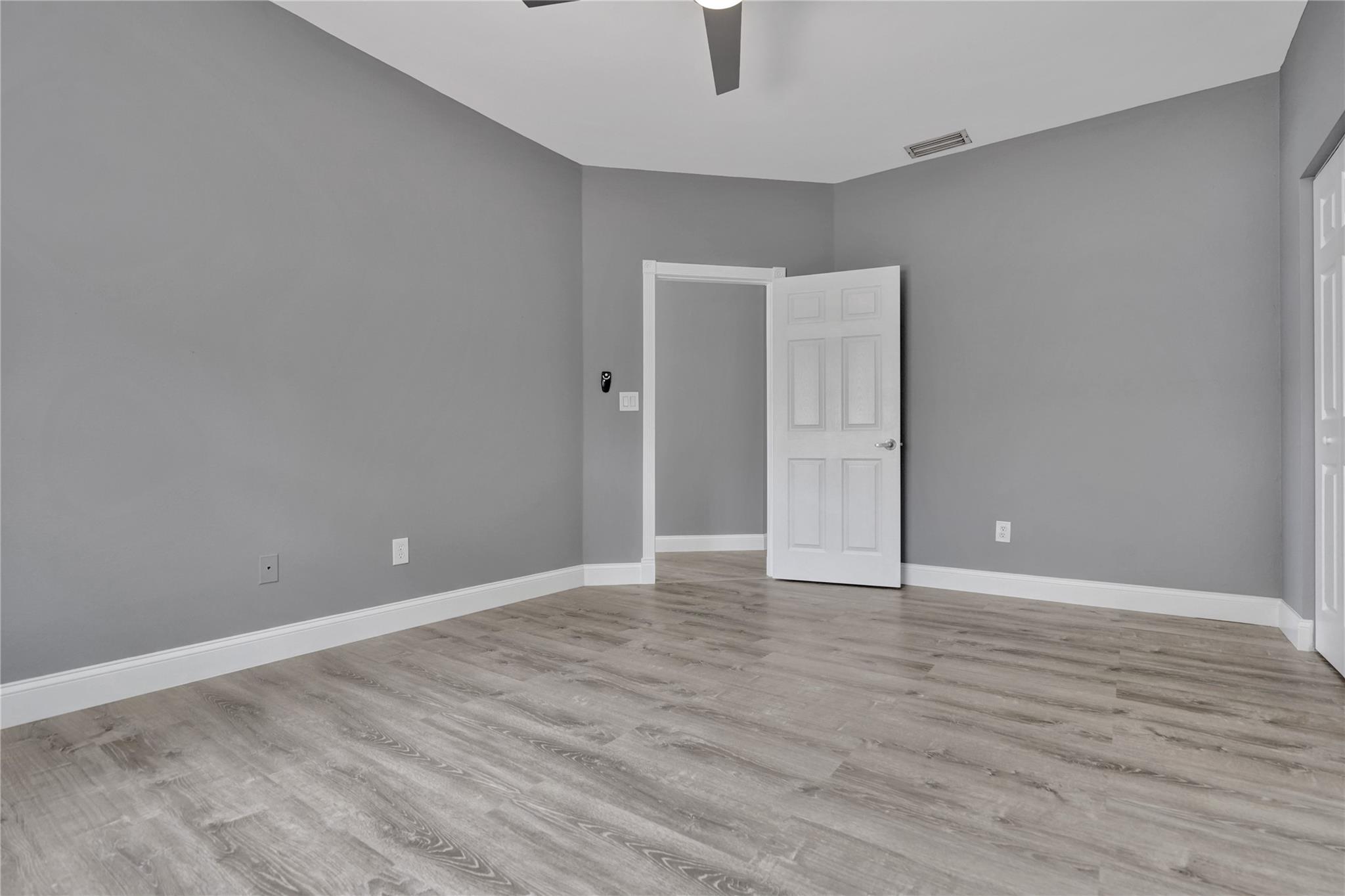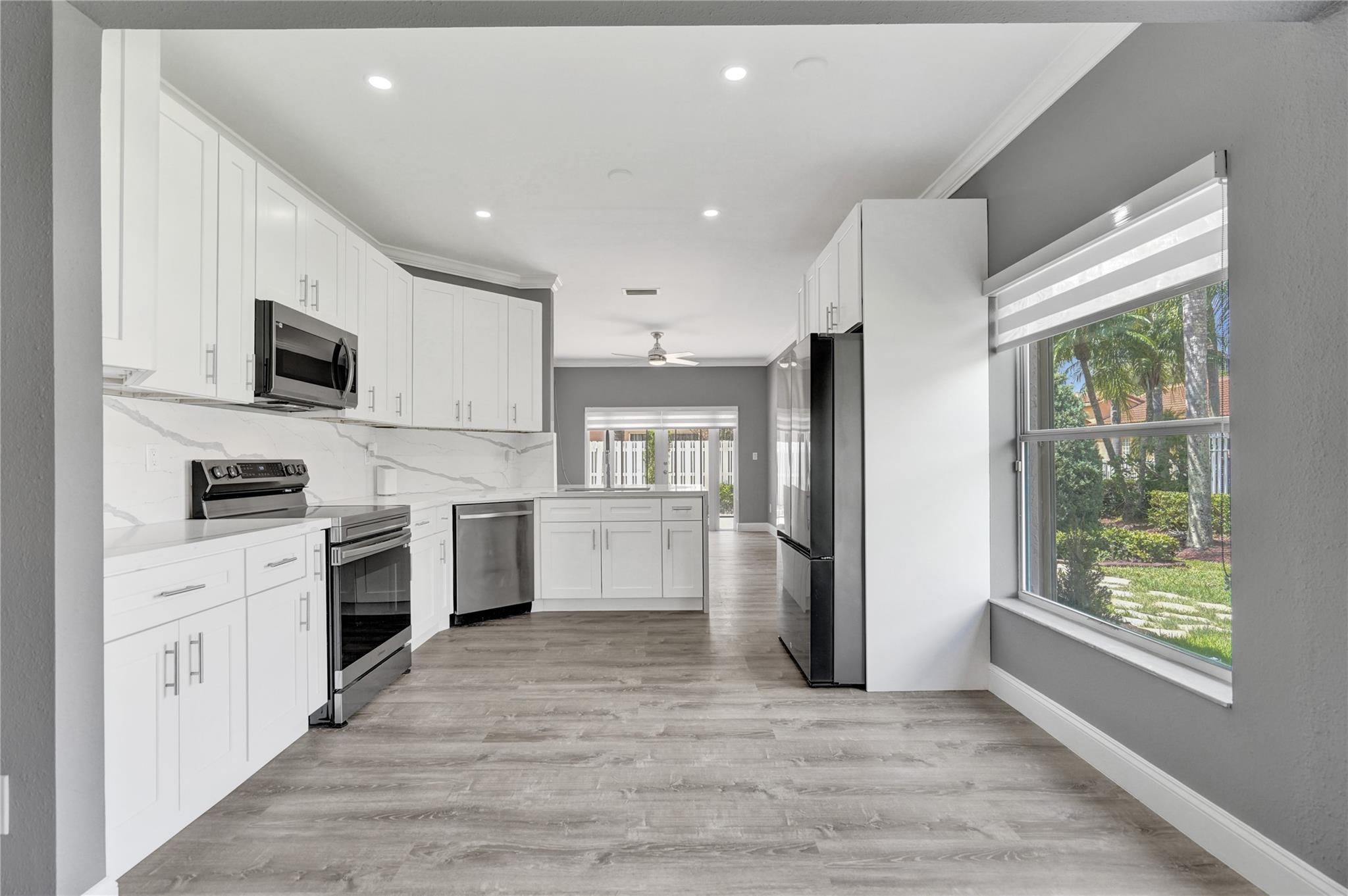 New roof 2020! Beautifully updated w designer accents featuring freshly painted interior w smooth ceilings, new vinyl wood flooring w 10 year warranty in all living areas & bedrooms, elegant luxe bathrooms w stately tile & quartz counters, LED framed mirrors. Spacious open kitchen w extended new cabinets, new stainless appliances, great refrigerator!, quartz counters & backsplashes. LED lighting & stylish window blinds accent this home's open concept. Private fenced yard with large patio, no neighbors on one side, close stroll to the community pool. 2022 water heater, accordion shutters. Gated community of Chapel Cove w monthly HOA dues of $70 monthly includes water for lawn irrigation. Chapel Trail Master HOA fee is $366 quarterly, includes Cable TV & internet. Walk to elementary school.
