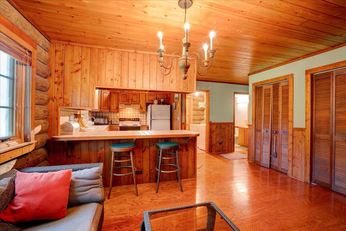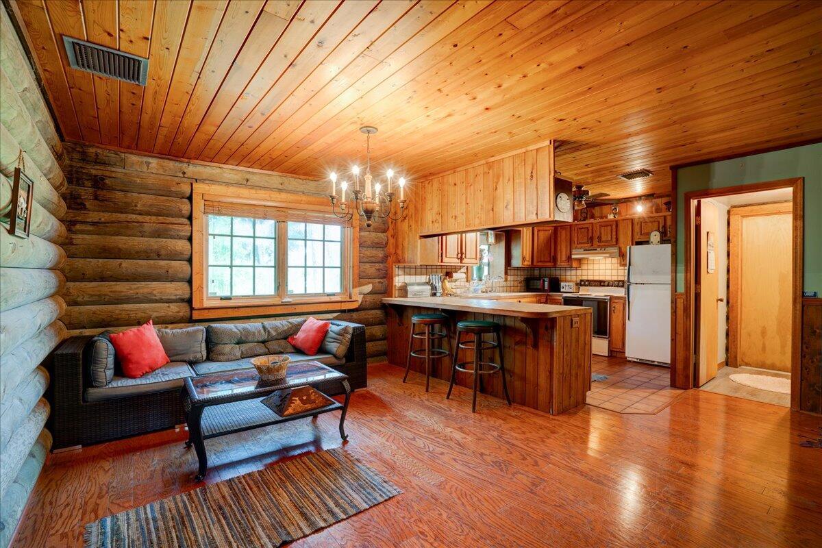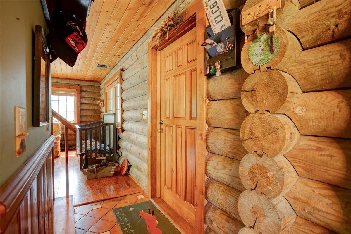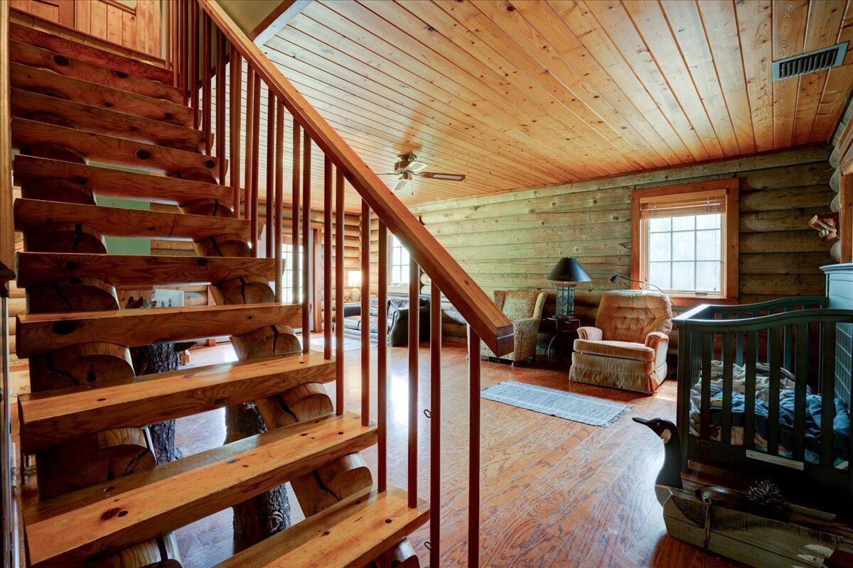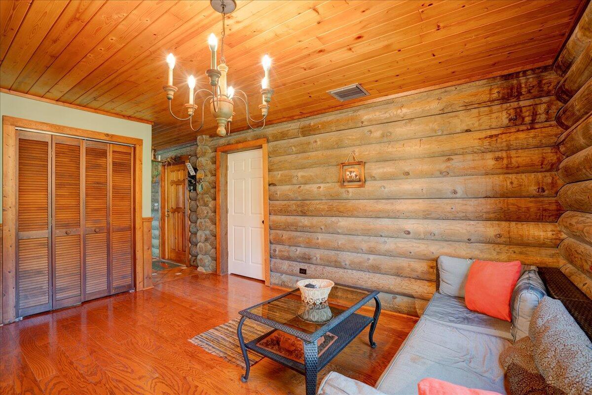 Welcome to this one-of-a-kind 3-bedroom log home, nestled on a sprawling 1.25 lot. This distinctive property exudes rustic charm. Its unique character and the idyllic surroundings make it a perfect opportunity for those seeking a personalized retreat.As you approach the property, you'll be immediately captivated by the classic log construction that exudes warmth and character. The home's exterior features sturdy logs, creating a timeless aesthetic that seamlessly blends with the surrounding landscape. A spacious front porch beckons you to sit back, relax, and take in the peaceful ambiance of the wooded surroundings.Step inside, and you'll be greeted by an inviting interior that showcases the beauty of natural wood. The living area features a wood floor, and pine panel ceiling.