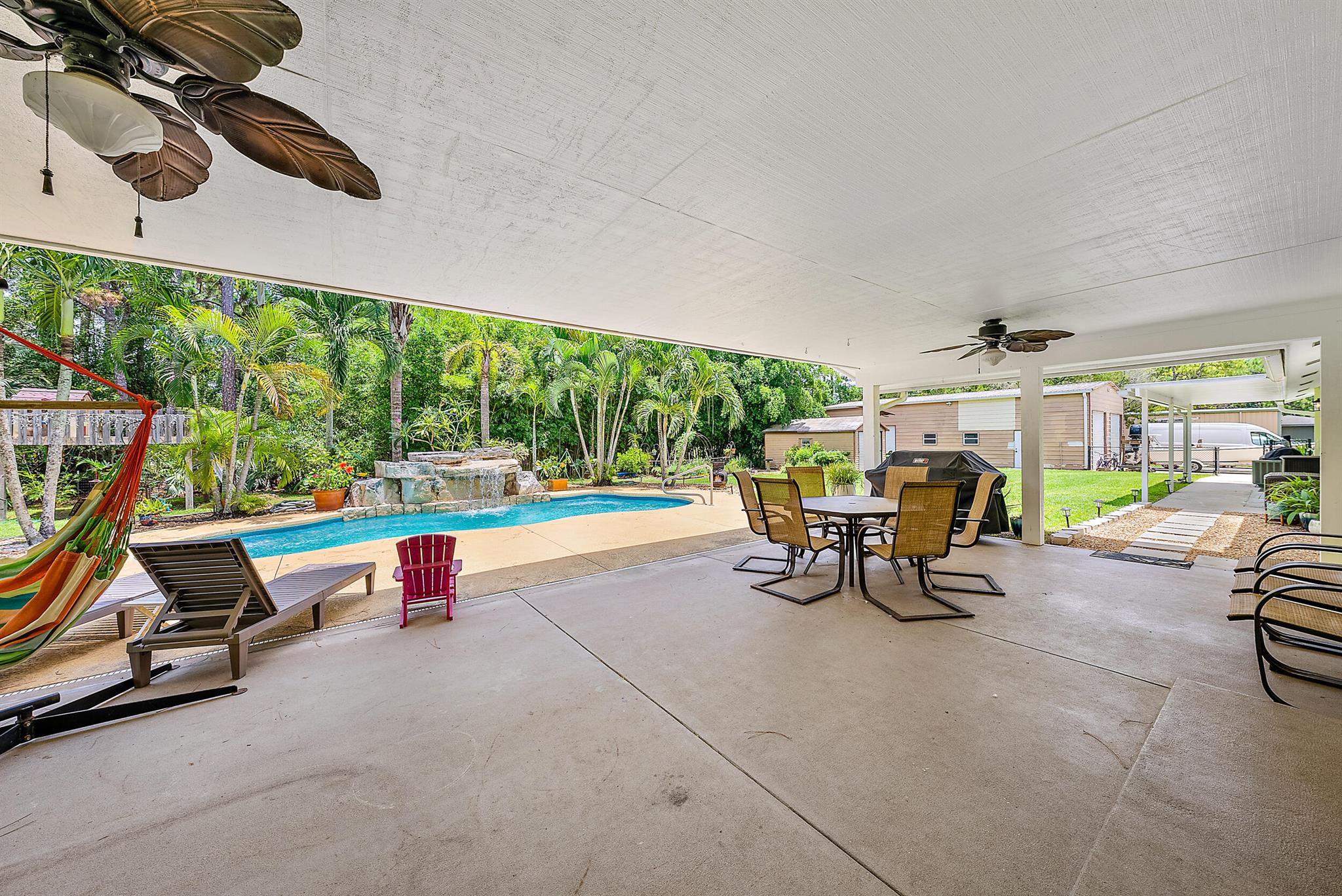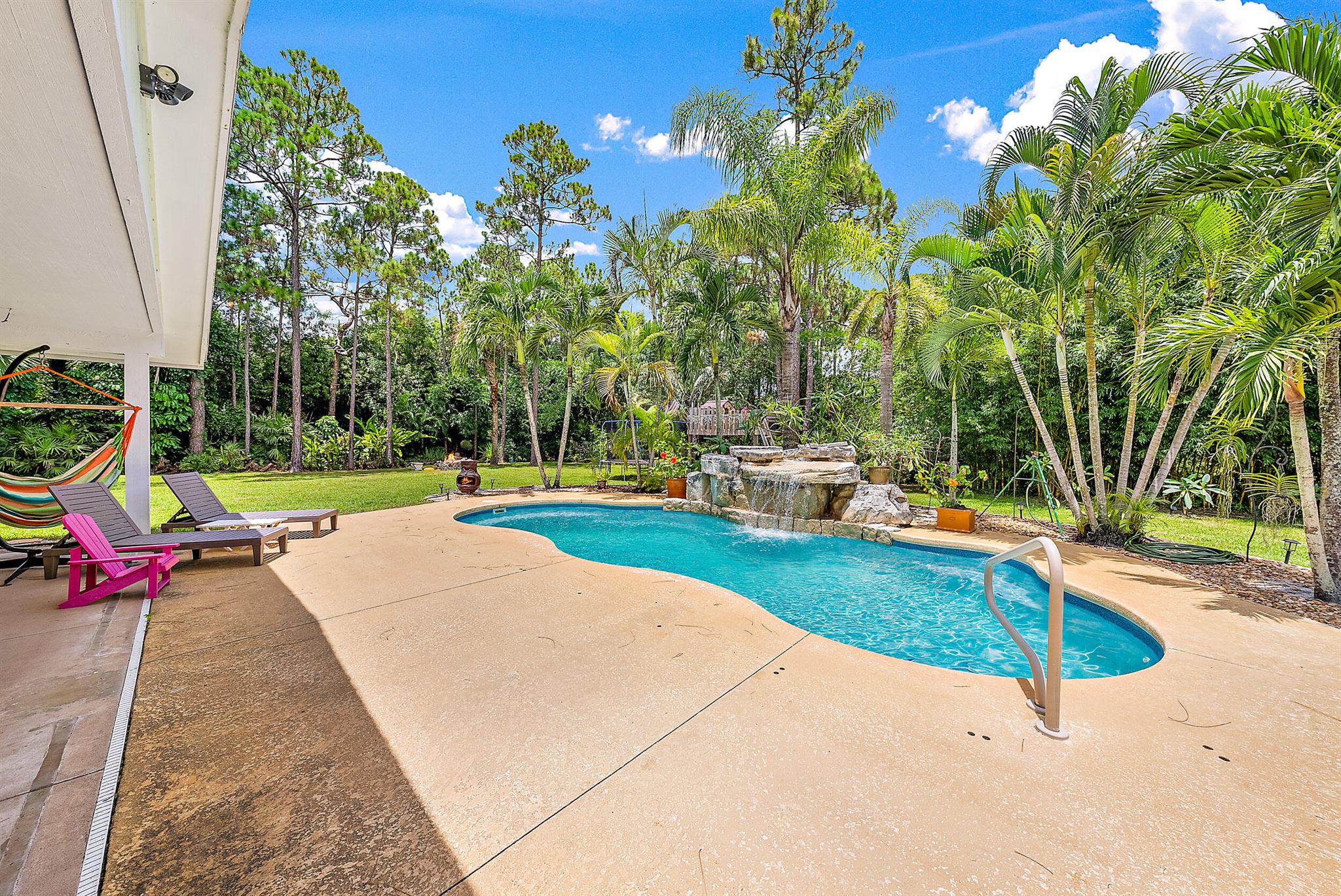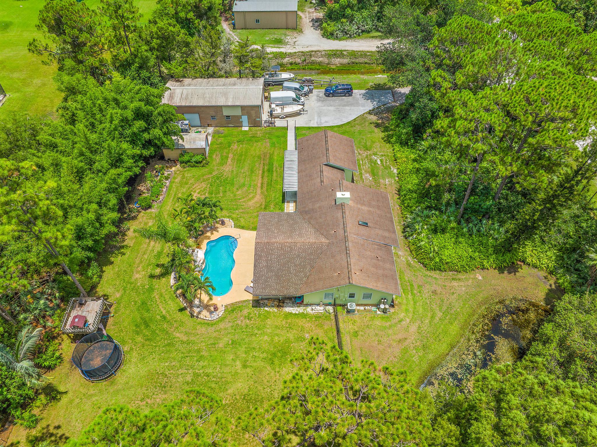 Come home to your personal oasis! This home has a gorgeous rock waterfall sparkling pool on a secluded 1.49 acres lot! The rambling living space has a large den, room for an office/play area, a dedicated dining room, breakfast bar, kitchen w/ granite counters, ample pantry space & 3 sets of French doors which make the home light & bright throughout! Other features include a wood burning fireplace, sky lights, split bedroom plan, master walk in closet, en suite master bath, 2 zone A/C, large patio overlooking the pool & is on lushly landscaped land. A huge garage/warehouse is for the handy man & is 1300 sq ft (50 x 26) w/ 2 roll up doors 12 x 12 & another roll up door 8x8, 220 electric, huge concrete driveway, storage shed & a fully fenced yard. Come on home to peace & luxury!