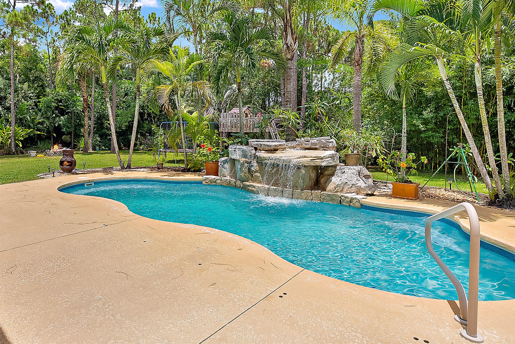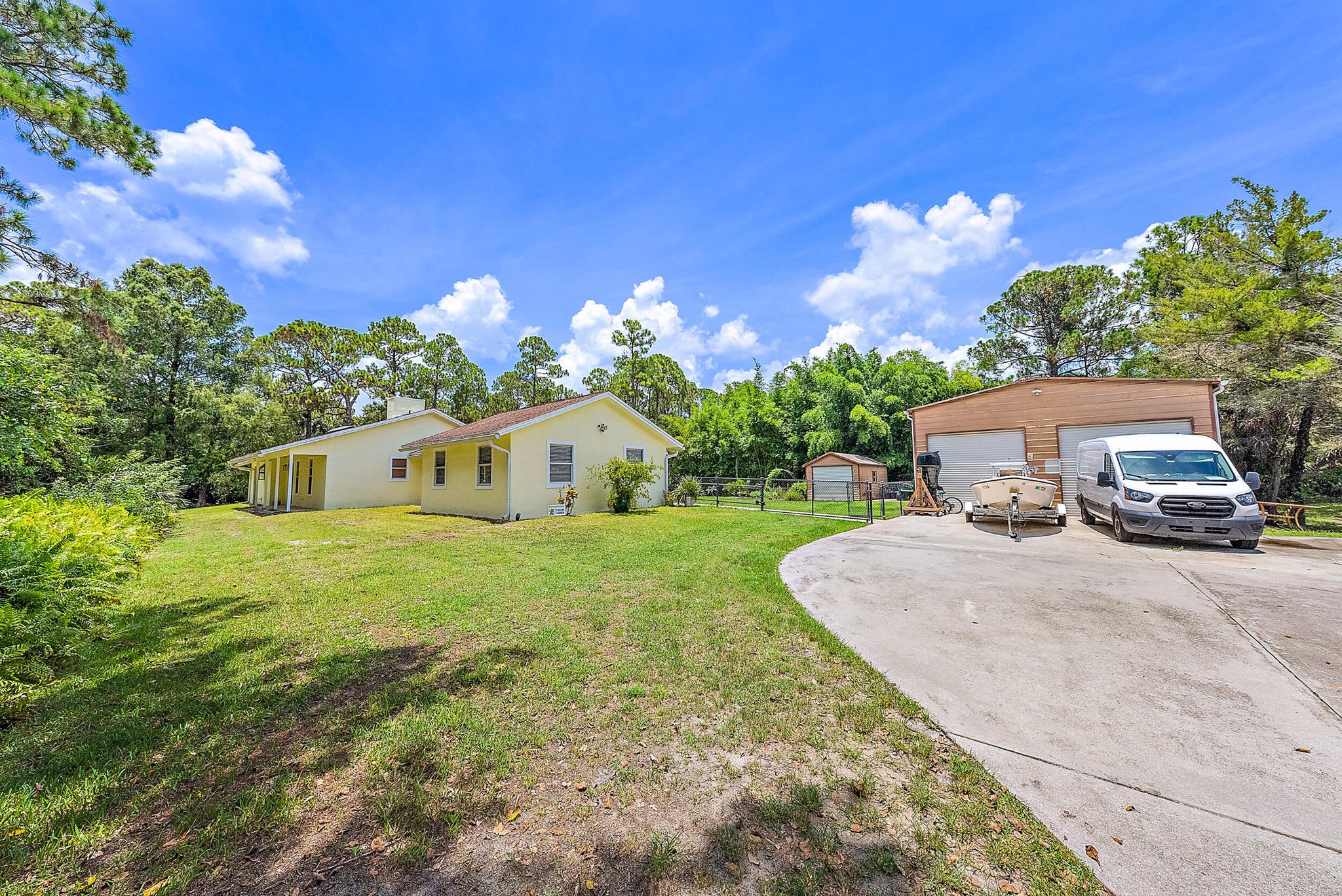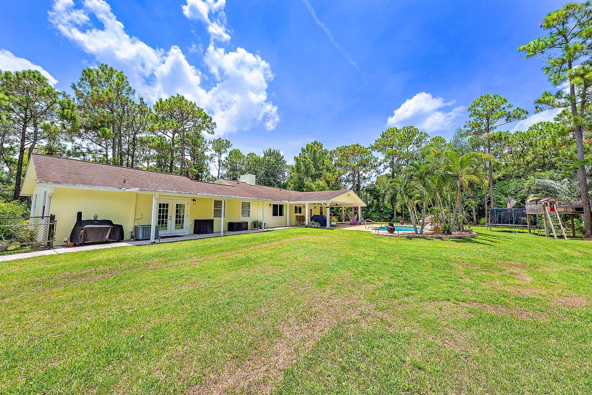 Come home to your personal oasis! This home has a gorgeous rock waterfall sparkling pool on a secluded 1.49 acres lot! The rambling living space has a large den, room for an office/play area, a dedicated dining room, breakfast bar, kitchen w/ granite counters, ample pantry space & 3 sets of French doors which make the home light & bright throughout! Other features include a wood burning fireplace, sky lights, split bedroom plan, master walk in closet, en suite master bath, 2 zone A/C, large patio overlooking the pool & is on lushly landscaped land. A huge garage/warehouse is for the handy man & is 1300 sq ft (50 x 26) w/ 2 roll up doors 12 x 12 & another roll up door 8x8, 220 electric, huge concrete driveway, storage shed & a fully fenced yard. Come on home to peace & luxury!