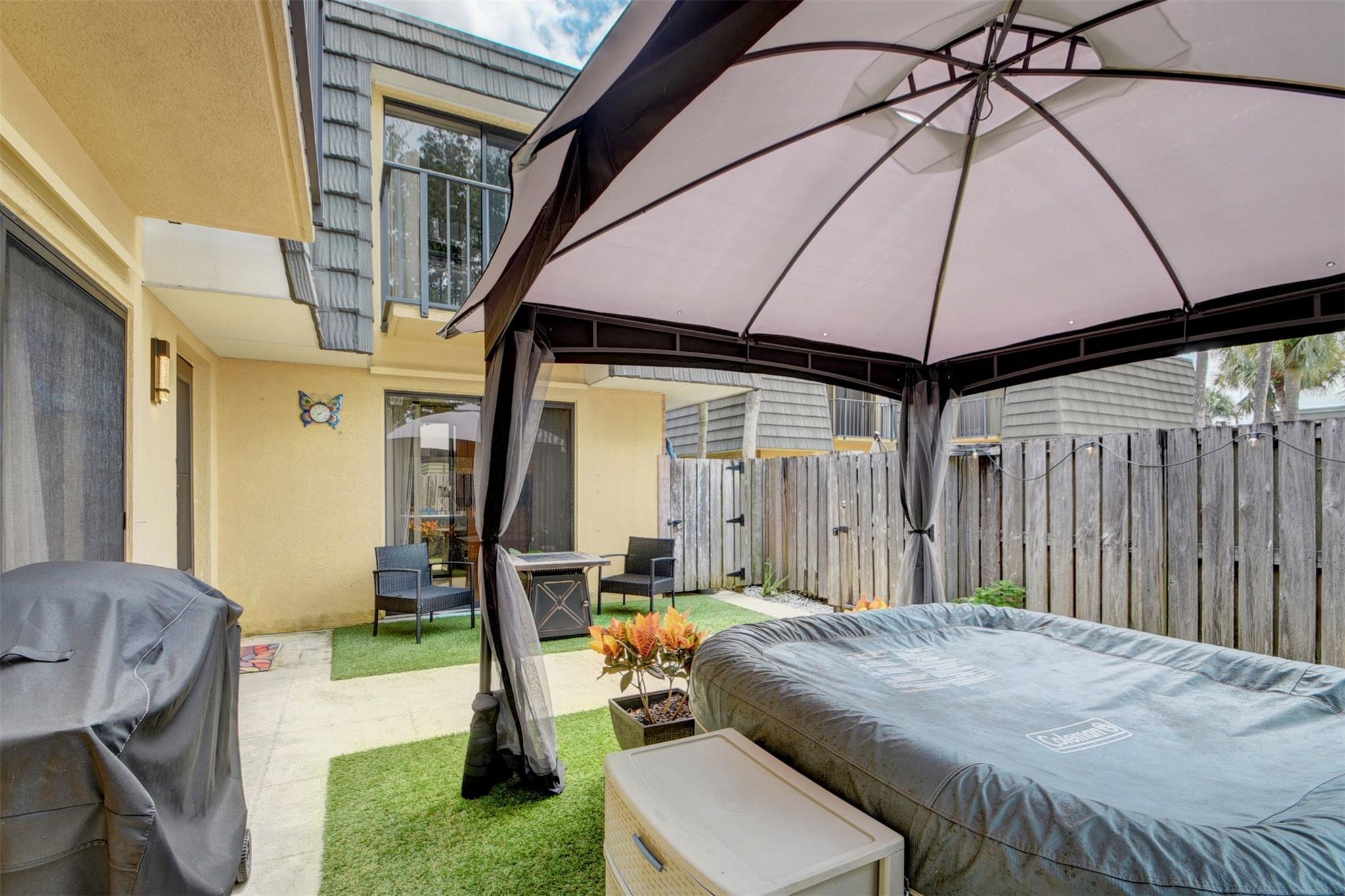 immaculate 2 bedroom / 2.5 bath townhouse in the lovely Village of Sandalwood Lakes community. This home features 20X20 porcelain tile throughout and an updated kitchen w/ granite counter tops. Enjoy the Florida sunshine in your expansive, fenced patio equipped with a charming gazebo and a relaxing hot tub. This space is an entertainer's dream, perfect for hosting gatherings, BBQs, or simply unwinding in your private oasis. New AC installed this year, roof was installed in 2013, fence will be redone by the association (no special assessments). Wonderful amenities; tennis courts, basketball courts, racquetball courts, volleyball courts, playgrounds and pools. Also, includes basic cable / water. Come take a look at this beautiful, move in ready home. Sellers are moving and motivated.