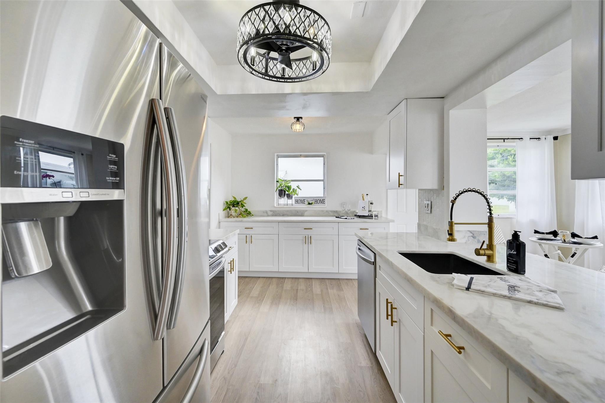 EAST, EAST, EAST! Beach it every day! Newly remodeled 2 Bed, 2 Bath Home in 55+ Community of Leisureville. This home has been freshly painted inside & out, has brand new vinyl flooring throughout, & the A/C & Water Heater were replaced in 2023. The chef's kitchen has been fully renovated w/ white cabinets with plenty of storage, quartz countertops, gold accents, & SS appliances. Bathrooms have been fully renovated w/new vanities w/ gold accents & new showers. Throughout the home you will find new light fixtures & chandelier fans. The pet friendly Leisureville Community offers many amenities: 2 clubhouses, pools, saunas, gym, shuffleboard, bocce ball, courtesy bus, & even offers residents FREE golf on their private 9-hole course! Assoc. requires 700 min credit score. No land lease.