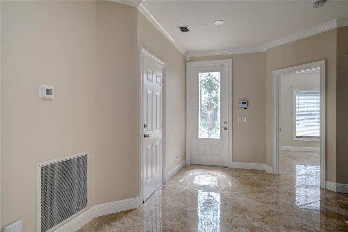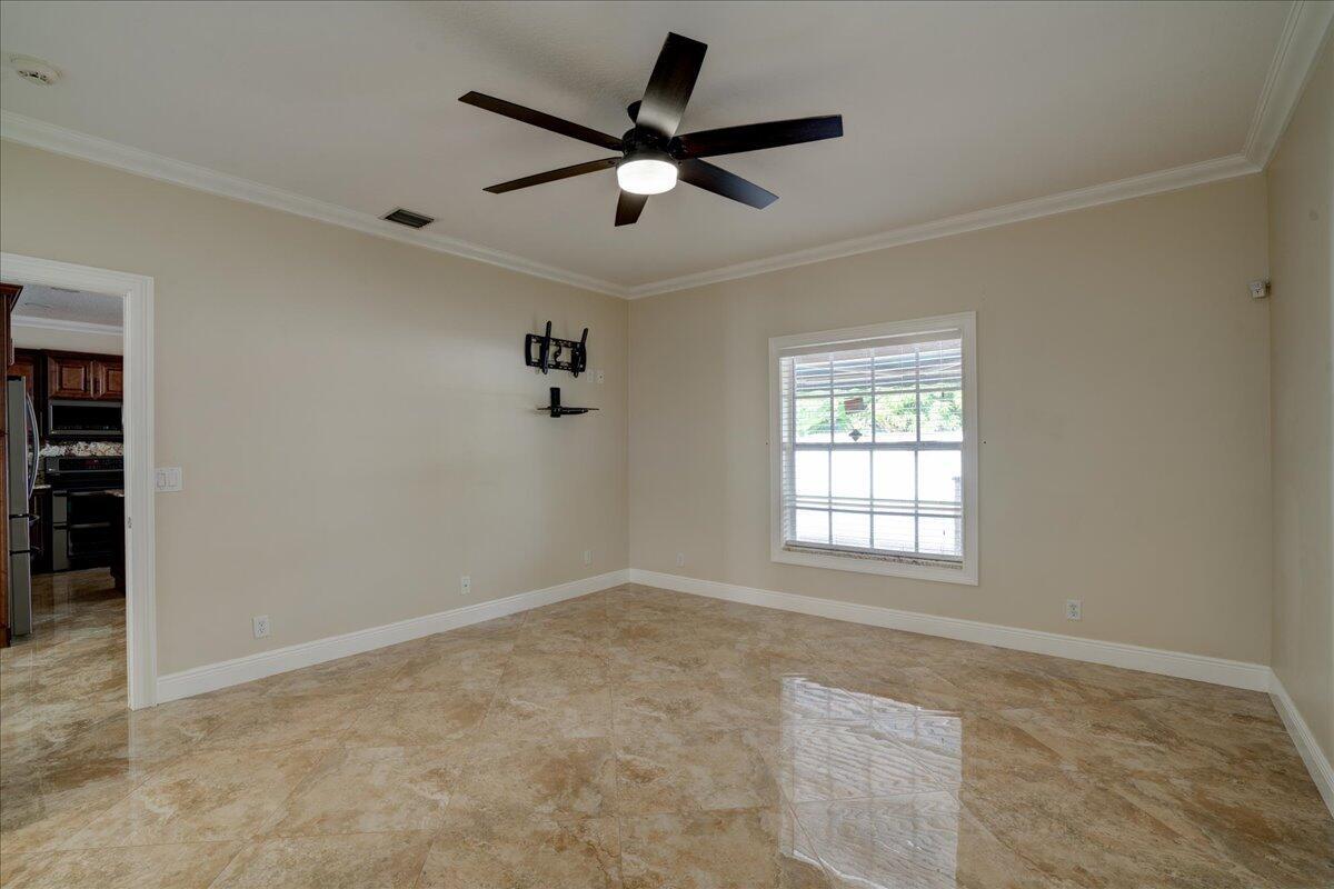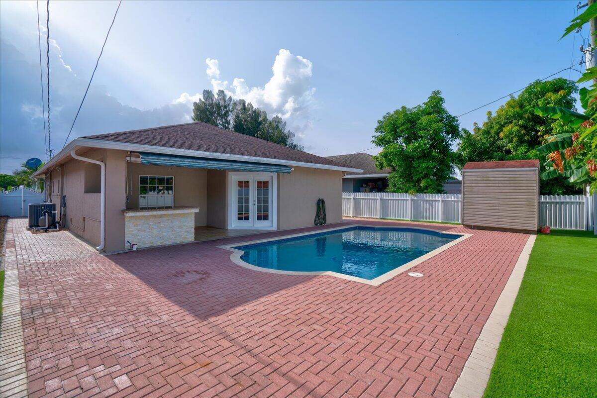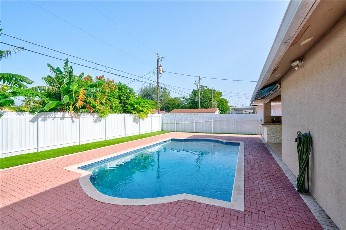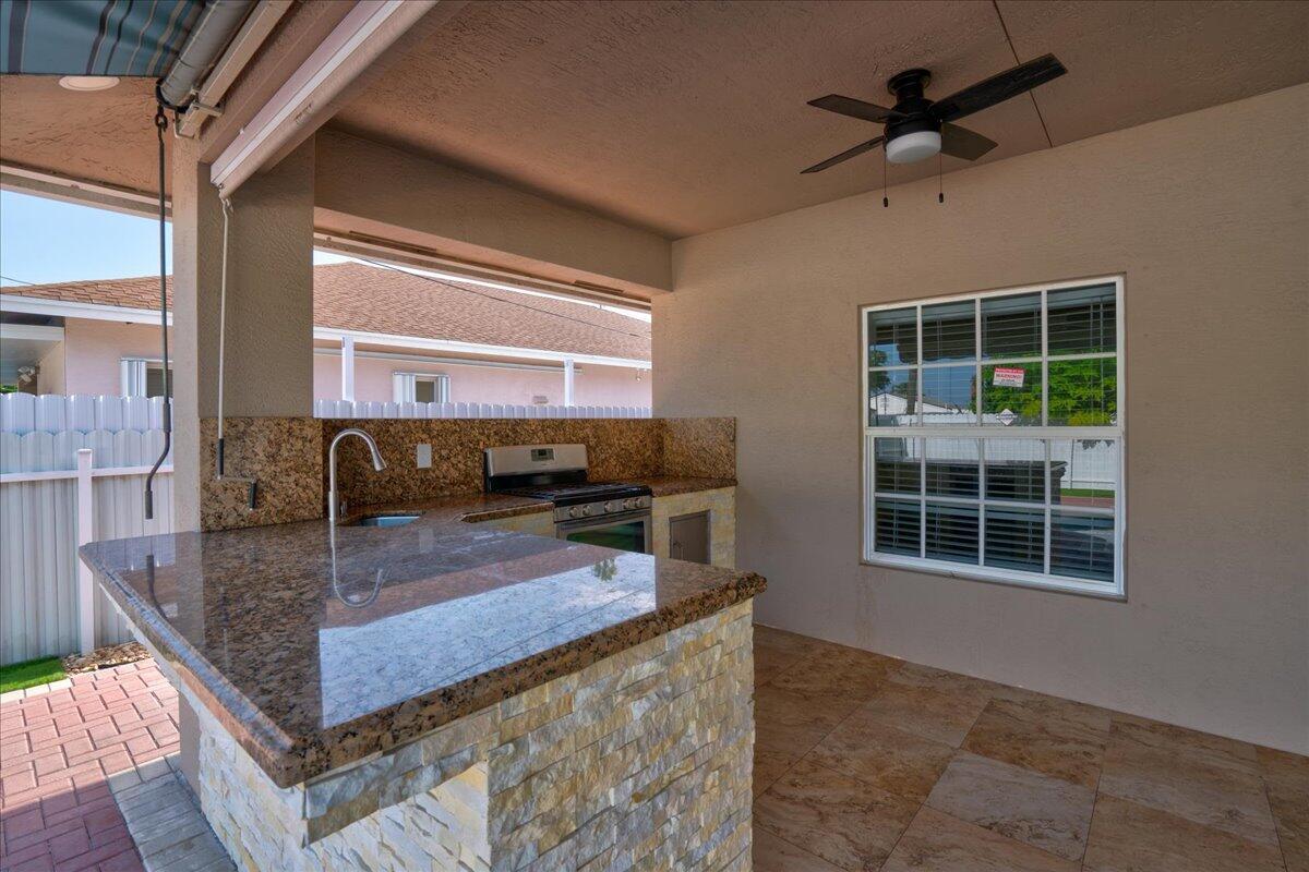 MOVE-IN READY POOL HOME. It features tile throughout, renovated kitchen and bathrooms, kitchen island, crown molding, impact windows and doors, outside kitchen and grill with remote control retracting awning, 2 years old air conditioning and water heater, and appliances are less than 5 years old. Alarm system with motion sensors monitors cameras with ADTIt also features, 2 driveways, the main driveway will accommodate 3 cars and 2 inside the garage for a total of 5 vehicles. The second driveway will accommodate in front of the gate and 4 additional cars inside the gate for an additional 7 vehicles.
