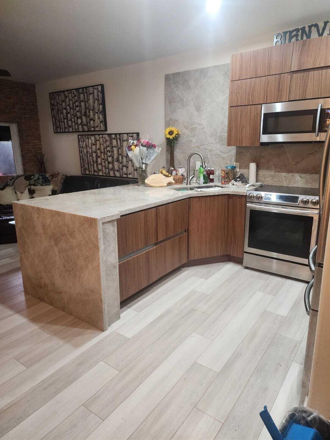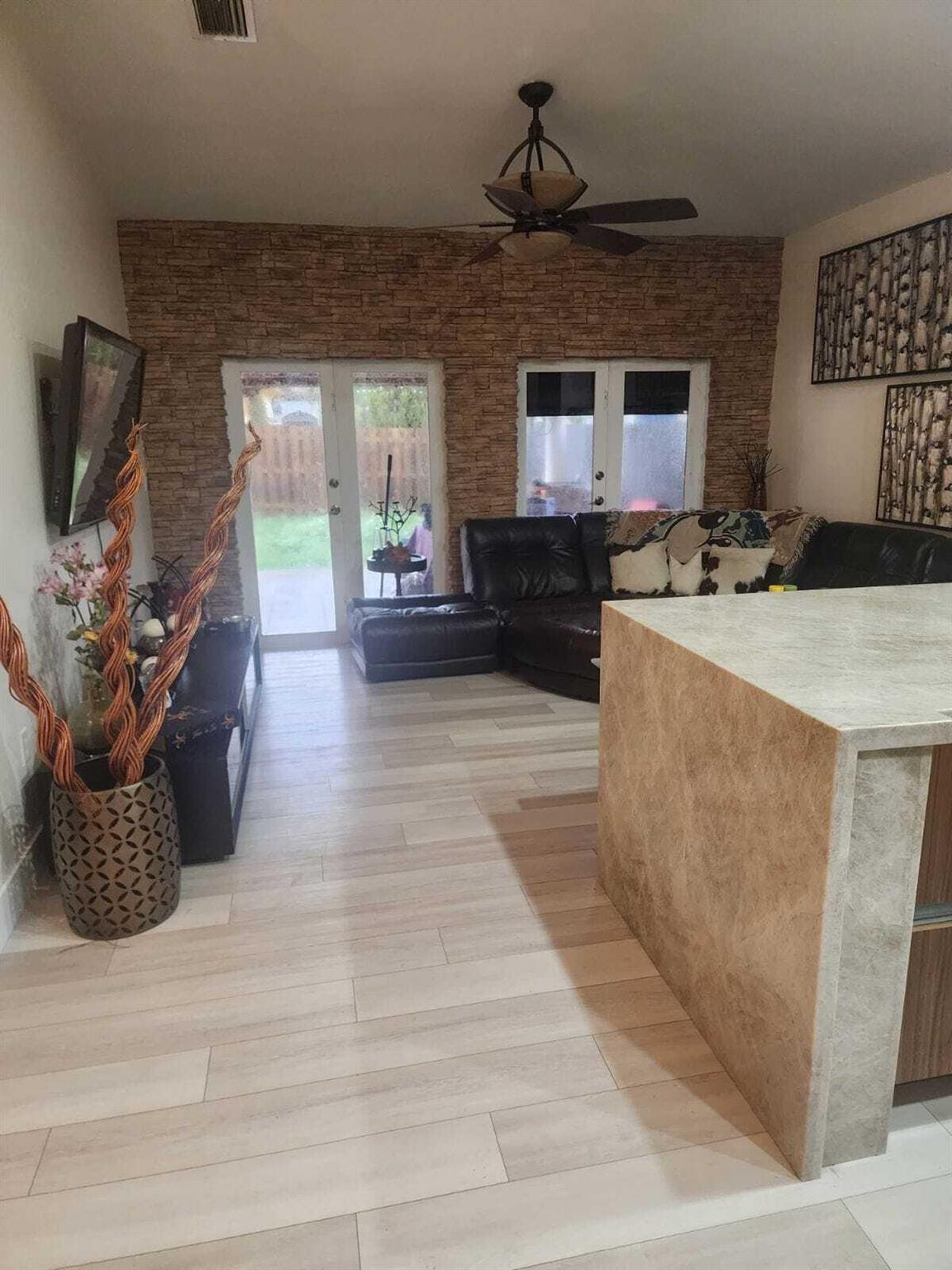 You can't miss this one: NO HOA, Modern kitchen with cascading quartzite counter top, walk-in bathrooms, multi jet showers, waterproof floors. A must see.Motivated Seller.