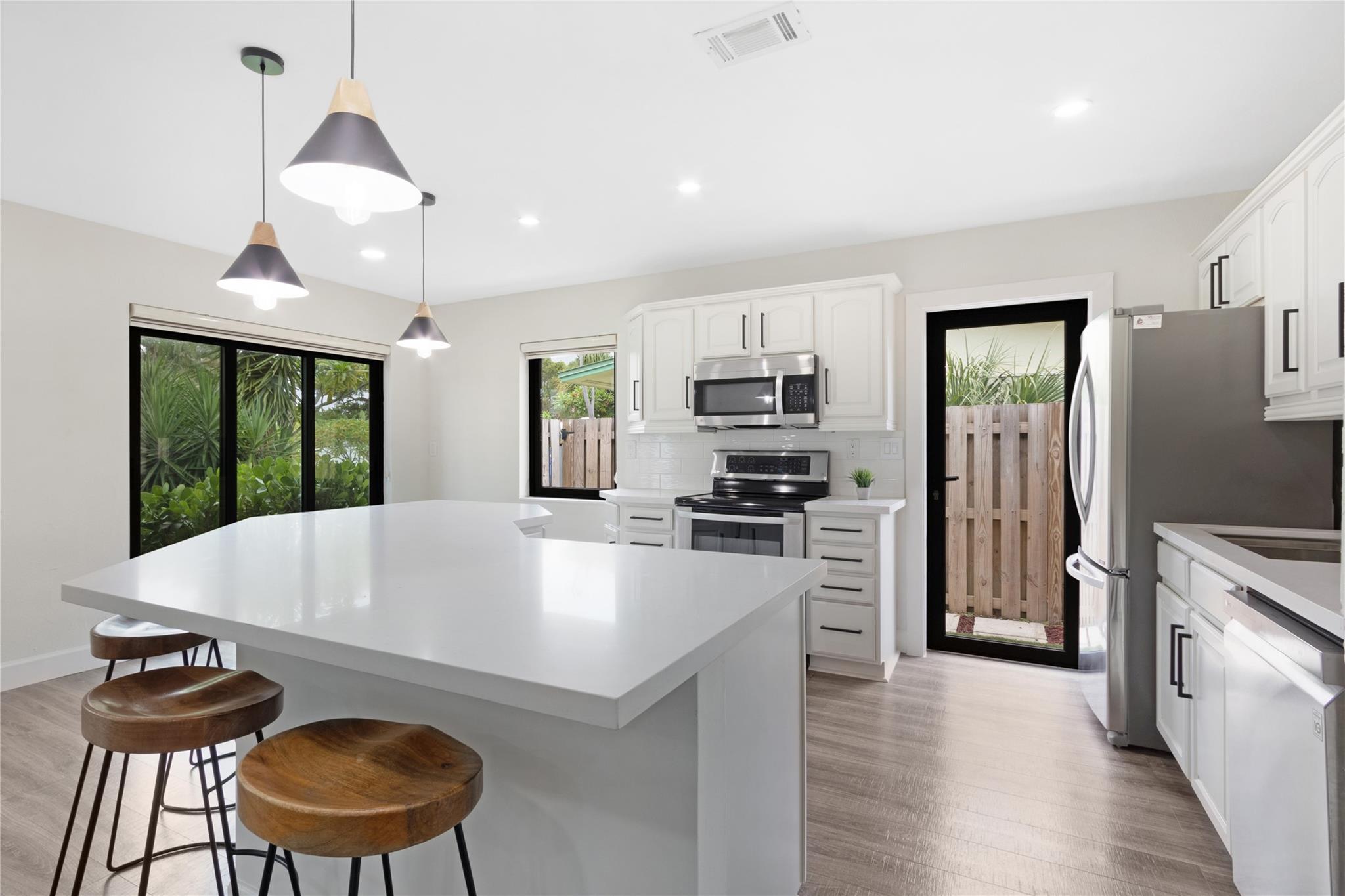 Beautifully updated 4 bedroom 3 bath home in desirable East Pompano. Metal Roof installed in 2023! Updated kitchen with quartz countertops and stainless steel appliances. Beautiful impact windows throughout. Huge turfed backyard with putting green! Plenty of room for a pool! Walk to Publix, beach, and restaurants. You definitely don't want to miss this one!