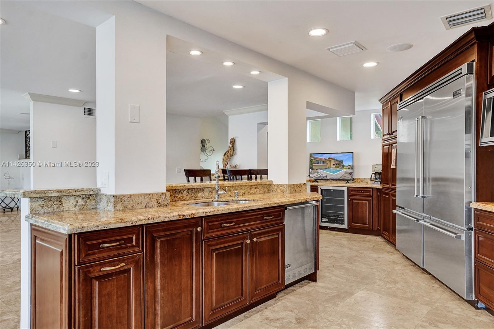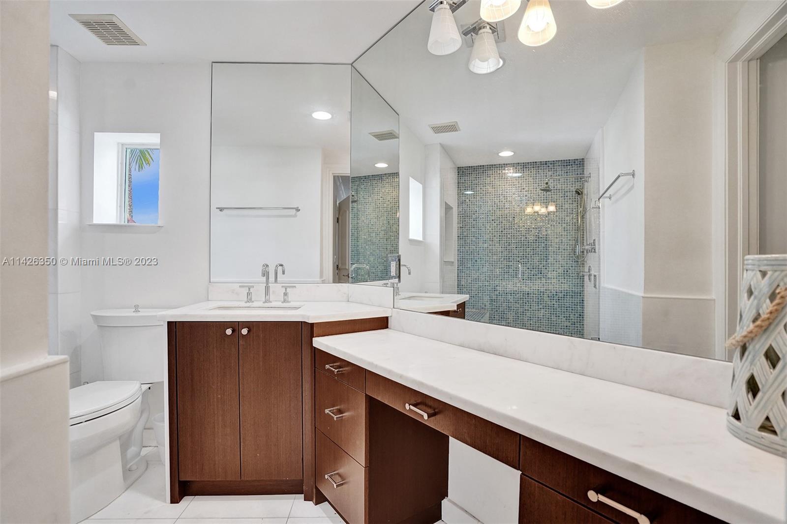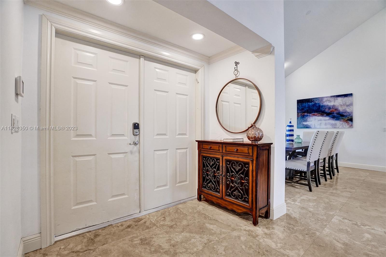 This incredible home is on private cul-de-sac street in a gated community on the water in desirable Eastern Shores. The home is completely renovated & furnished with Marble & wood floors throughout. Master level is in between the first & second story in it's own private wing with balcony overlooking pool, spa & the intercoastal. All bedrooms have own private bathroom with wraparound balcony. Huge kitchen with breakfast counter, stainless steel appliances, wine cooler & gas stove. Backyard is great for outdoor entertainment with heated pool, spa and plenty of room for outdoor activities, including a 65 foot boat dock that can dock a large boat or yacht. The sea wall is 180 feet long all around. NO HOA & just few minutes to beach & Oleta State Park. Short term rentals allowed 3 times yearly