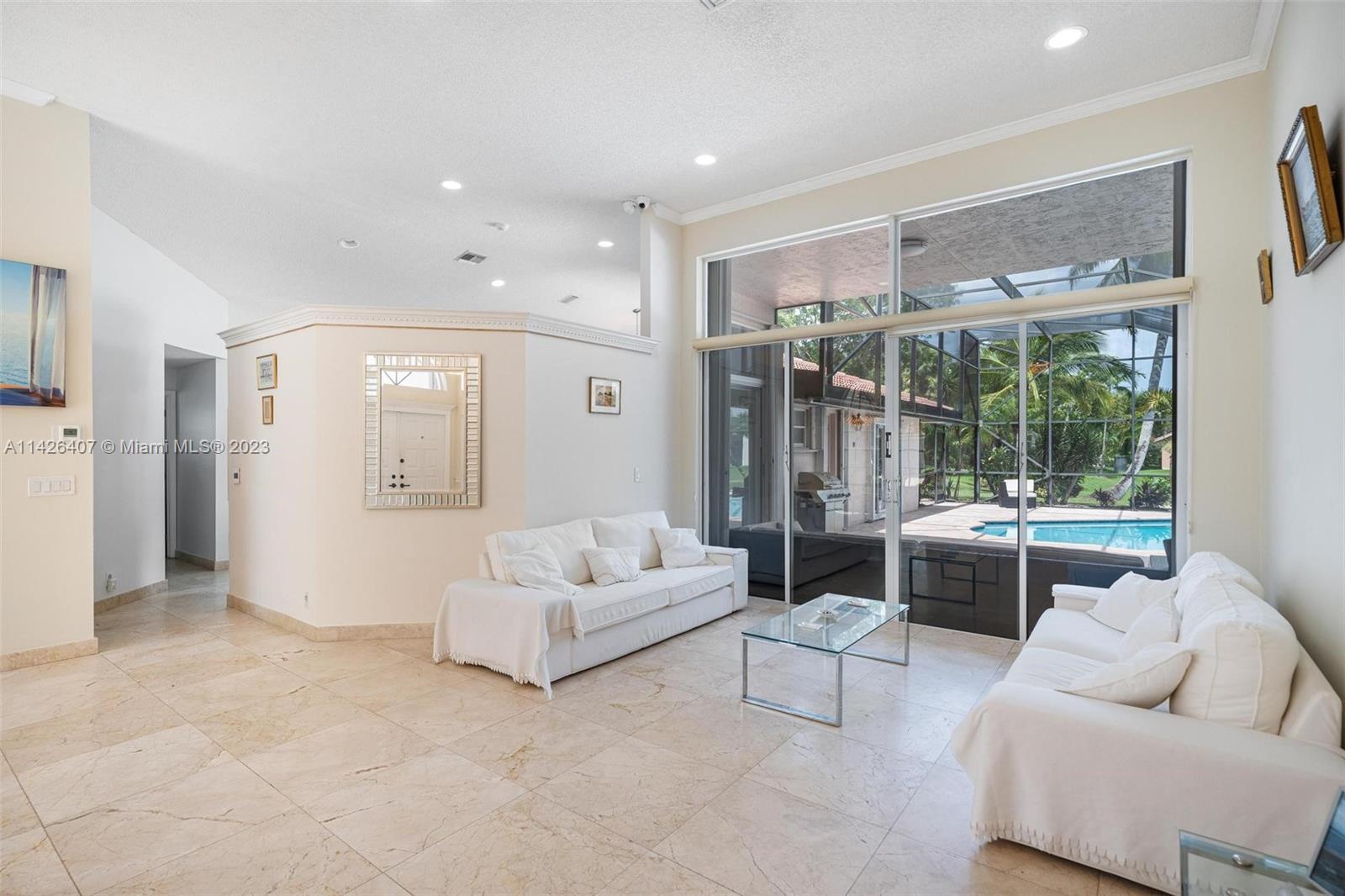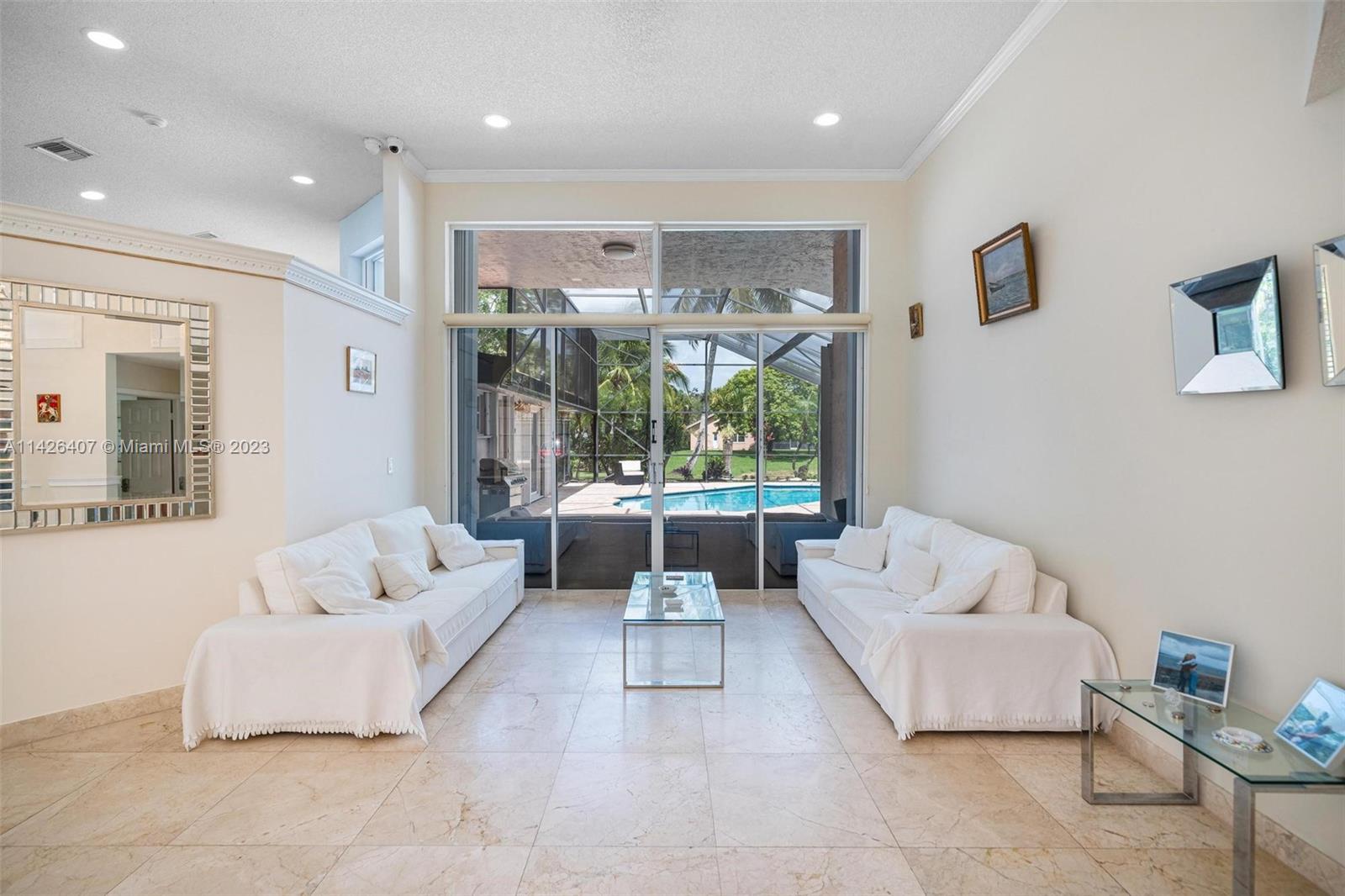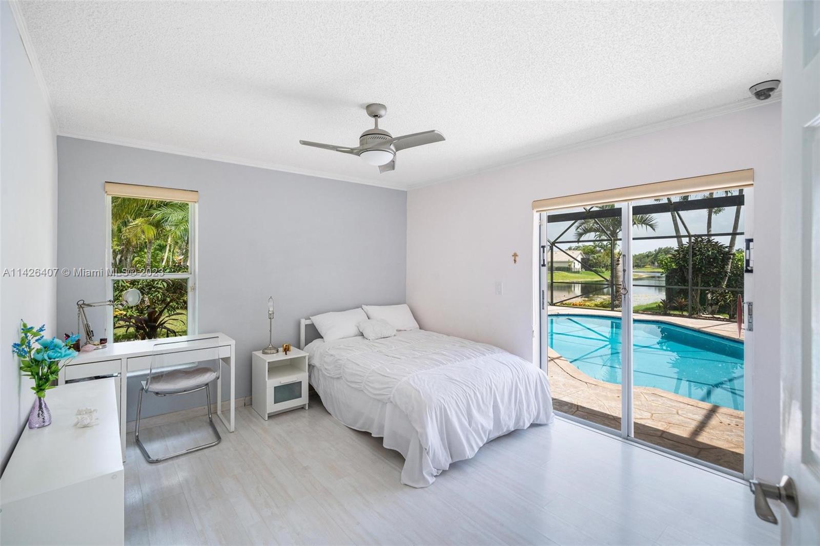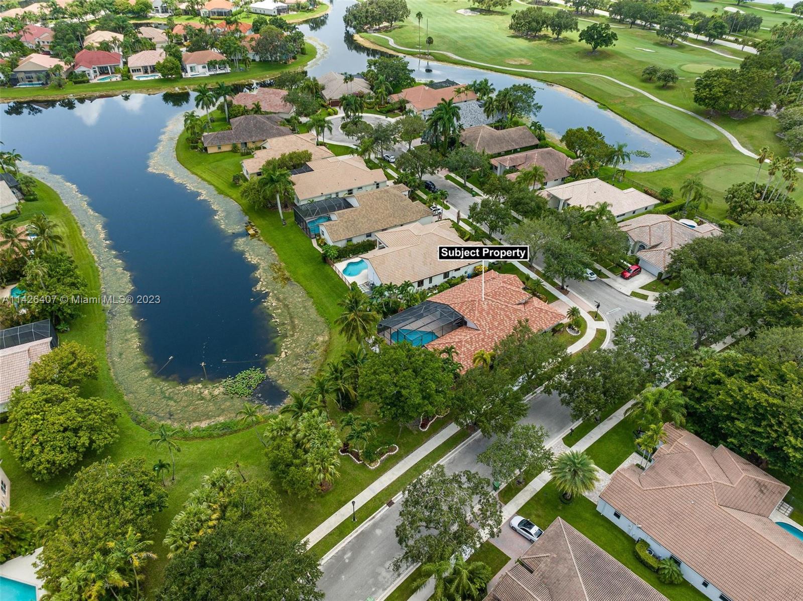 Discover your own private paradise in Weston Hills! This exquisite 5-bedroom, 2.5-bath home sits on an over 1/4 corner lot, providing privacy and a calming atmosphere. With the perfect blend of functionality with its inviting split floor plan and airy open kitchen Step outside to a beautifully landscaped front and backyard, complete with a kids' playground that comes with the house, offering endless fun for your little ones. Unwind by the screened pool and the breathtaking lake views, and as a bonus, a stunning golf view from your haven. Safety is assured with accordion shutters, security camera system in place and the bus stop to top-notch schools just a minute's walk away makes this home an absolute dream for families. Don't miss the chance to call this remarkable oasis yours!