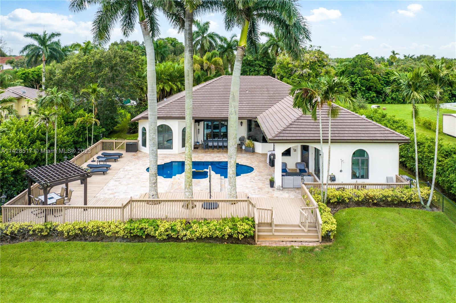 Beautiful Updated 5 Bed 3.5 Bath Pool Home Situated On Appox. An Acre Fenced Cul-De-Sac Lot Located In Prestigious Falcon Estates (A Private Street In Plantation Acres). New Roof 2021. This Custom Newer Construction Home Features Large Open Triple Split Layout W/ (3608 Living Area) Formal Dining, Living & Family Rooms. Impact Windows & Doors. 14Ft Ceilings. New Custom Kitchen 2021 W/Wood Cabinets, Quartzite Counters, High End SS Appliances, Gas Stove, Double Fridge & Freezer, Pull Out Cabinets W/ Electrical, Lighted Walk-In Pantry, Snack Bar & Breakfast Nook. Separate Bar Area. Wine Fridges. Spacious Primary Bedroom W/ Dual Walk-In Closets. En-Suite Bath With Marble Tile, Separate Tub & Dual Head Shower, Bidet And Water Closet. Amazing Views Of Newly Renovated Pool And Sun Shelf. Low HOA