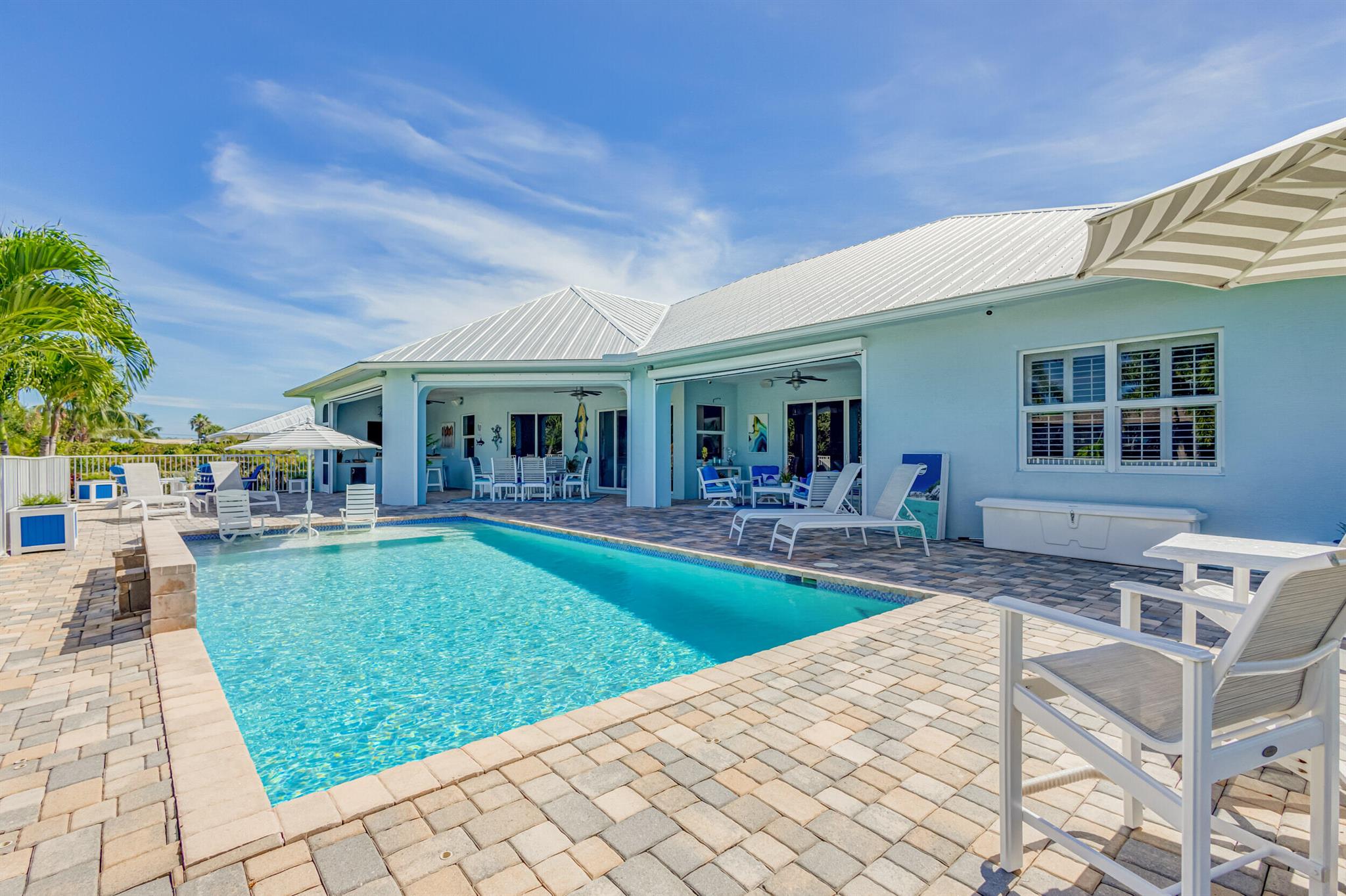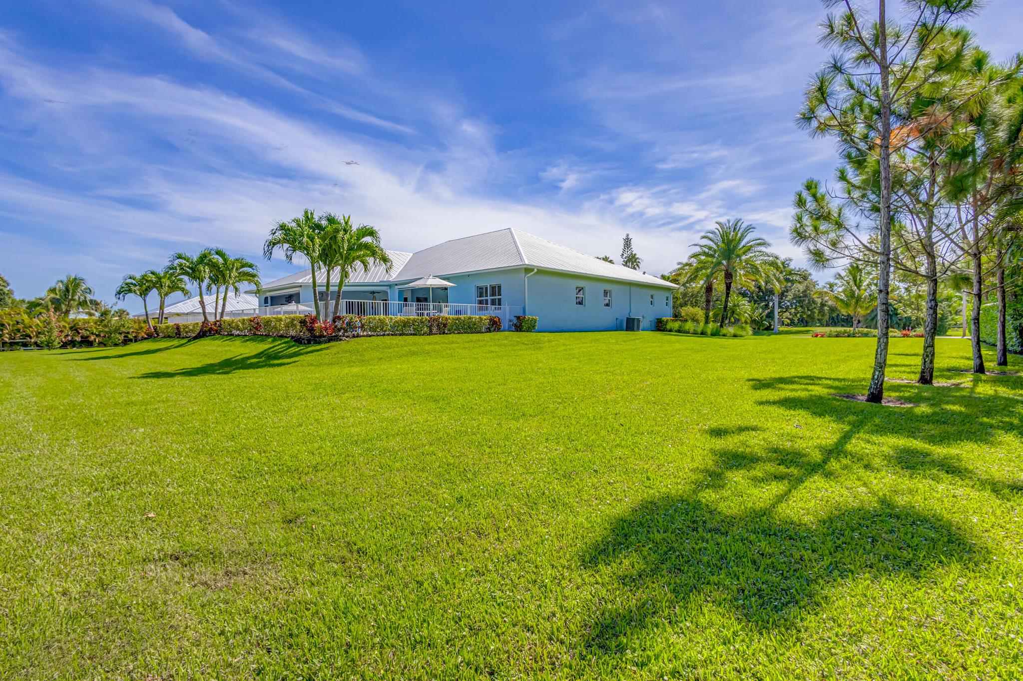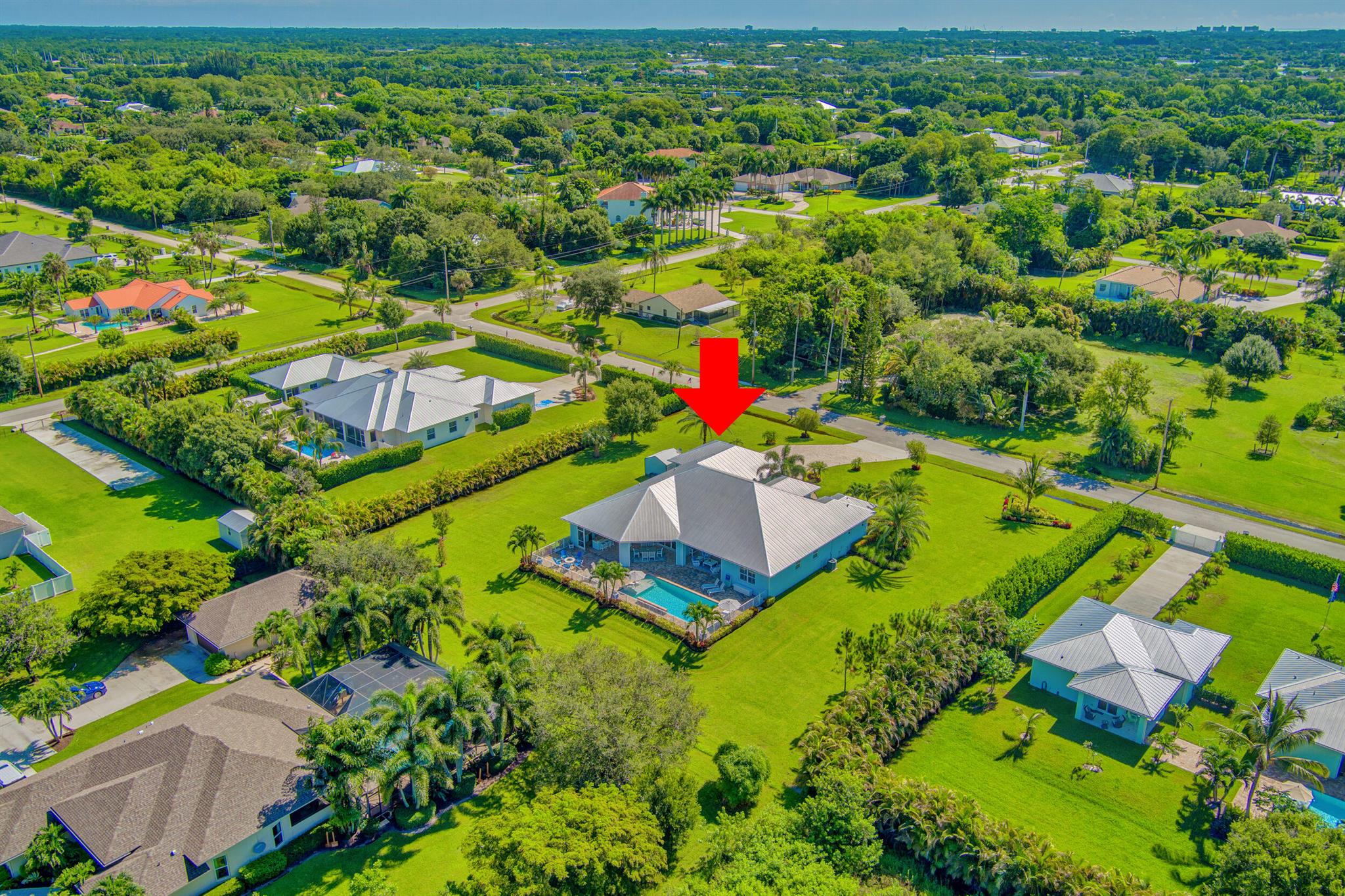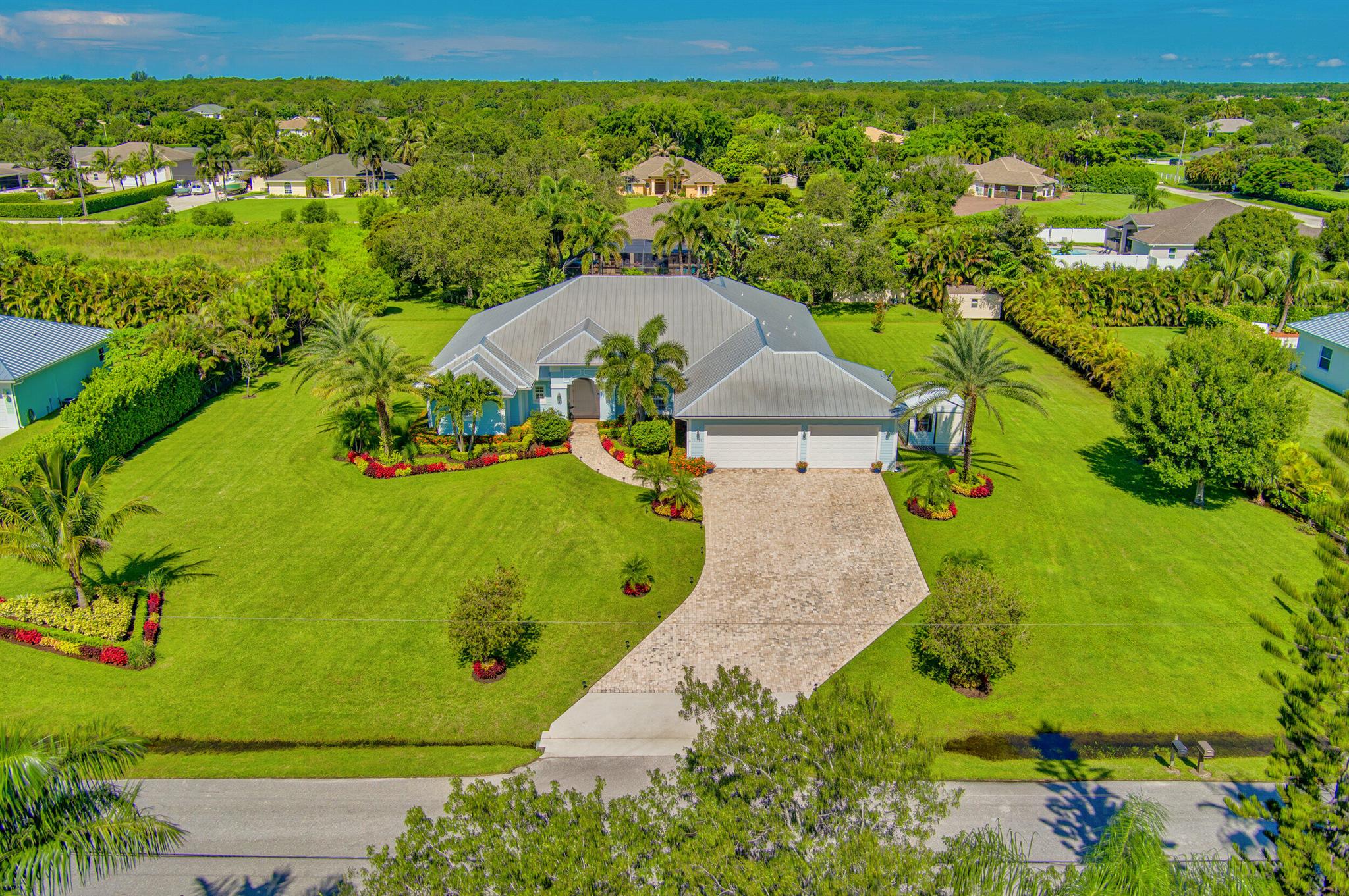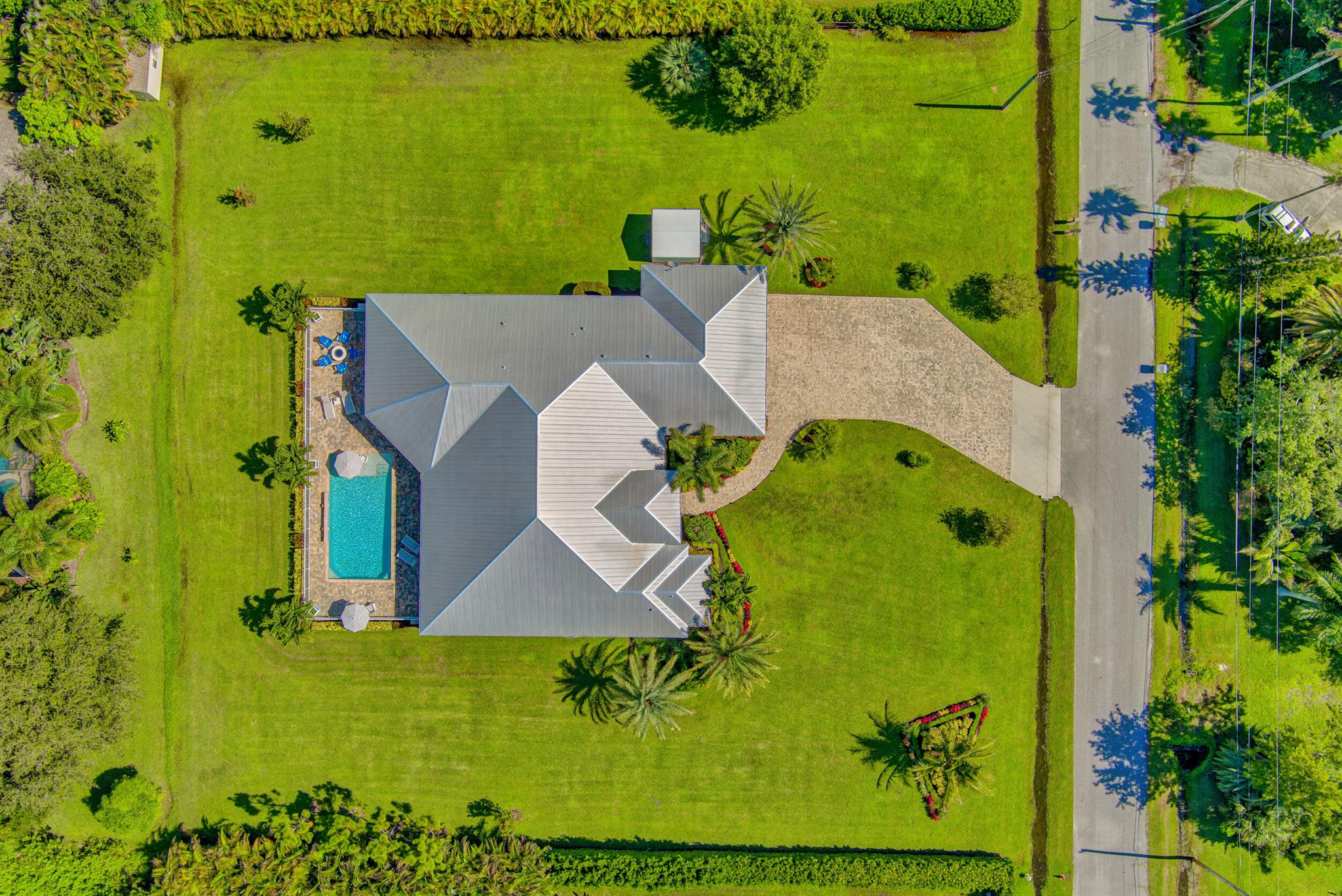 Welcome to your prefect Palm Beach Country Estates home! Built in 2016 on 1.15 acres of high and dry, pristine tropical paradise, this pool home offers 4 bedrooms, 3.5 baths, and over 3800 sqft of elegant Key West style with a stunning outdoor living space! Featuring volume ceilings, full impact glass throughout, an attractive open floor plan and custom plantation shutters throughout. The double entry doors lead to a foyer that views through a sprawling living room onto the patio and pool. Enjoy the tropical Florida outdoor lifestyle with this showstopper backyard! The custom pool features a sunshelf, extended paver patio, and multiple conversation areas to host the perfect sunset soiree. Electric roll down screens protect the patio and summer kitchen. The expansive primary suite features