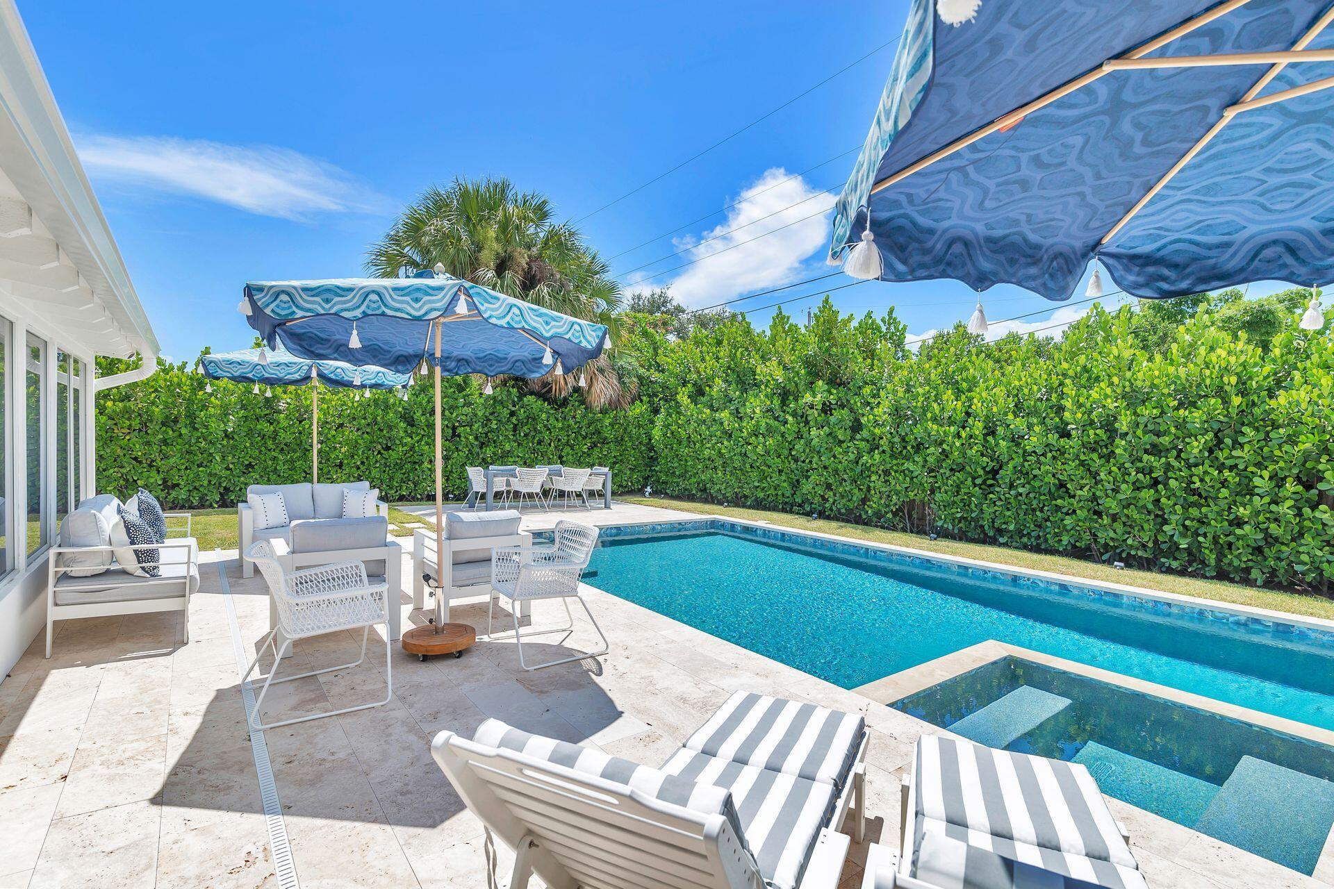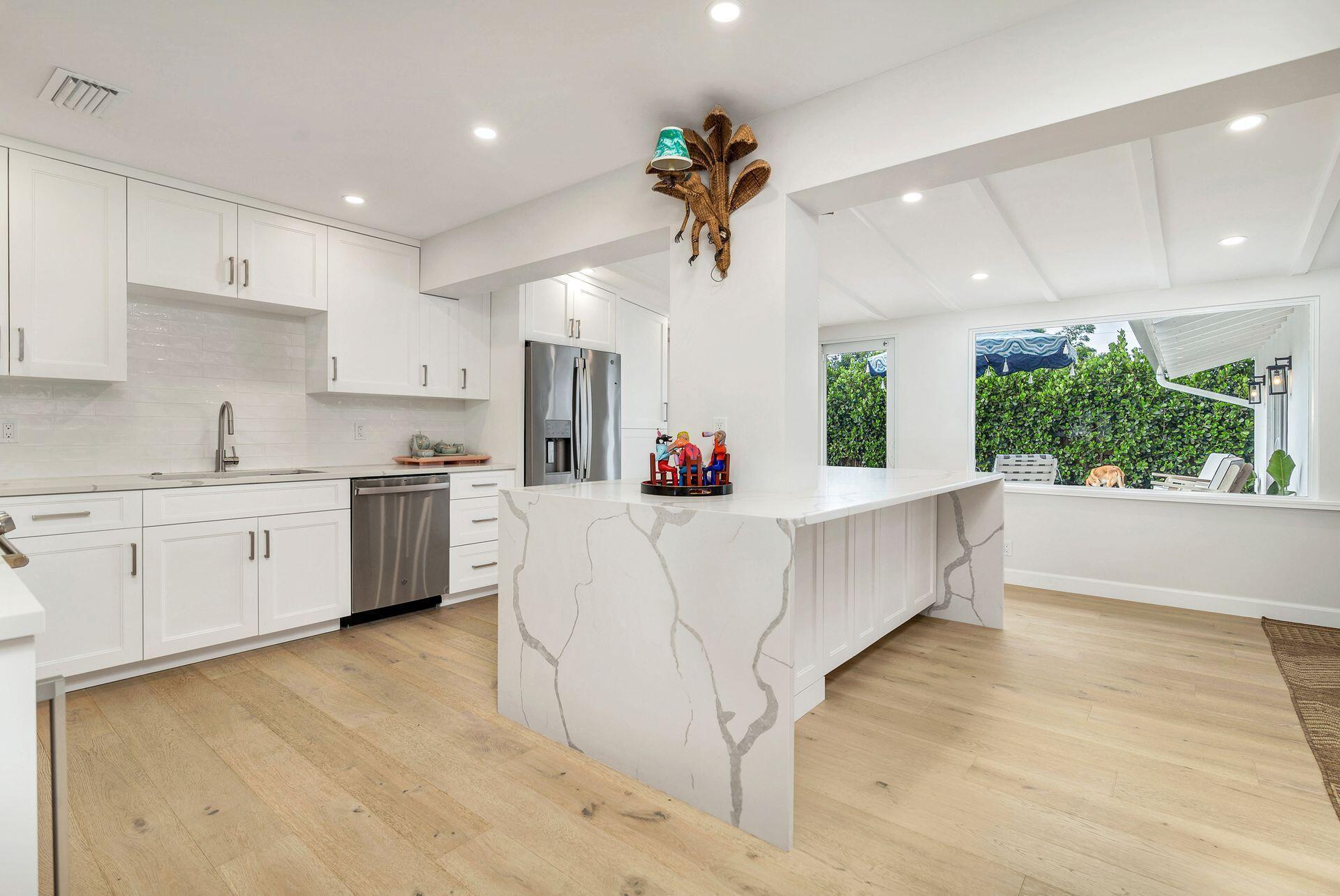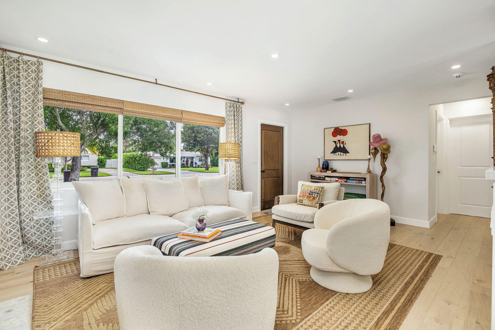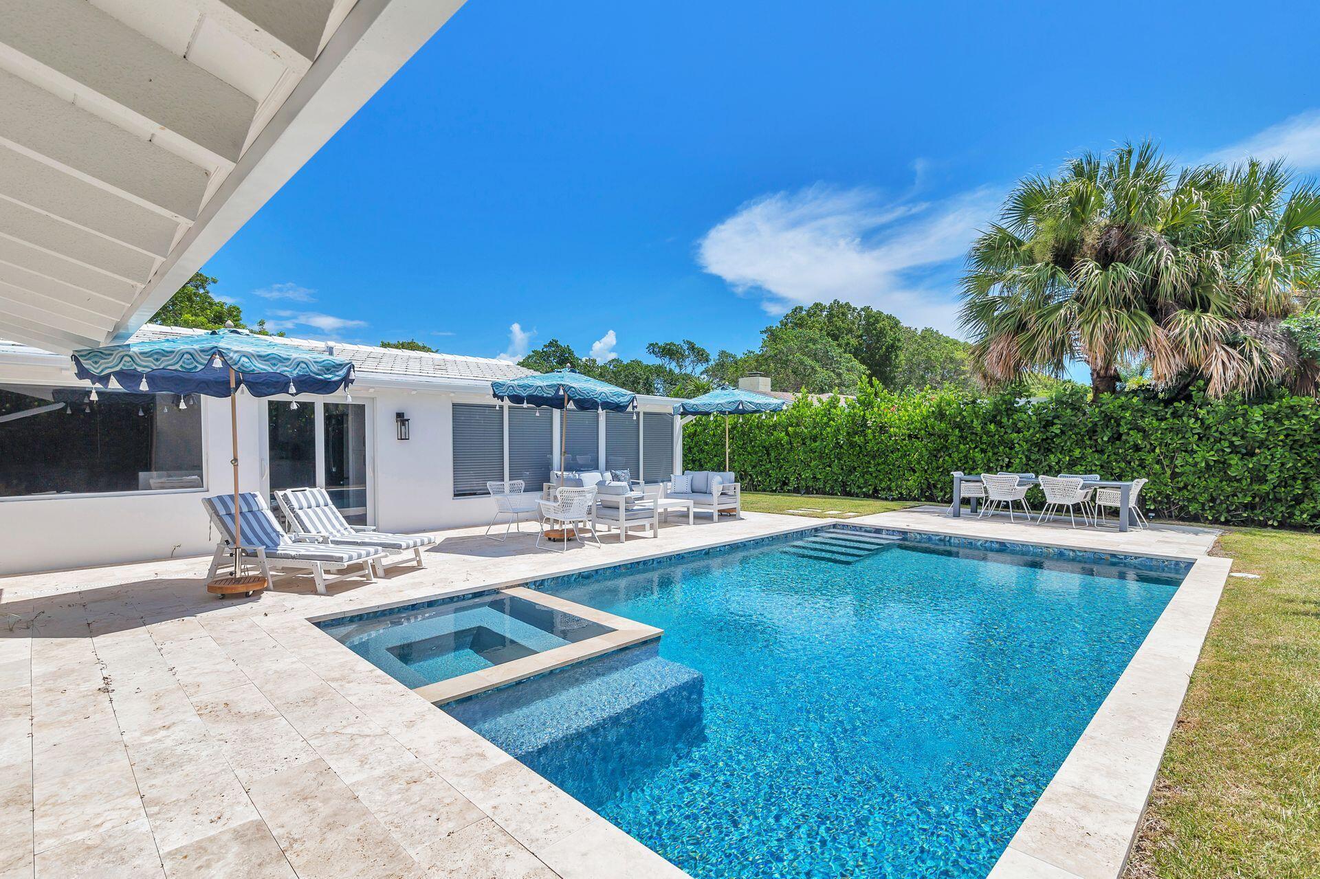 Charming renovated 3 br. + den home. Complete renovation in 2021 and 2022, including all impact windows, French Oak Floors, beamed ceiling, custom cabinetry,quartz counter tops, kitchen island, microwave drawer, stainless steel appliances, wine fridge, gas cooktop. Brand new pool in 2023 with limestone decking, spa. Natural gas linebrought to the house in 2022 with additional remodeling removing an interior wall to kitchen, creating a beautiful open floor plan between kitchen, living, dining room, gas fireplace, gasstove and gas pool heater.. Beautiful views of the pool and deck area from kitchen & dining room, den & living room. Spacious front yard too! 1 car garage.