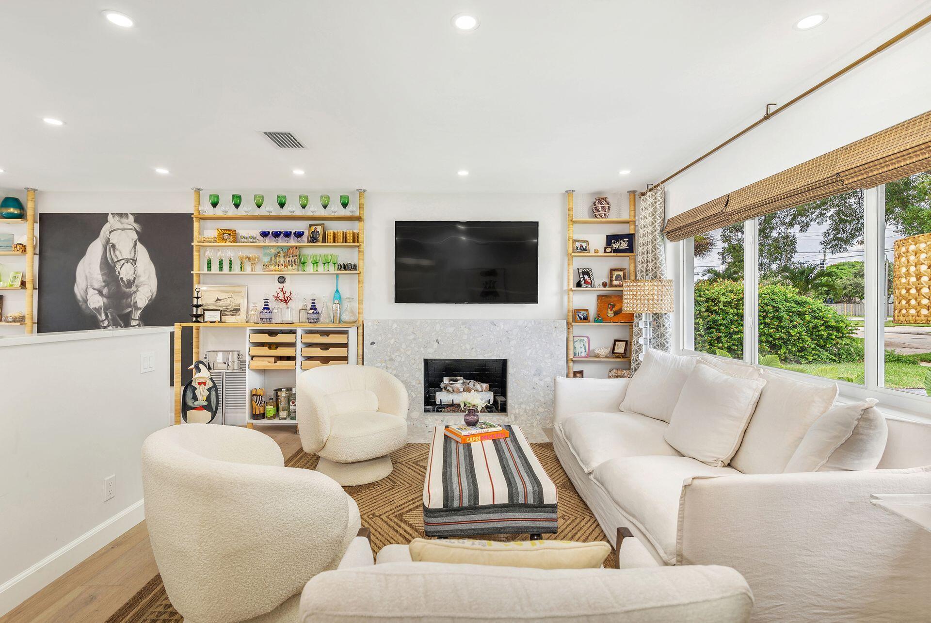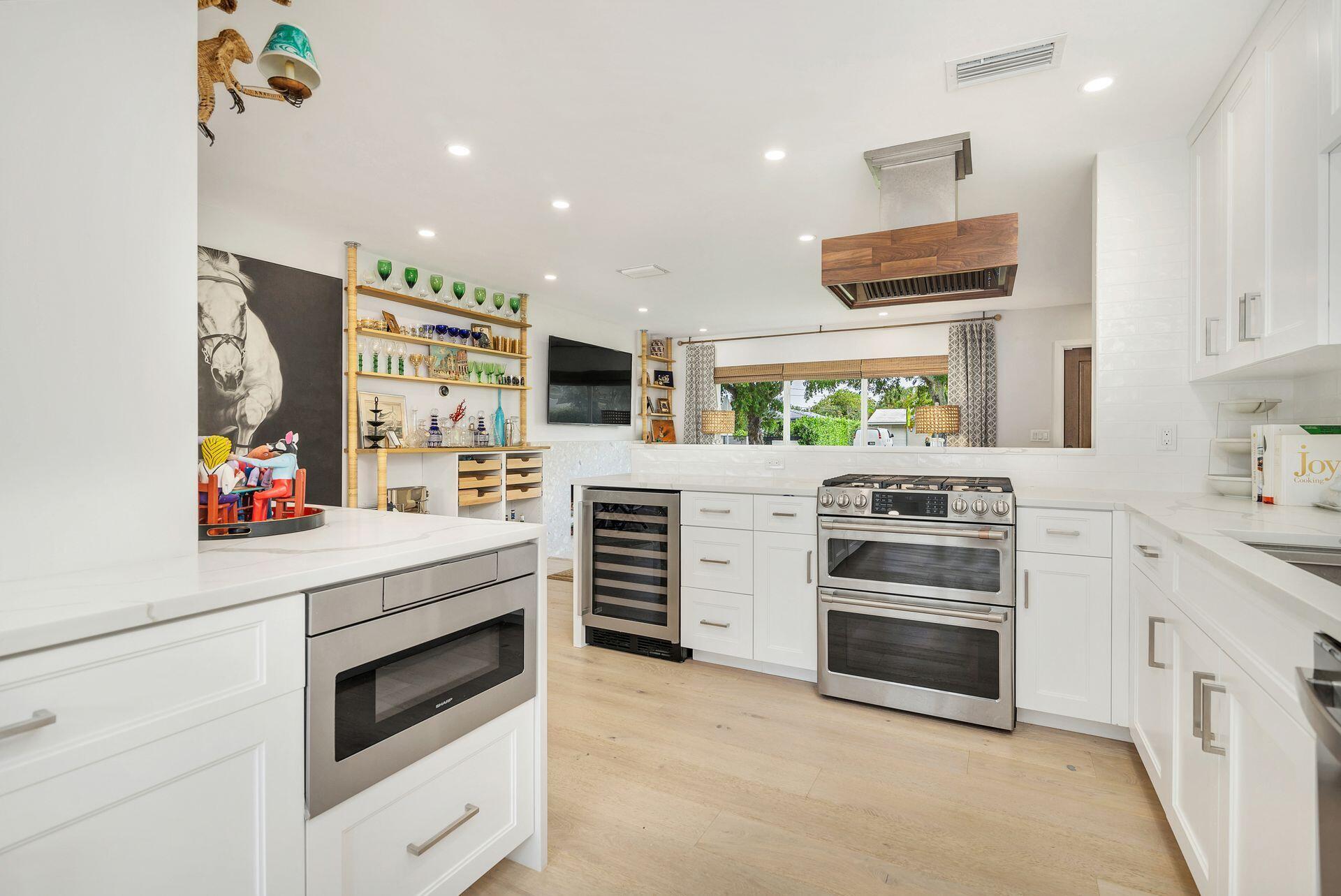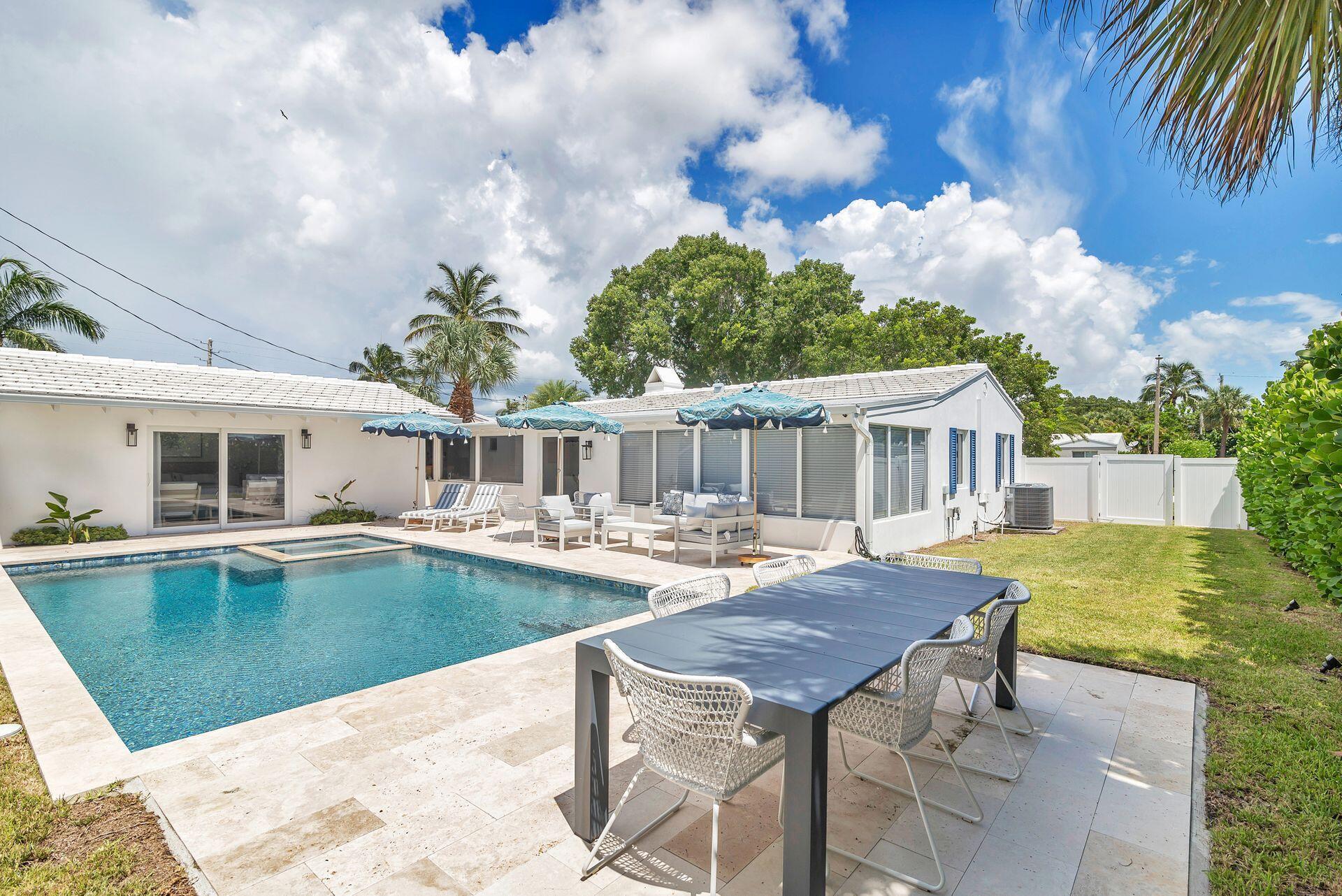 Charming renovated 3 br. + den home. Complete renovation in 2021 and 2022, including all impact windows, French Oak Floors, beamed ceiling, custom cabinetry,quartz counter tops, kitchen island, microwave drawer, stainless steel appliances, wine fridge, gas cooktop. Brand new pool in 2023 with limestone decking, spa. Natural gas linebrought to the house in 2022 with additional remodeling removing an interior wall to kitchen, creating a beautiful open floor plan between kitchen, living, dining room, gas fireplace, gasstove and gas pool heater.. Beautiful views of the pool and deck area from kitchen & dining room, den & living room. Spacious front yard too! 1 car garage.