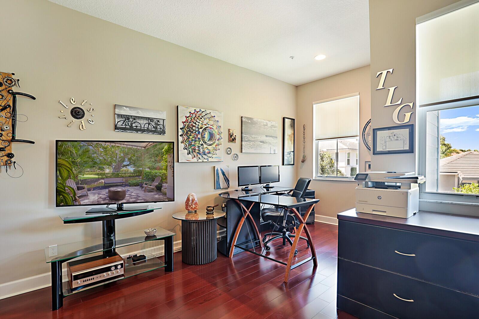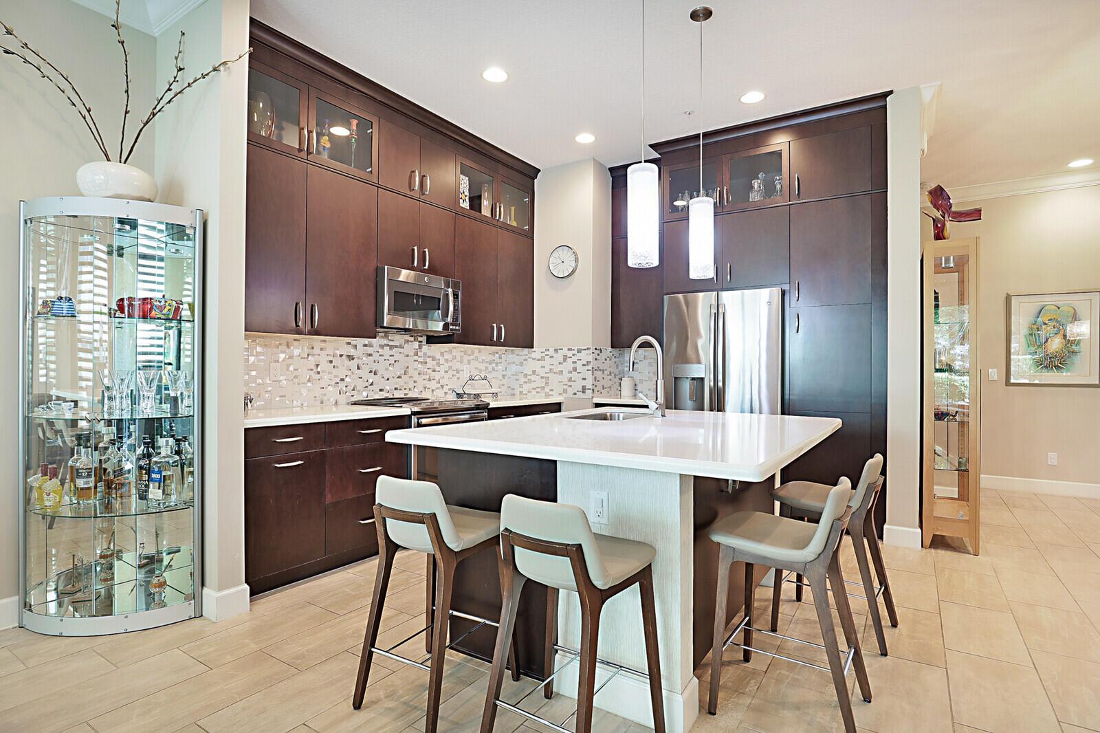 Mother nature is calling! Immaculate townhome in the newest Boca Pointe village of Pointe 100 has the most peaceful expanded patio/backyard with birds, butterflies + a canal behind with turtles & fish. Boca Pointe is an all ages, NON MANDATORY country club community w/all levels of membership available but NOT REQUIRED. This ''better than new'' home has many upgrades including the tile & wood flooring, kitchen cabinets & quartz counters, GE Profile stainless steel appliances, light fixtures, Jerusalem stone wall treatment surrounding the TV, crown molding +Brazilian Cherry wood floors on staircase & entire 2nd level. Upstairs Primary Suite has crown molding, customized walk-in closet, upgraded bathroom w/Toto commode/bidet, 2 vanities with quartz counters & beautiful water view.