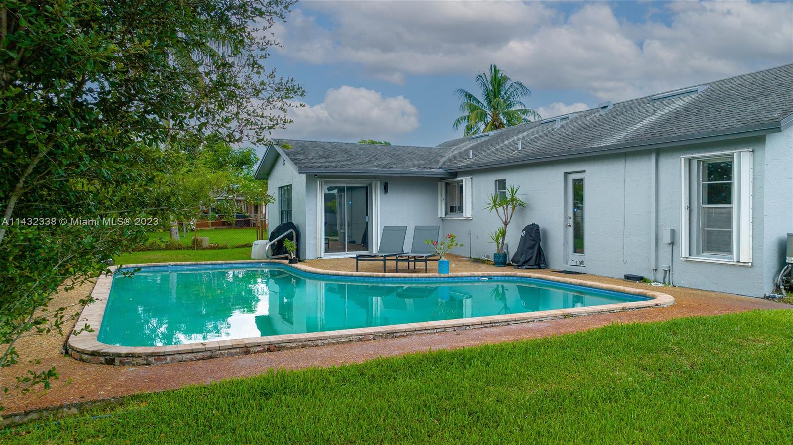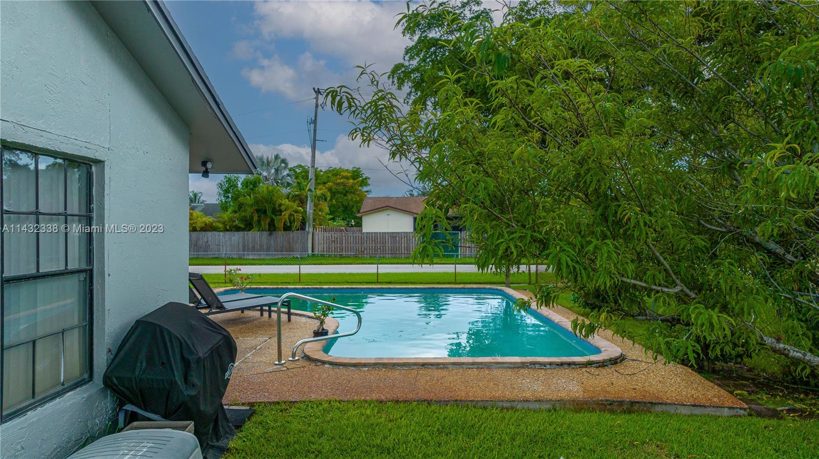 Lovely 3/2 pool home with 2 car garage located on a corner lot in Sunrise. This home boasts new white, shaker kitchen cabinets, quartz countertops, stainless steel appliances, new vinyl flooring, accordion shutters, freshly painted exterior and plenty of natural light. Cool off in the pool and relax in the spacious yard. You can also pick mangos, peaches and cherries from your trees! Added bonus....NO HOA!