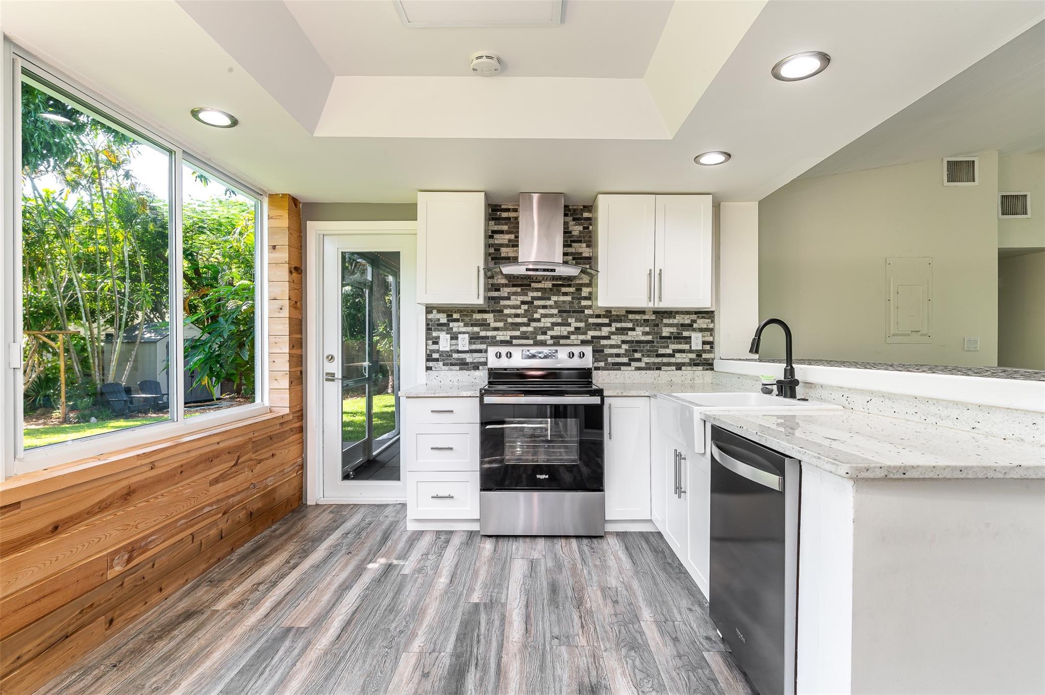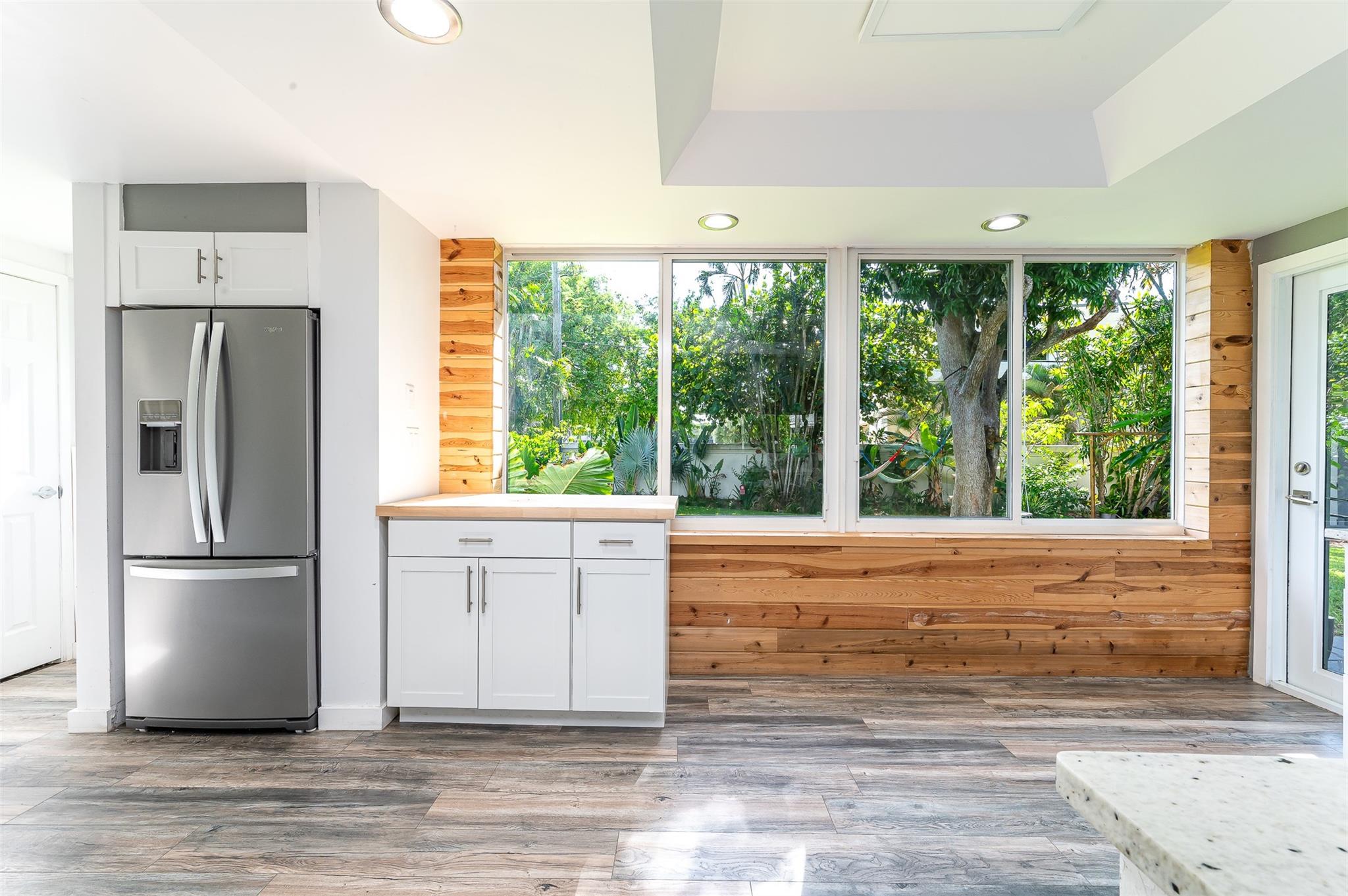 Your very own secret hideaway in the heart of downtown Boca! This 2/2 has been tastefully renovated and is ready to make it your own. New modern appliances and granite countertops provide stylish entertainment space. New impact windows and doors throughout. Roof , water heater and AC replaced 2017, with AC coils replaced 2023. All new plugs and light switches throughout as well. 2023 permitted patio enclosure allows enjoyment of the backyard with mature vegetation including two large mango trees. Enjoy mango daiquiris year round! There is a shed, plenty of space for a pool and landscape lighting and fountains throughout the property. 10 min walk to Mizner, Brightline station,and 1.5 mi to the beach!! Rare opportunity to own a slice of paradise in east Boca with all A rated schools.