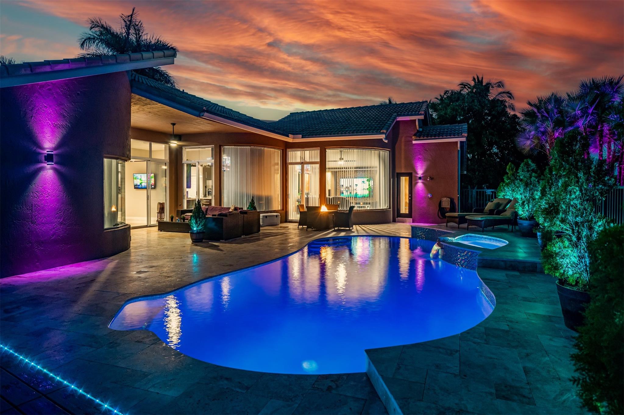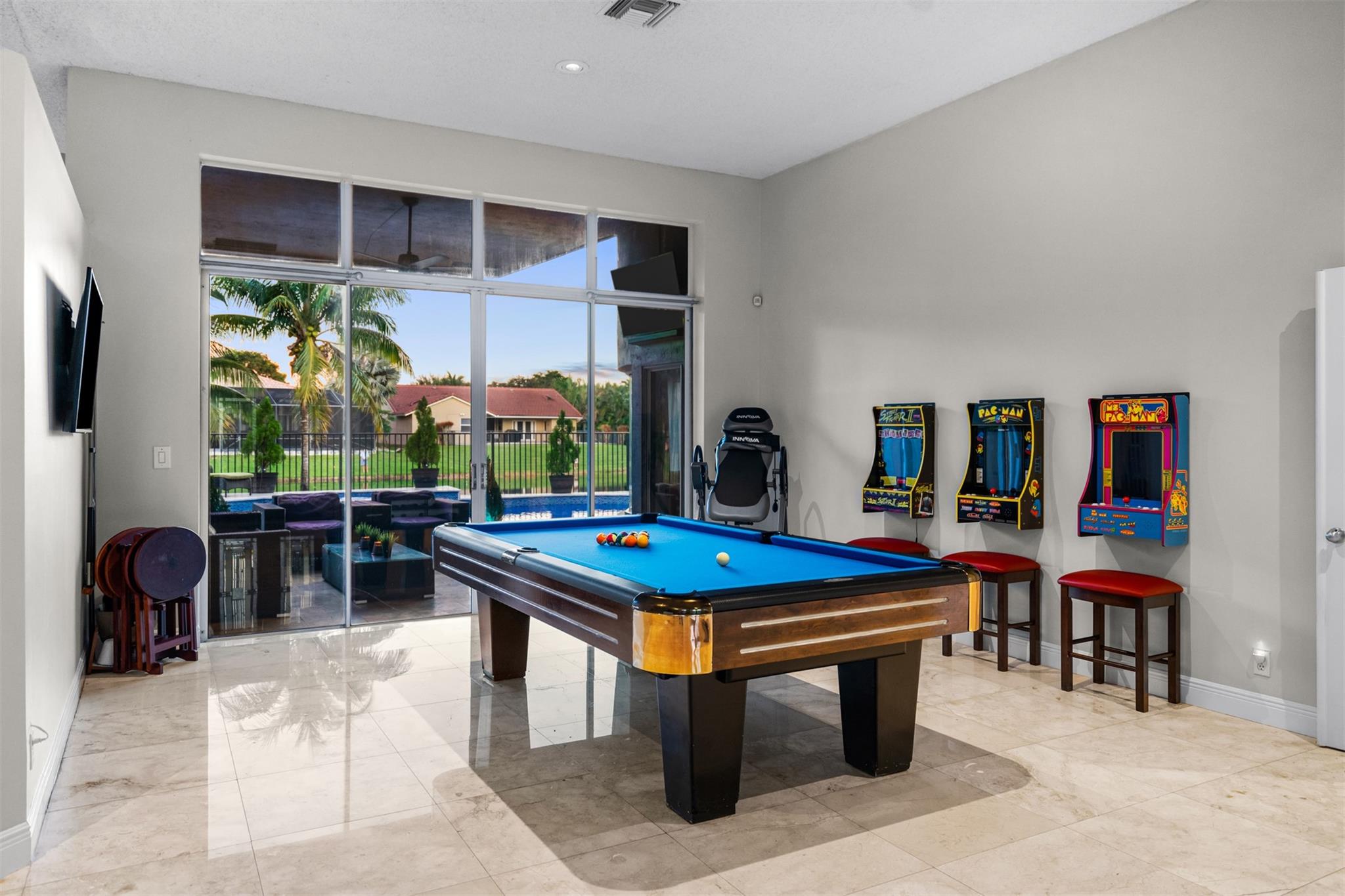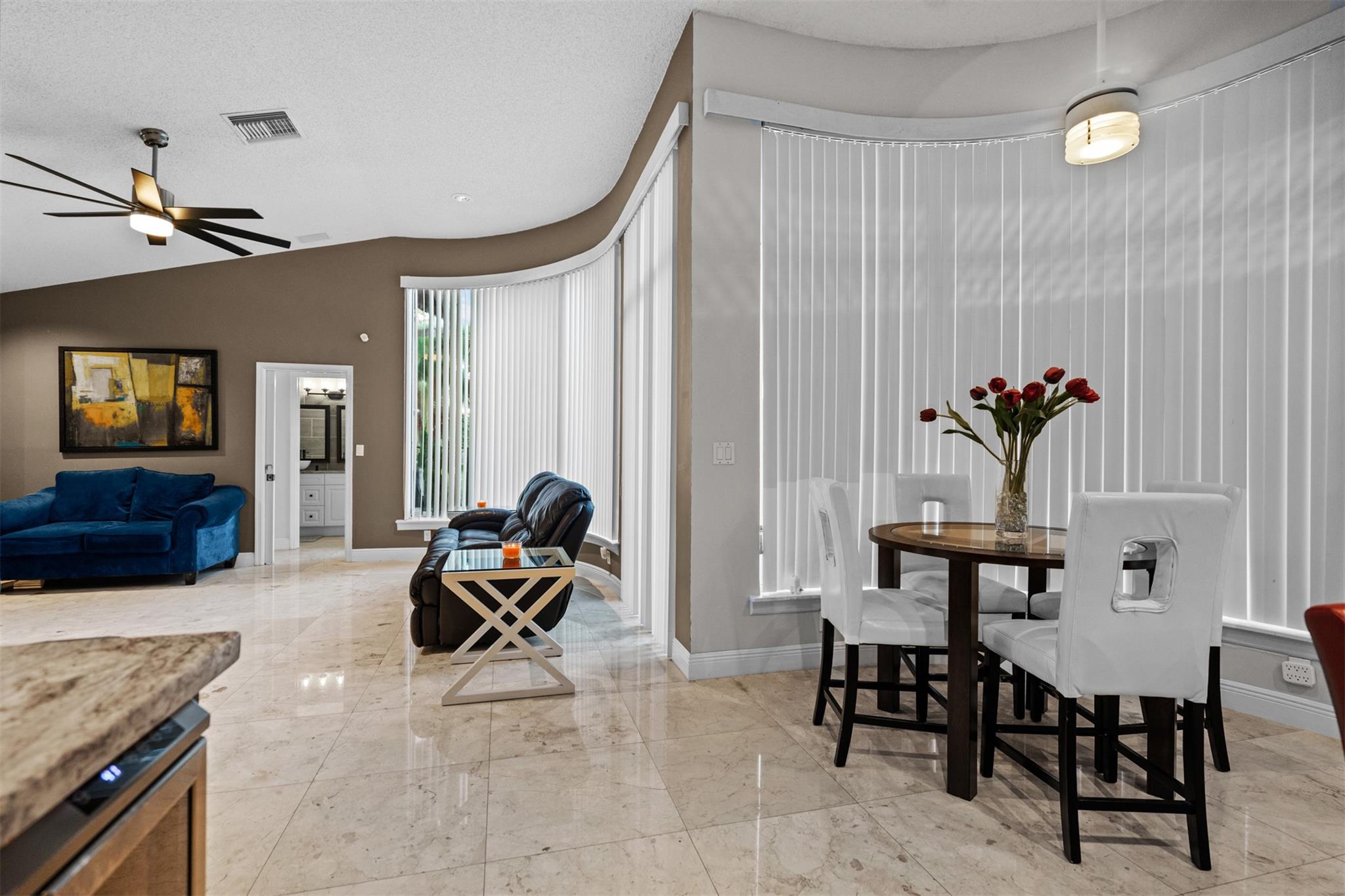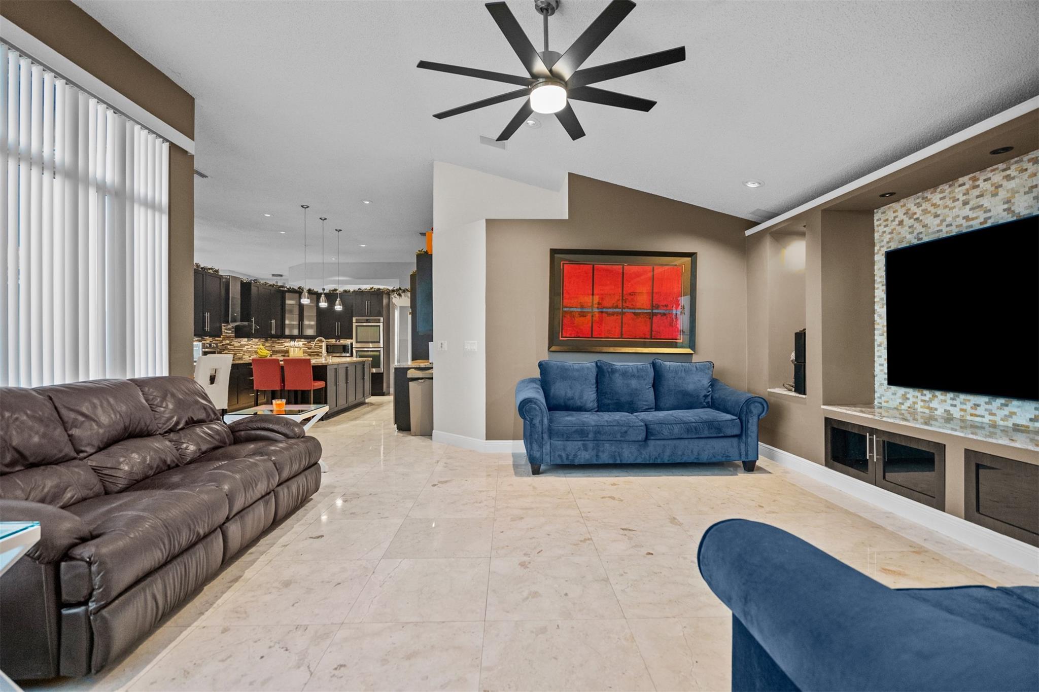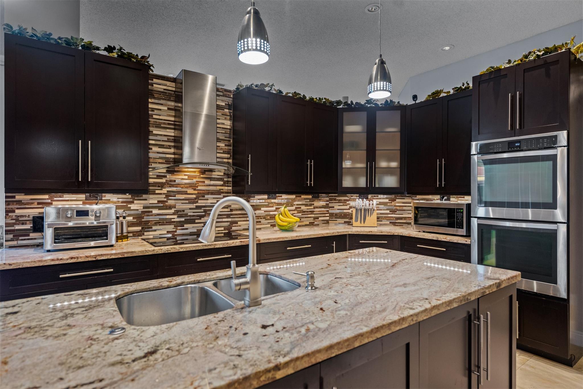 Breathtaking 5-bedroom, 3-bath single-family home located on a cul-de-sac in Brookside Grove. When you arrive at the property, you will notice the paved circular driveway, professional landscape and lighting, stone veneer siding, and a koi pond right by the entrance. This 1-story residence offers a triple split floor plan, formal dining room, living room, spacious family room, and an eating area. There is 24” marble flooring in social areas and laminate flooring in all bedrooms. The kitchen has been updated with s/s appliances, a wine fridge, granite countertops, double oven, and stunning tiled backsplash. In the last year, the proud owner of this home has installed impact doors and windows throughout, as well as a fence and deck.