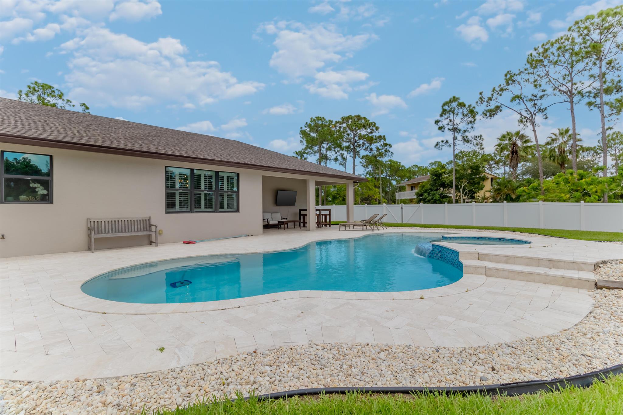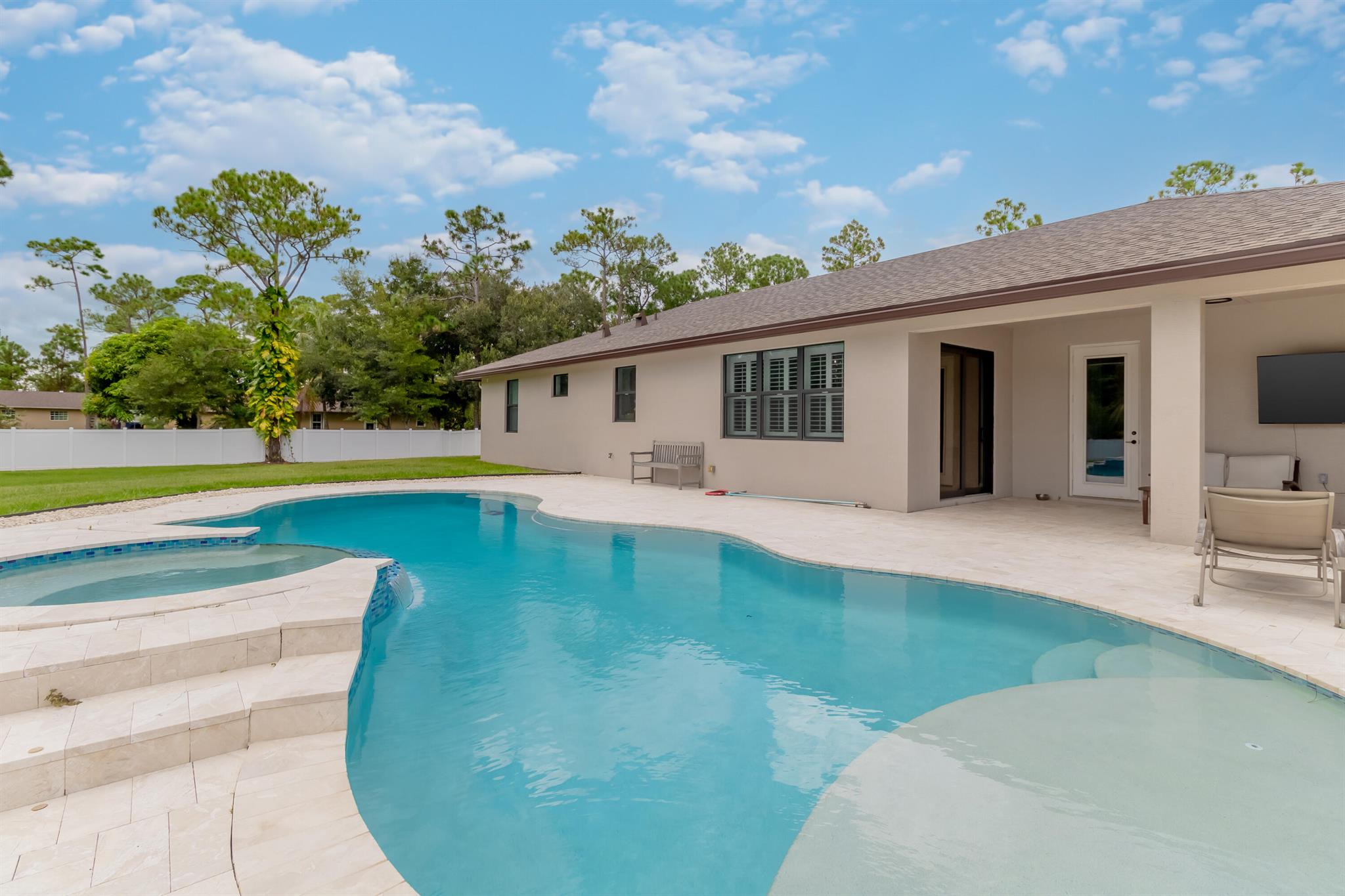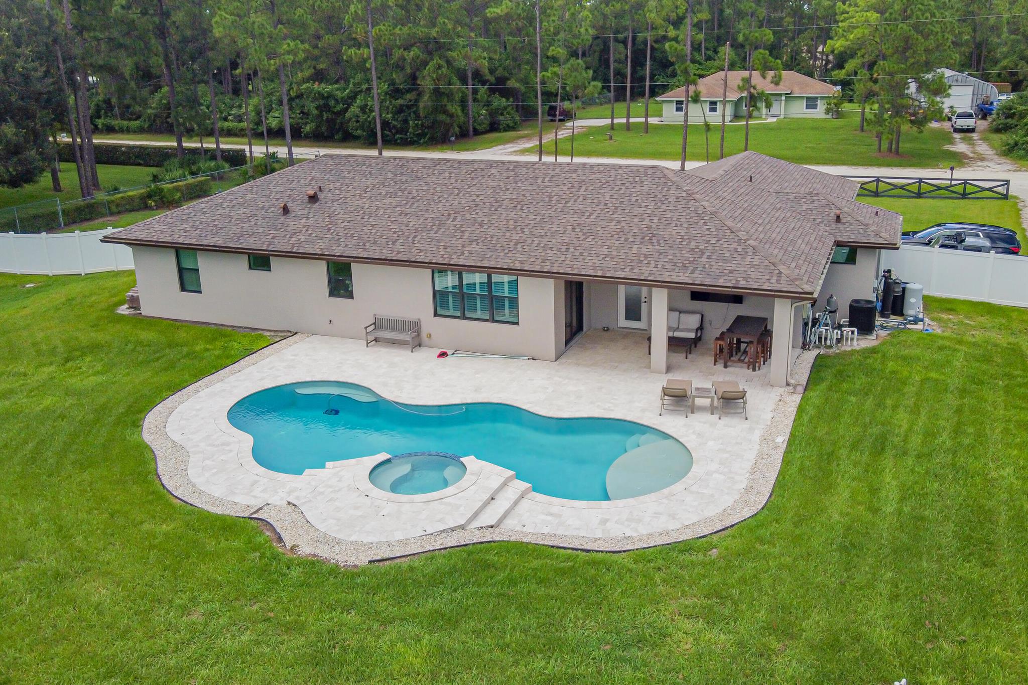 Welcome to The Acreage, this home sits on 1.15 acres, newly built home by Vista Builders in 2019, which has since had several attractive additions and upgrades. These additions include frameless shower in the primary bathroom, a fully fenced yard, impact windows, and plantation shutters throughout the house. The outdoor area seems equally impressive with a 20x40 saltwater heated pool and spa, accompanied by a stunning travertine deck.