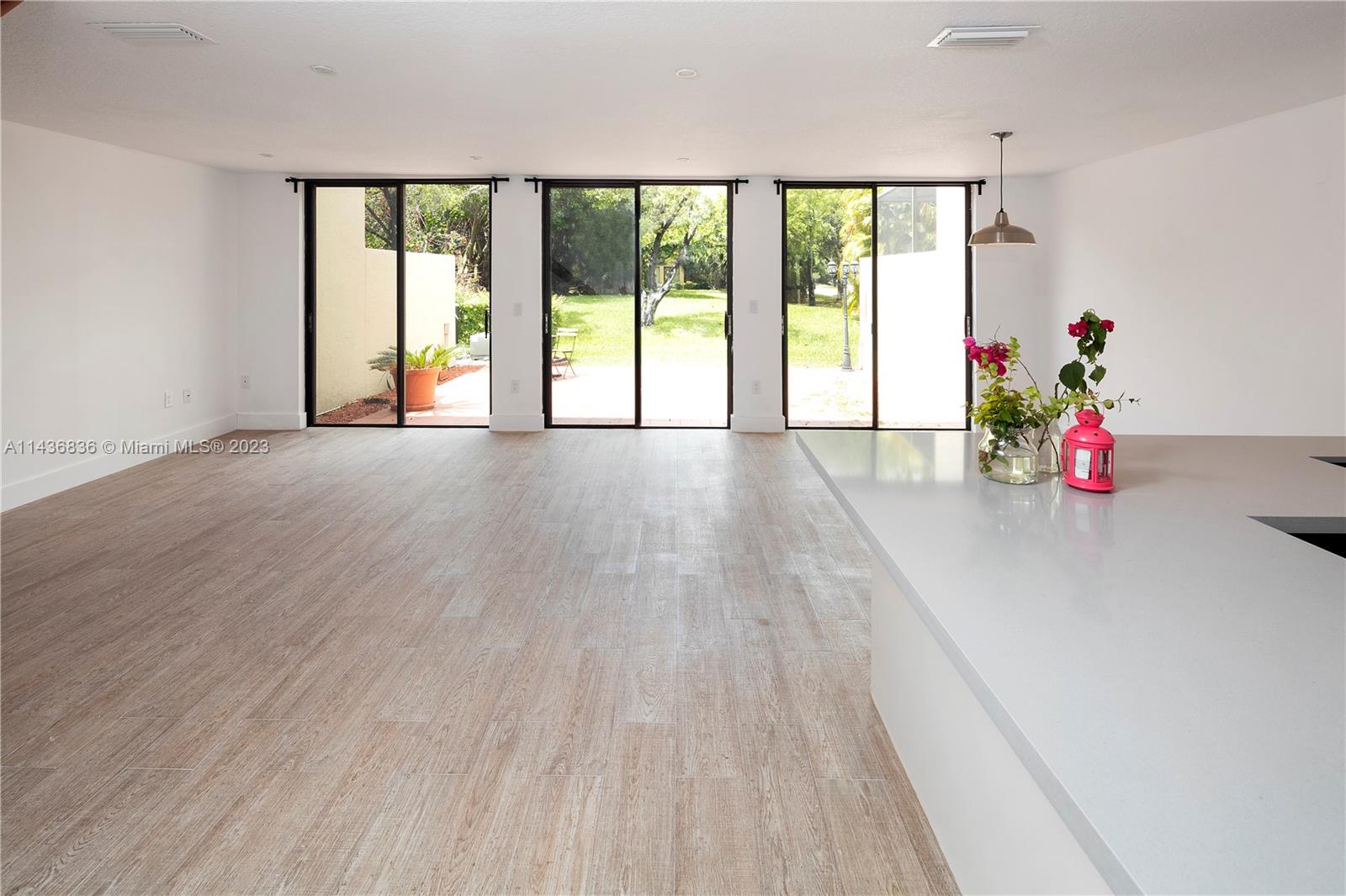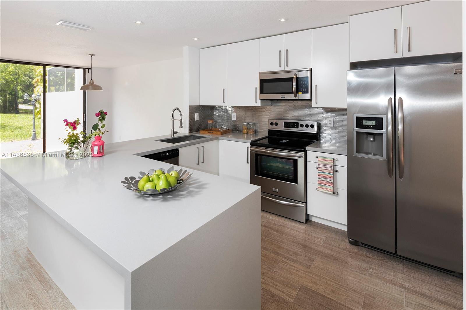 Modern three bedroom town home, this home was renovated with great materials such as hardwood flooring, ceramic tile and quartz counter tops. It also features an open kitchen and designer bathrooms. This 3 bedroom and 2.5 bath home with the garage converted to a four bedroom/office. Great gated community with a golf course, tennis courts, pool and playground.