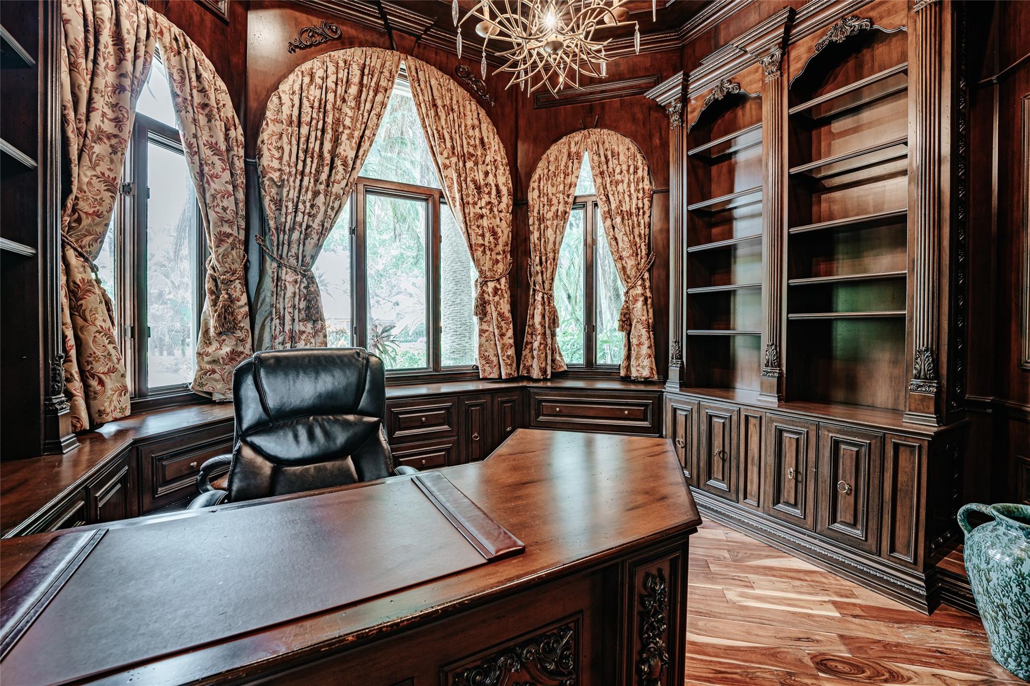 Magnificent & palatial home in the gated community of Windmill Ranch Estates, &may be classified as having the finest homes in South Florida. A private setting and situated on a cul-d-sac, this beautiful estate home offers it all from the grand entry when you first enter, to the in-law’s quarters. Marble/inlay flooring throughout living areas, medallions, custom woodwork, built-ins, columns, stone archways, traditional decorative interiors throughout,& so much more custom detailed finishes. This home offers 5bed and 4bath, gorgeous water views from the master bedroom and main living areas, new roof (2022) custom woodwork, oversized 3 car garage, entertainment pool area, summer kitchen, travertine pavers, fountain, pergola, majestic landscaping,& so much more. Horses are permitted.