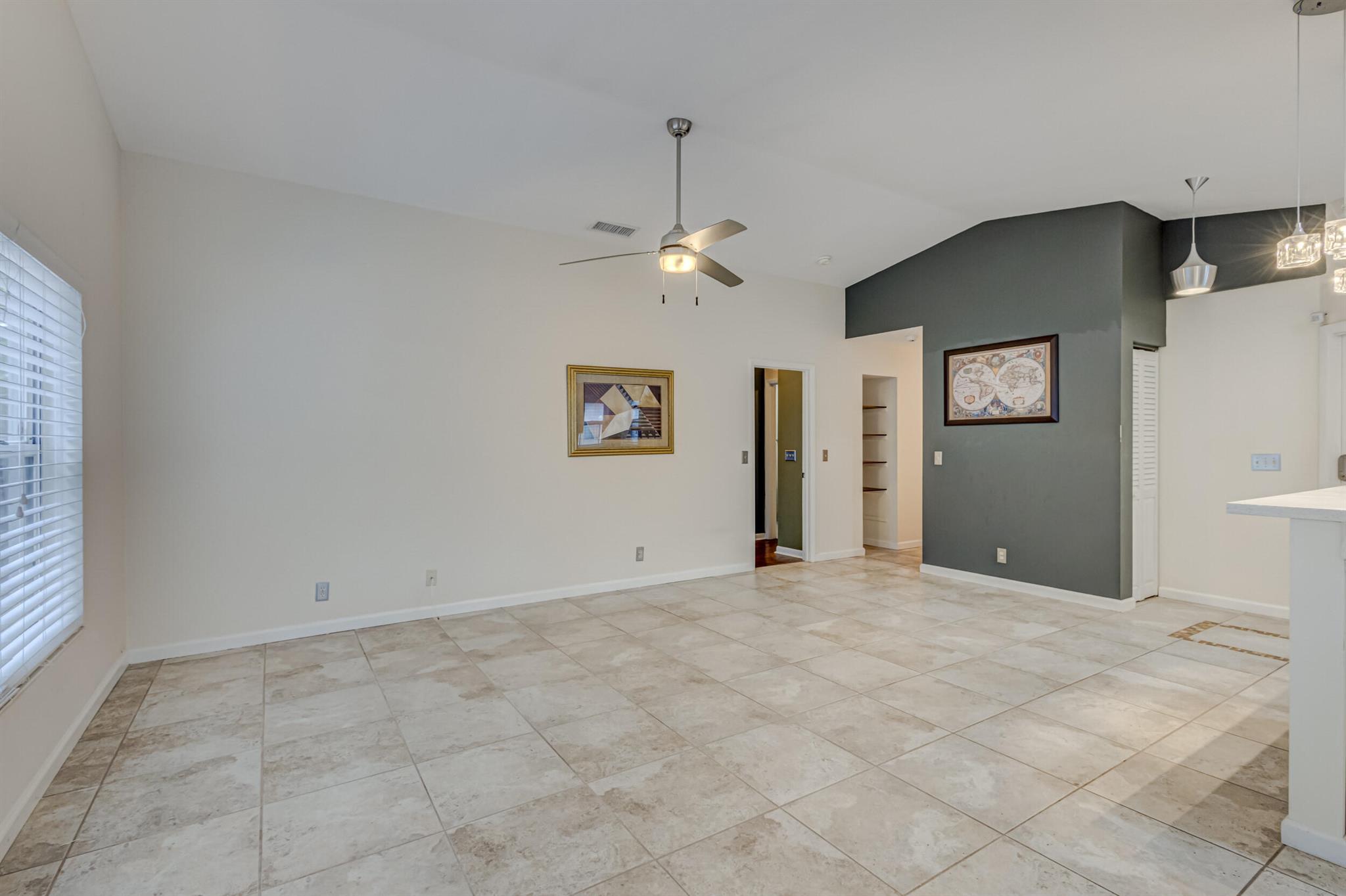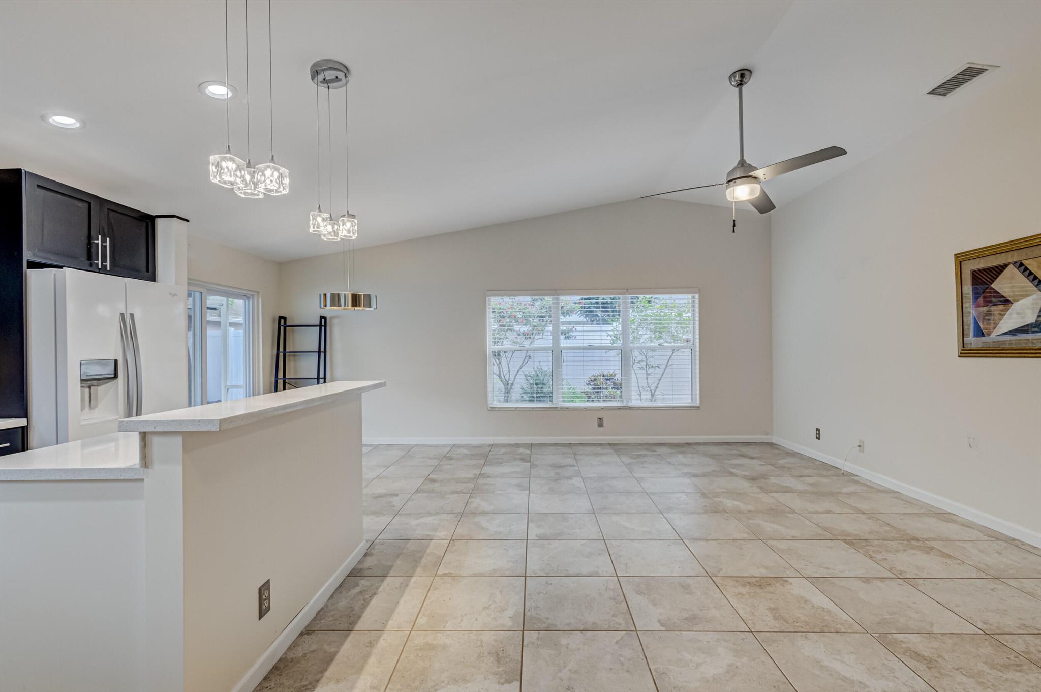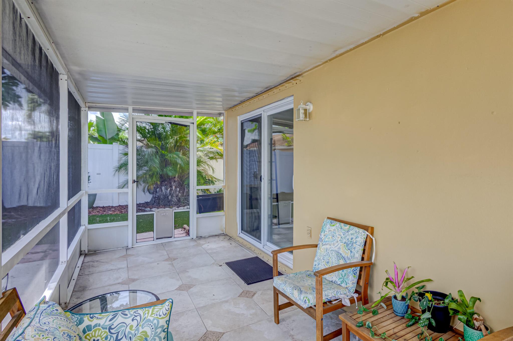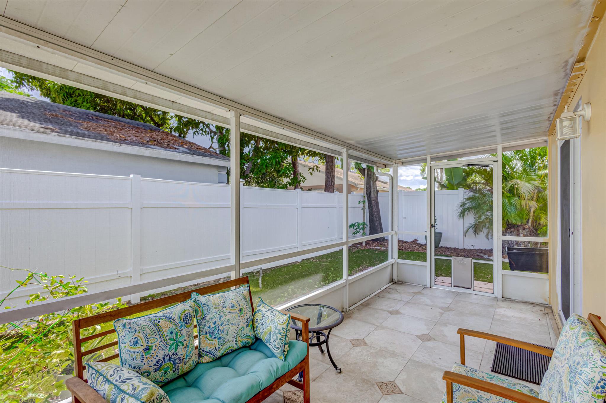 Move-in ready, upgraded, and fully fenced single family home with low HOA fees that include a manned gate, cable package, and lawn care. Step out of your impact rated slider onto a screened and covered patio or relax in your fully fenced yard with low maintenance turf and beautiful trees including palm trees, flowers, and a papaya tree. Updated kitchen has quartz countertops, tile backsplash, modern lighting, nice island with wine fridge, wood cabinetry with drawer pullouts, and a pantry. Living room has tall vaulted ceiling, tile flooring (no carpet in the home), and nice picture window bringing in natural light. AC is 2023! Large master bedroom with walk-in closet and updated bathroom + shower. Large 2-car garage is impact rated and has storage shelves and storage closet. Great value!!