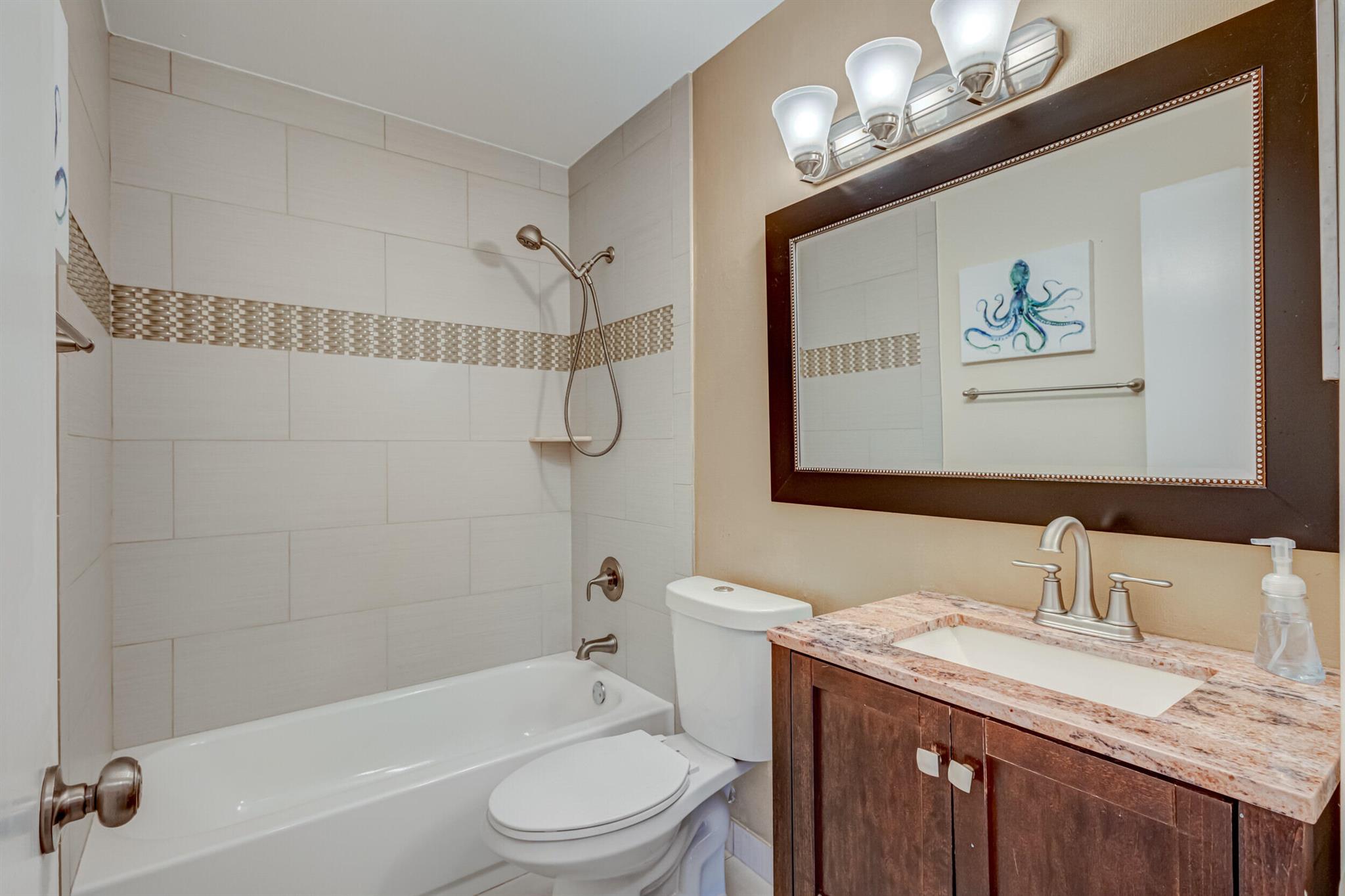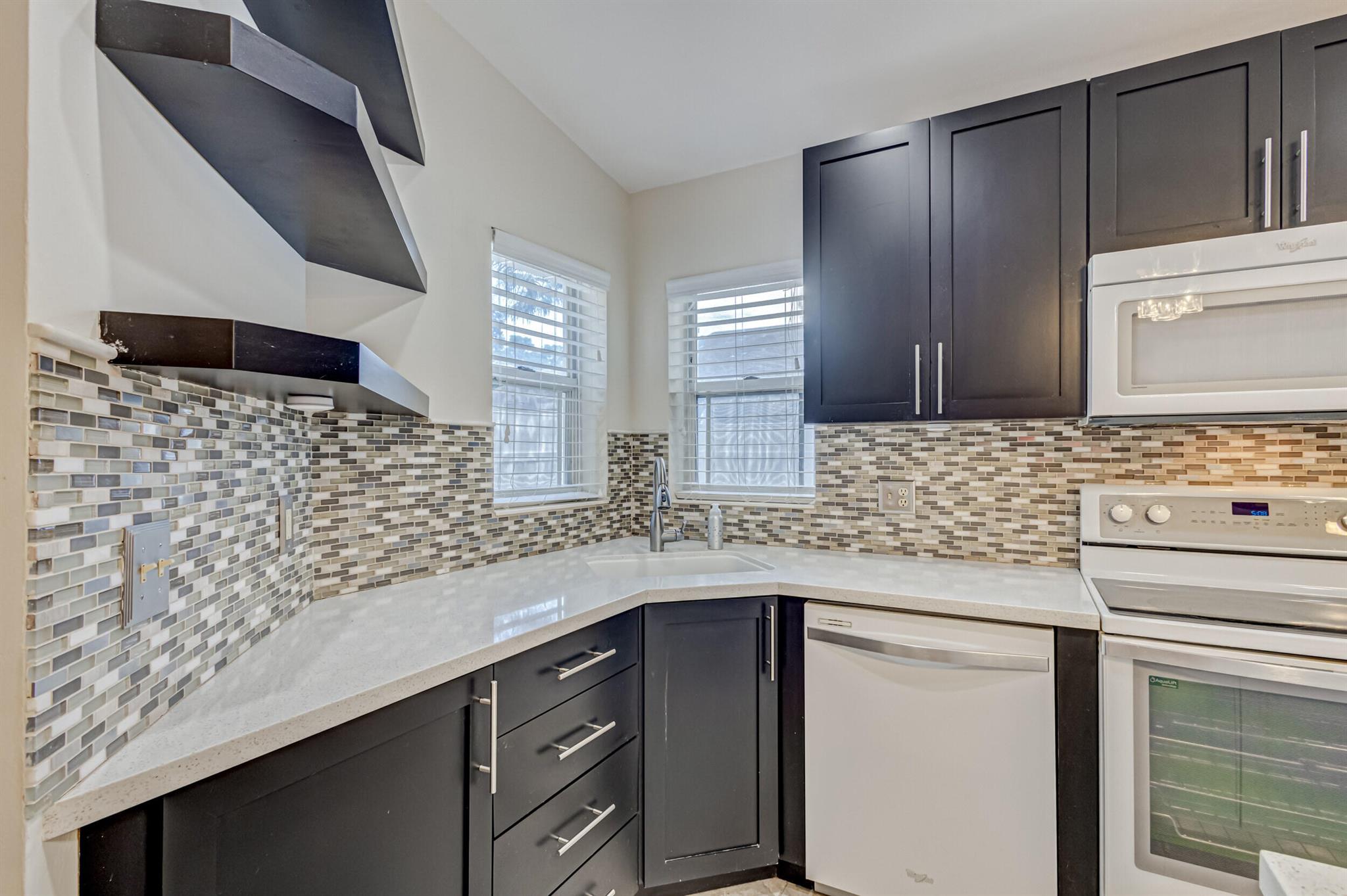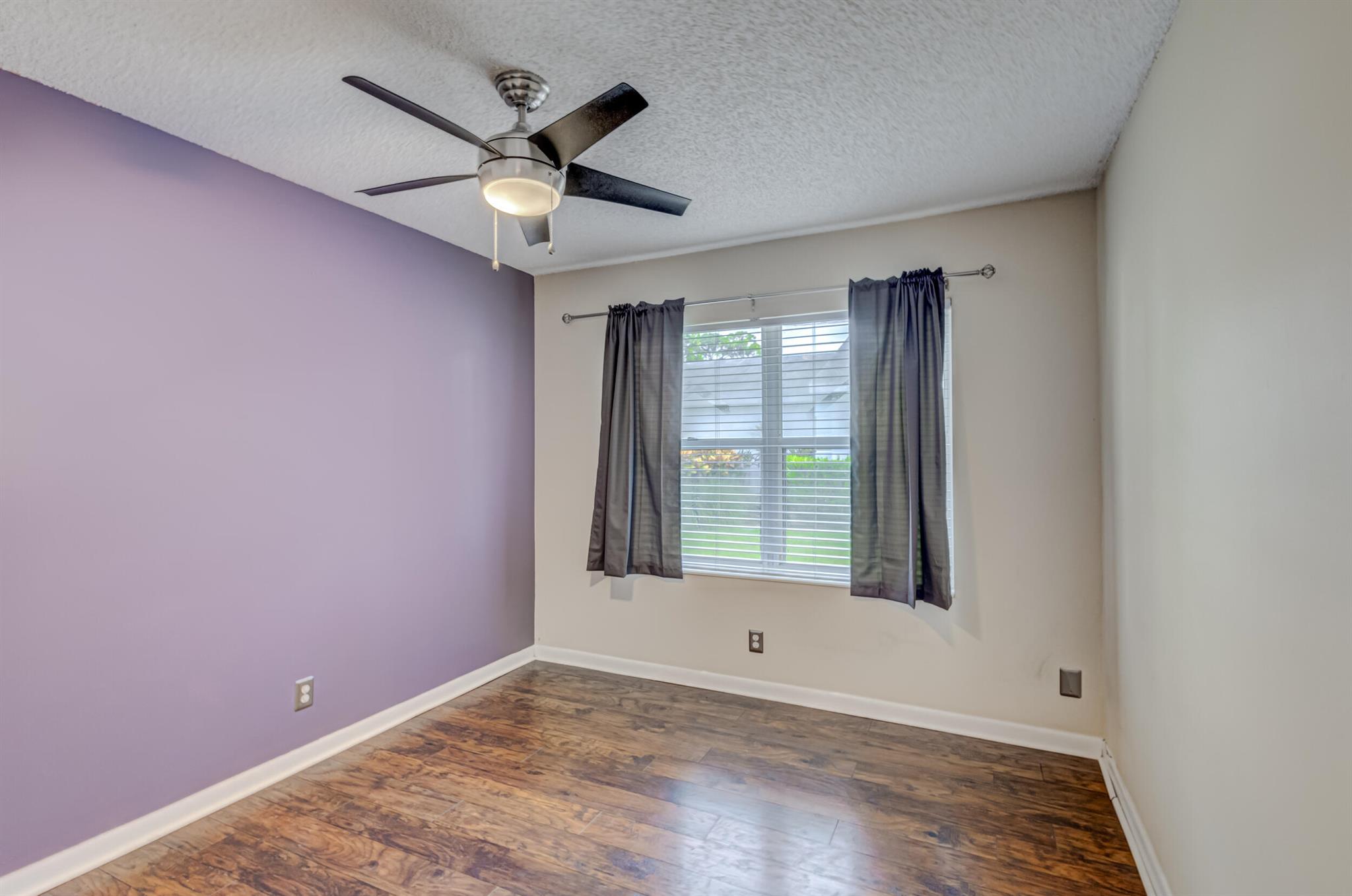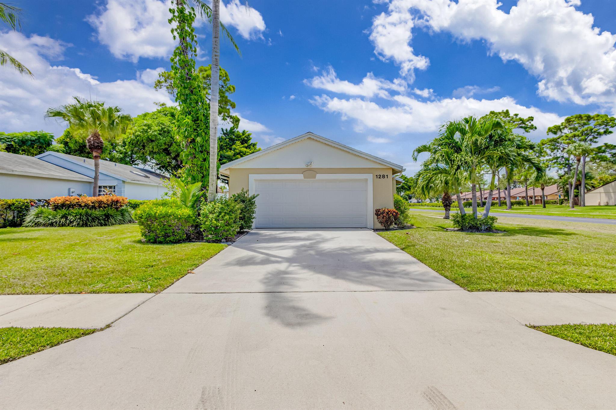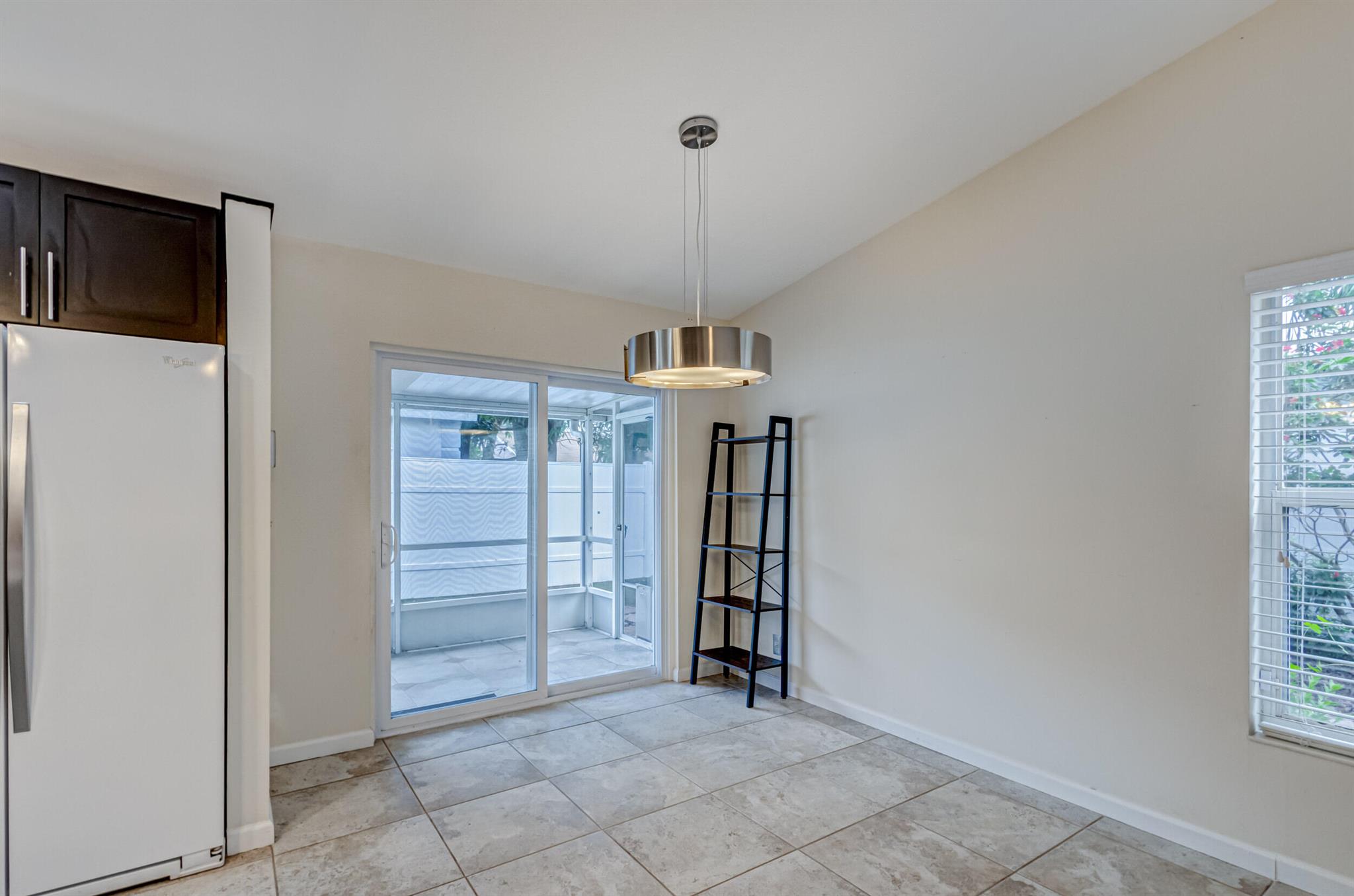Move-in ready, upgraded, and fully fenced single family home with low HOA fees that include a manned gate, cable package, and lawn care. Step out of your impact rated slider onto a screened and covered patio or relax in your fully fenced yard with low maintenance turf and beautiful trees including palm trees, flowers, and a papaya tree. Updated kitchen has quartz countertops, tile backsplash, modern lighting, nice island with wine fridge, wood cabinetry with drawer pullouts, and a pantry. Living room has tall vaulted ceiling, tile flooring (no carpet in the home), and nice picture window bringing in natural light. AC is 2023! Large master bedroom with walk-in closet and updated bathroom + shower. Large 2-car garage is impact rated and has storage shelves and storage closet. Great value!!