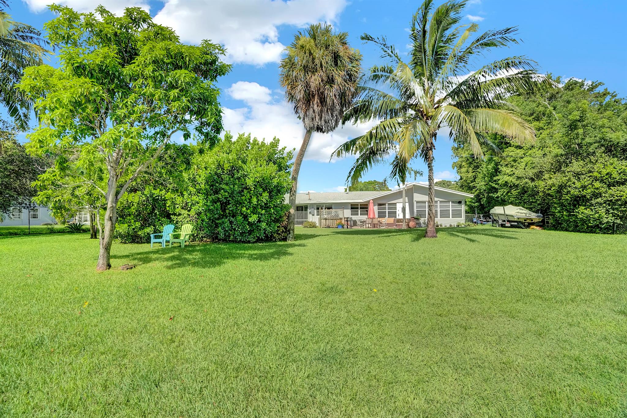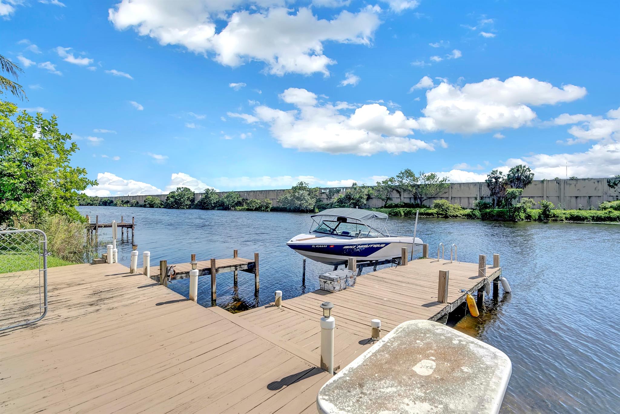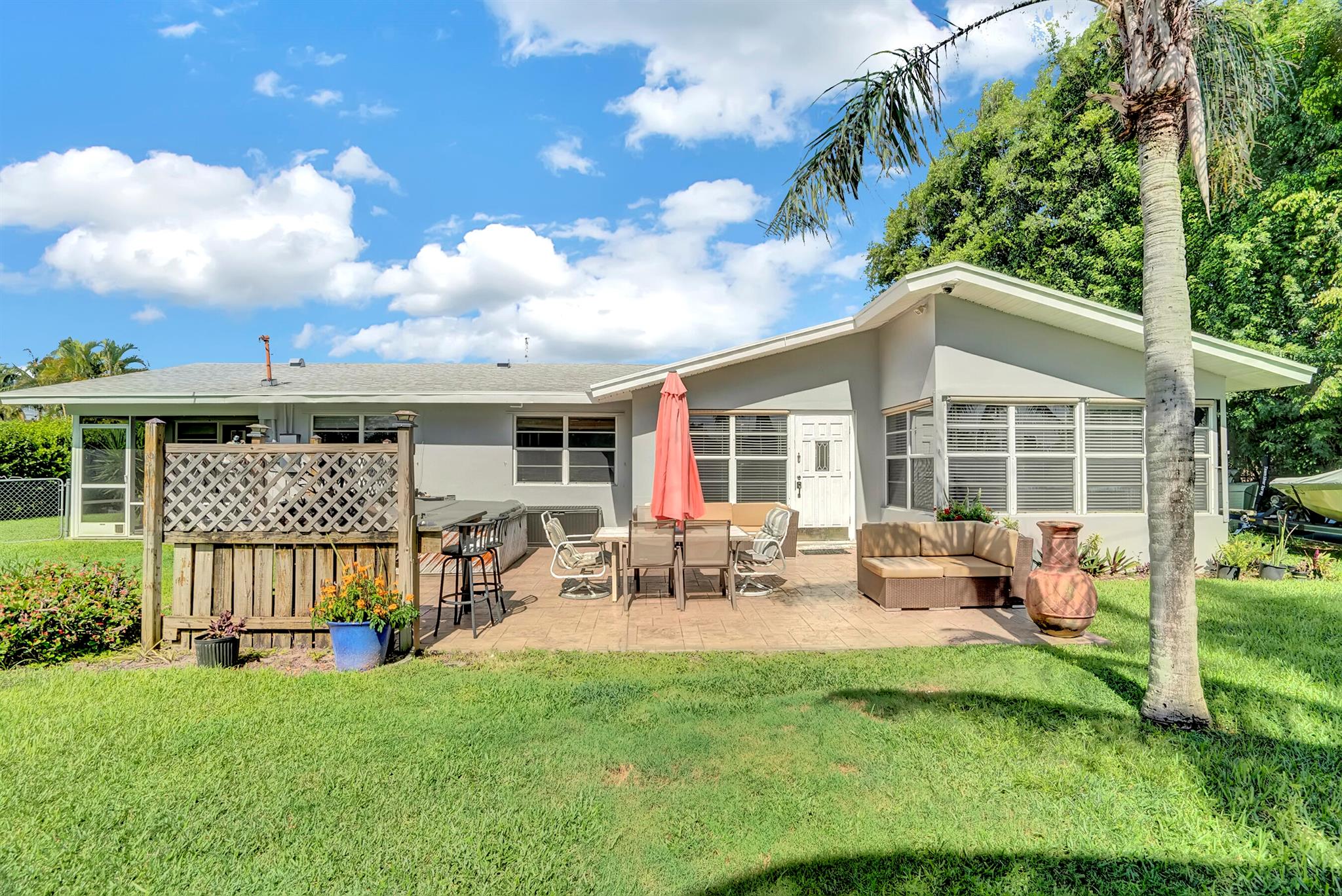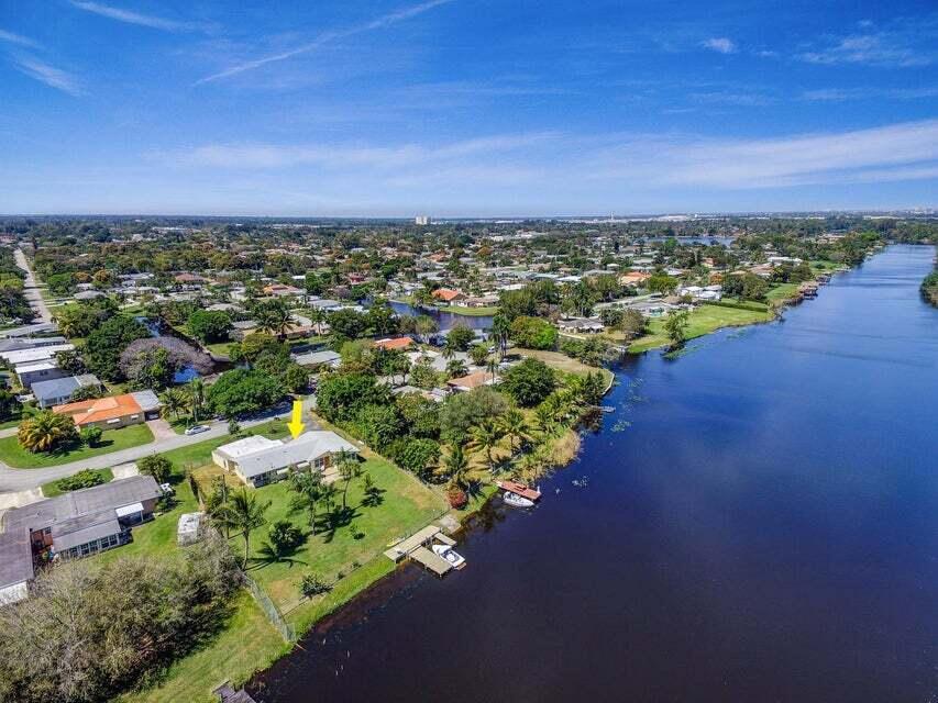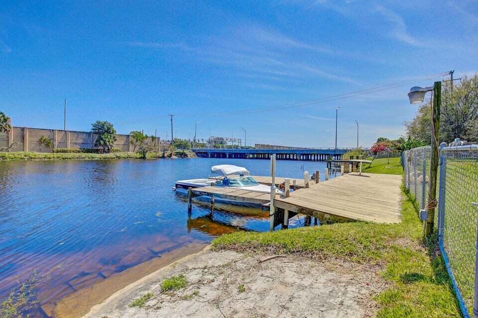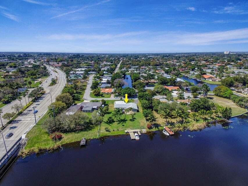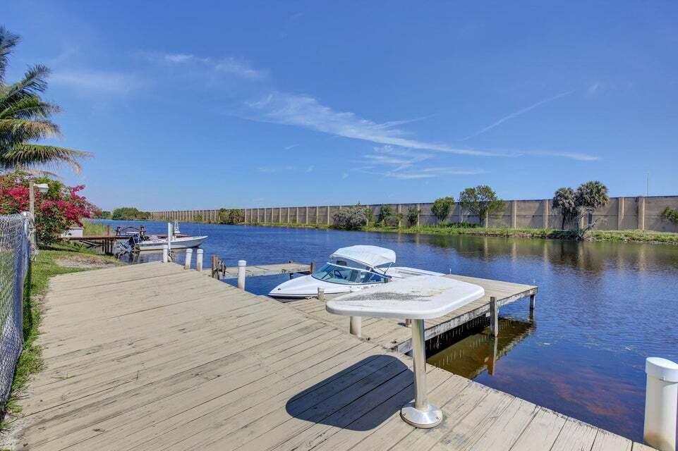Boaters dream home. Rare waterfront property on NAVIGABLE canal with access to Clear Lake; Lake Osborne, Lake Ida and canal systems throughout Palm Beach. Open bright and spacious 3 bedroom 2 bath home. Updated kitchen with granite counter tops. Beautiful terrazzo flooring throughout living space with volume ceilings. Large exposed ceiling beams add character to this modernized home. 3 large bedrooms. Massive open living space for entertaining with walk-out to large deck with hot tub and barbeque station. A large fenced yard leads to custom dock on wide canal. Recent complete exterior painting. Oversized 2 car garage - room for boat. This home is centrally located with easy access to schools; shopping; beaches and highways. All of this in a lovely neighborhood with NO HOA