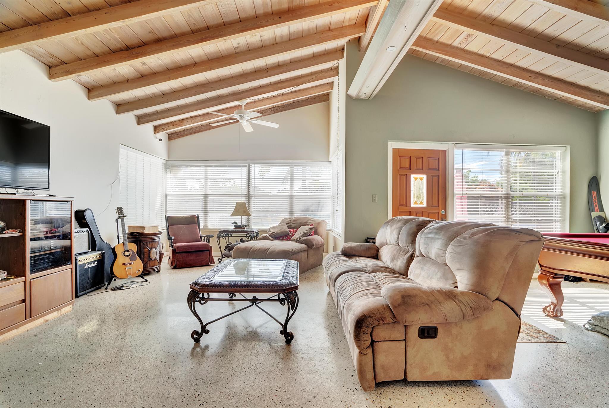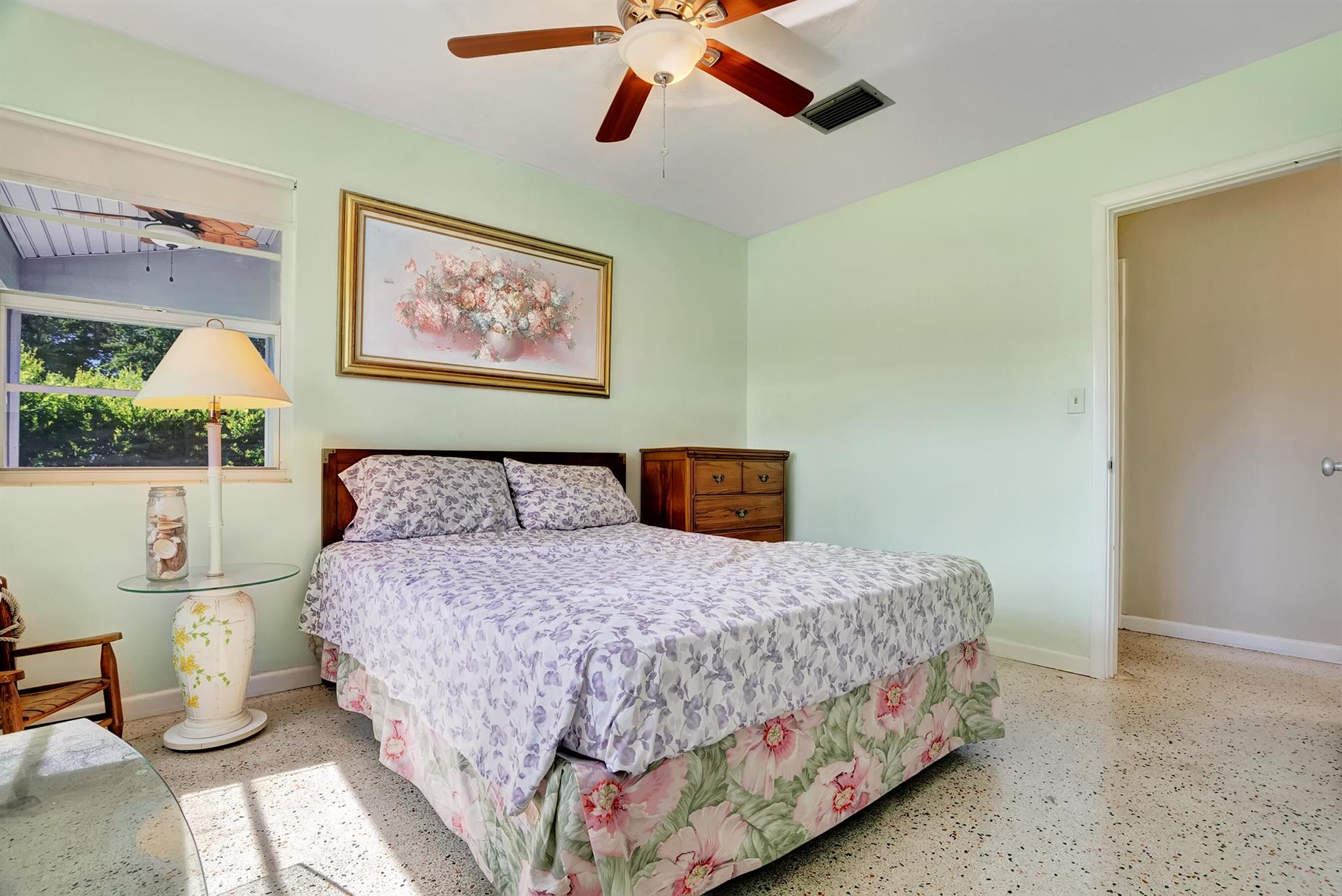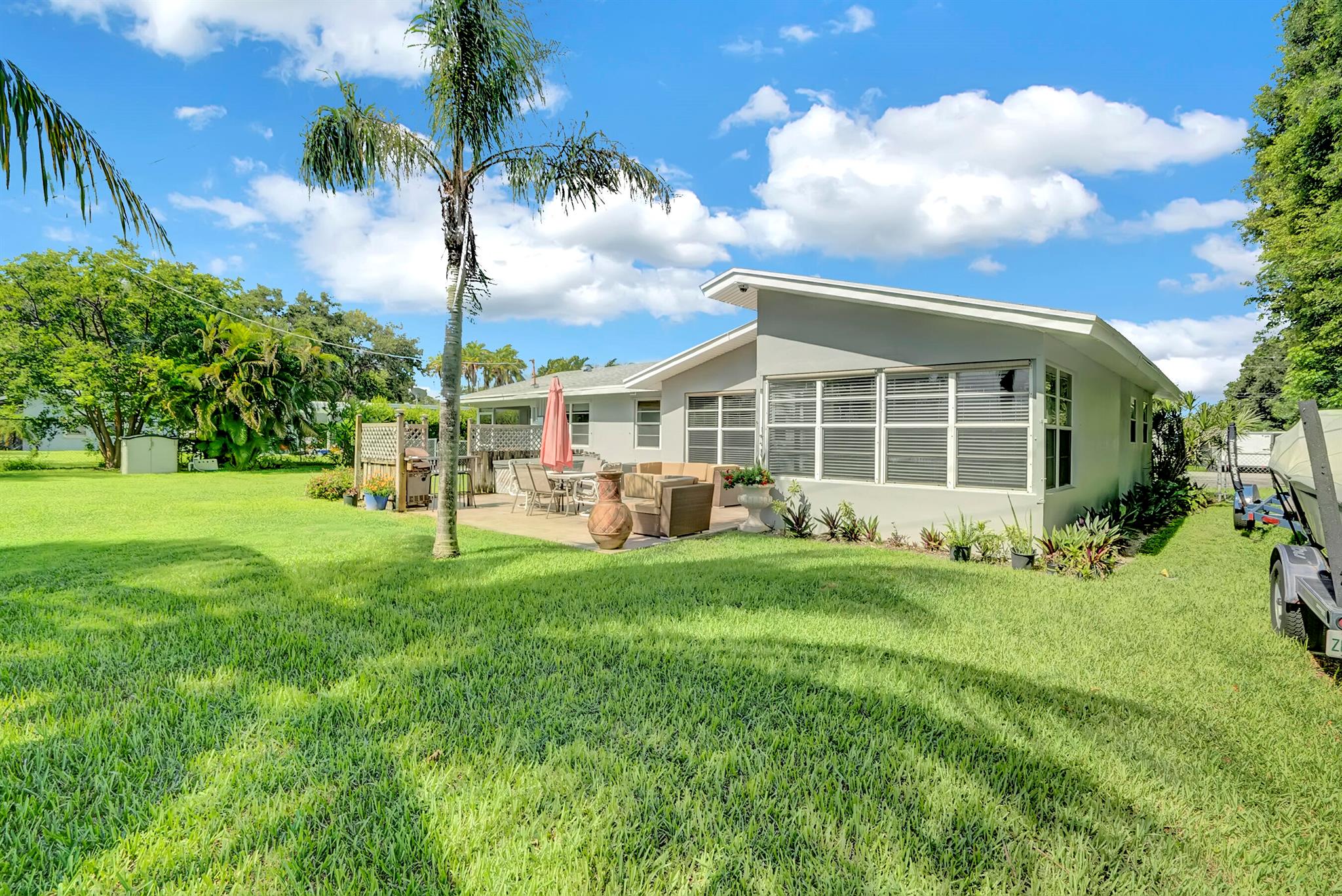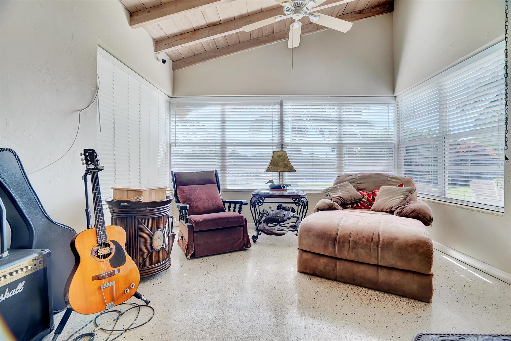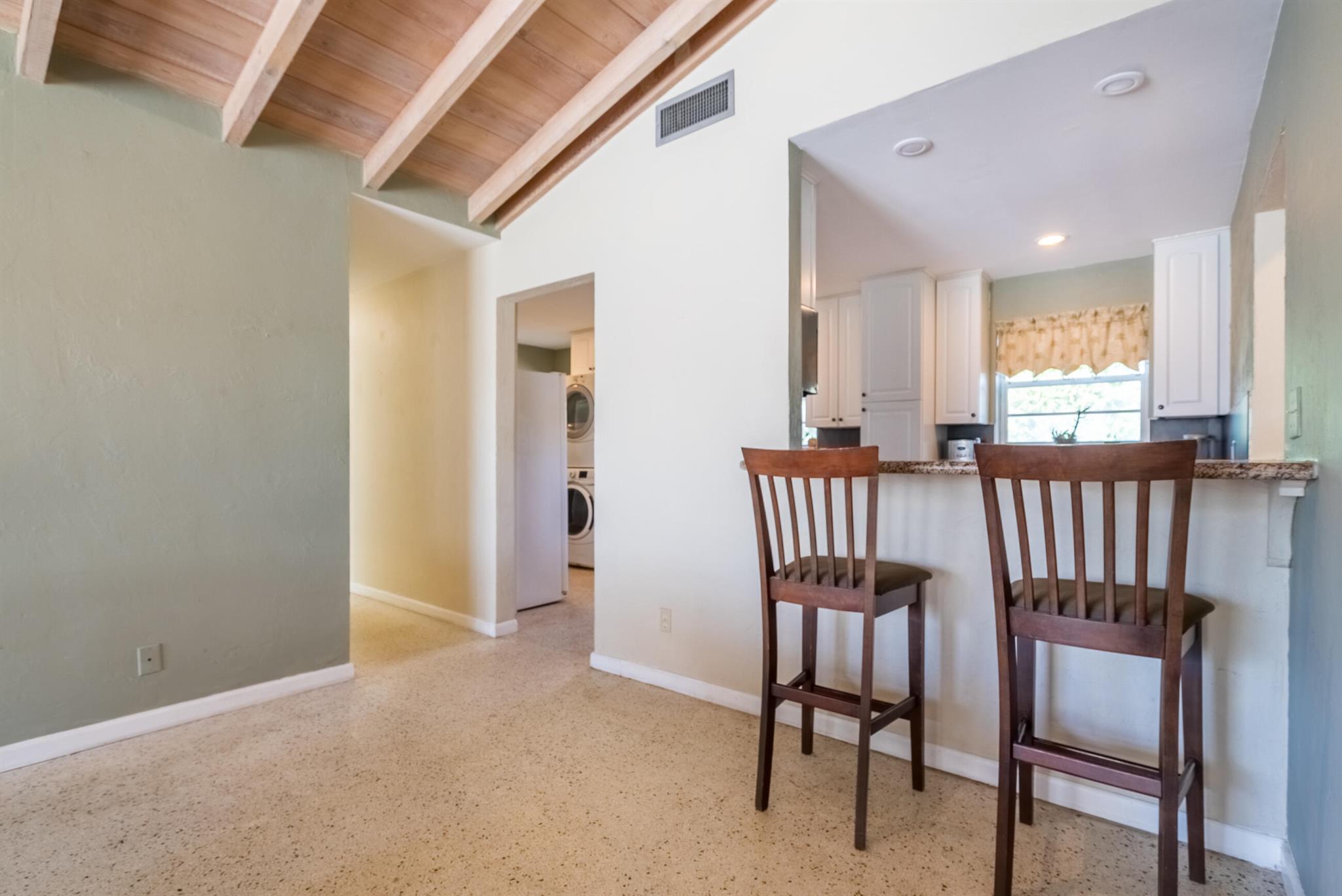 Boaters dream home. Rare waterfront property on NAVIGABLE canal with access to Clear Lake; Lake Osborne, Lake Ida and canal systems throughout Palm Beach. Open bright and spacious 3 bedroom 2 bath home. Updated kitchen with granite counter tops. Beautiful terrazzo flooring throughout living space with volume ceilings. Large exposed ceiling beams add character to this modernized home. 3 large bedrooms. Massive open living space for entertaining with walk-out to large deck with hot tub and barbeque station. A large fenced yard leads to custom dock on wide canal. Recent complete exterior painting. Oversized 2 car garage - room for boat. This home is centrally located with easy access to schools; shopping; beaches and highways. All of this in a lovely neighborhood with NO HOA