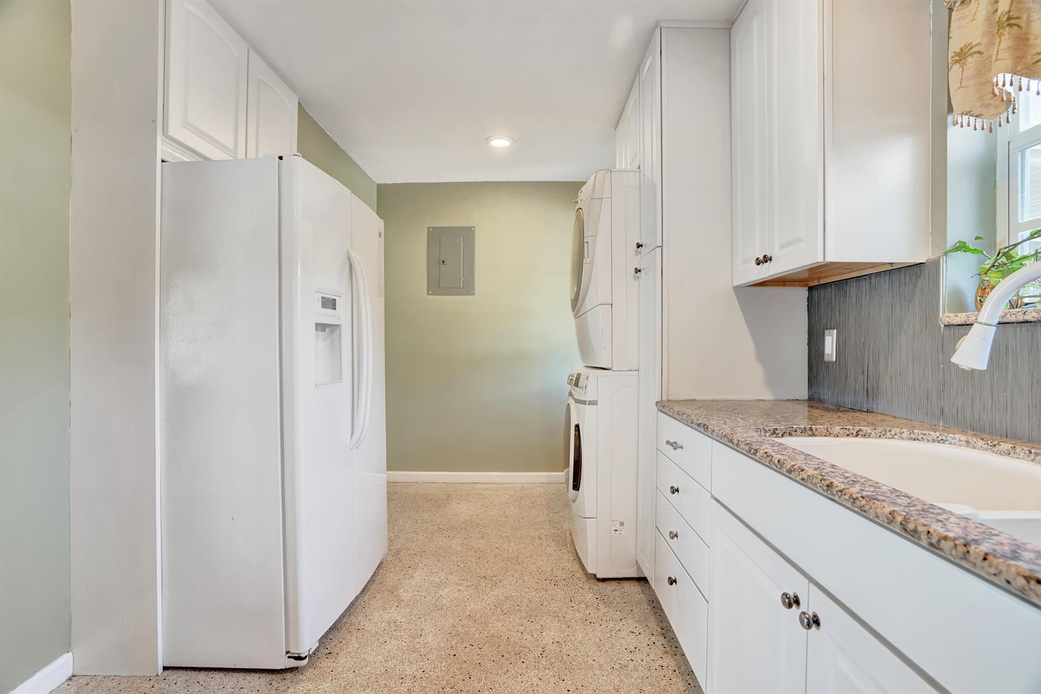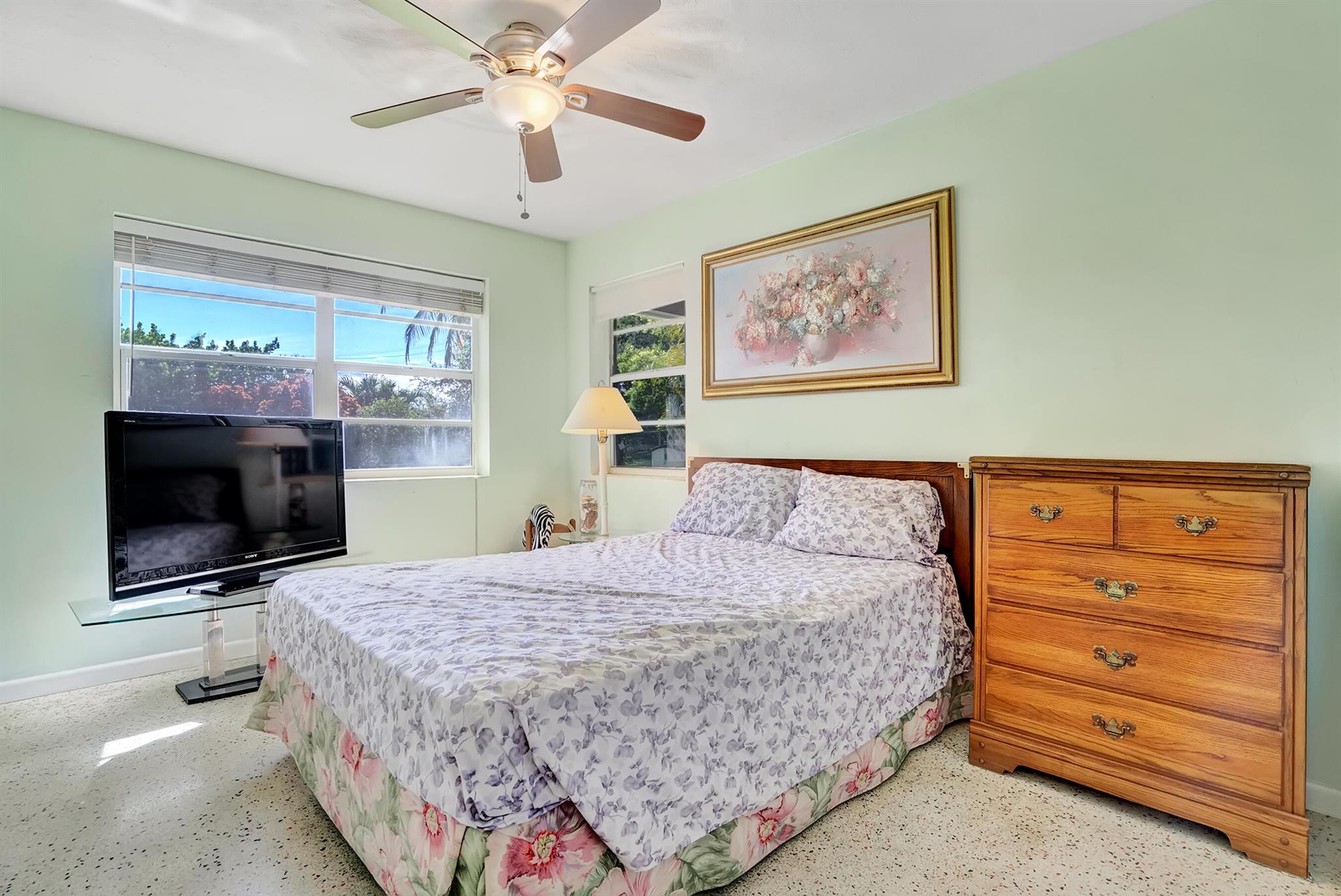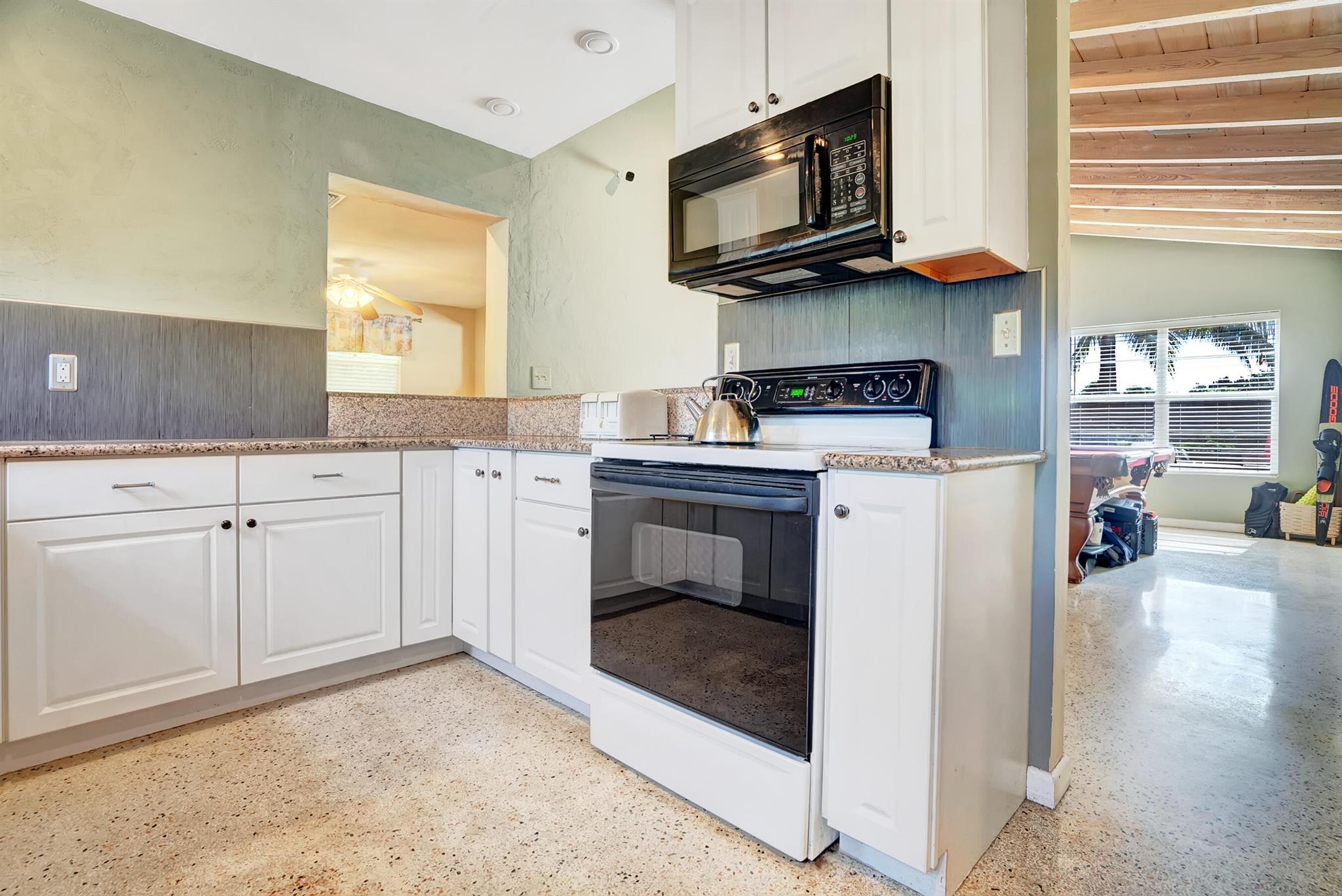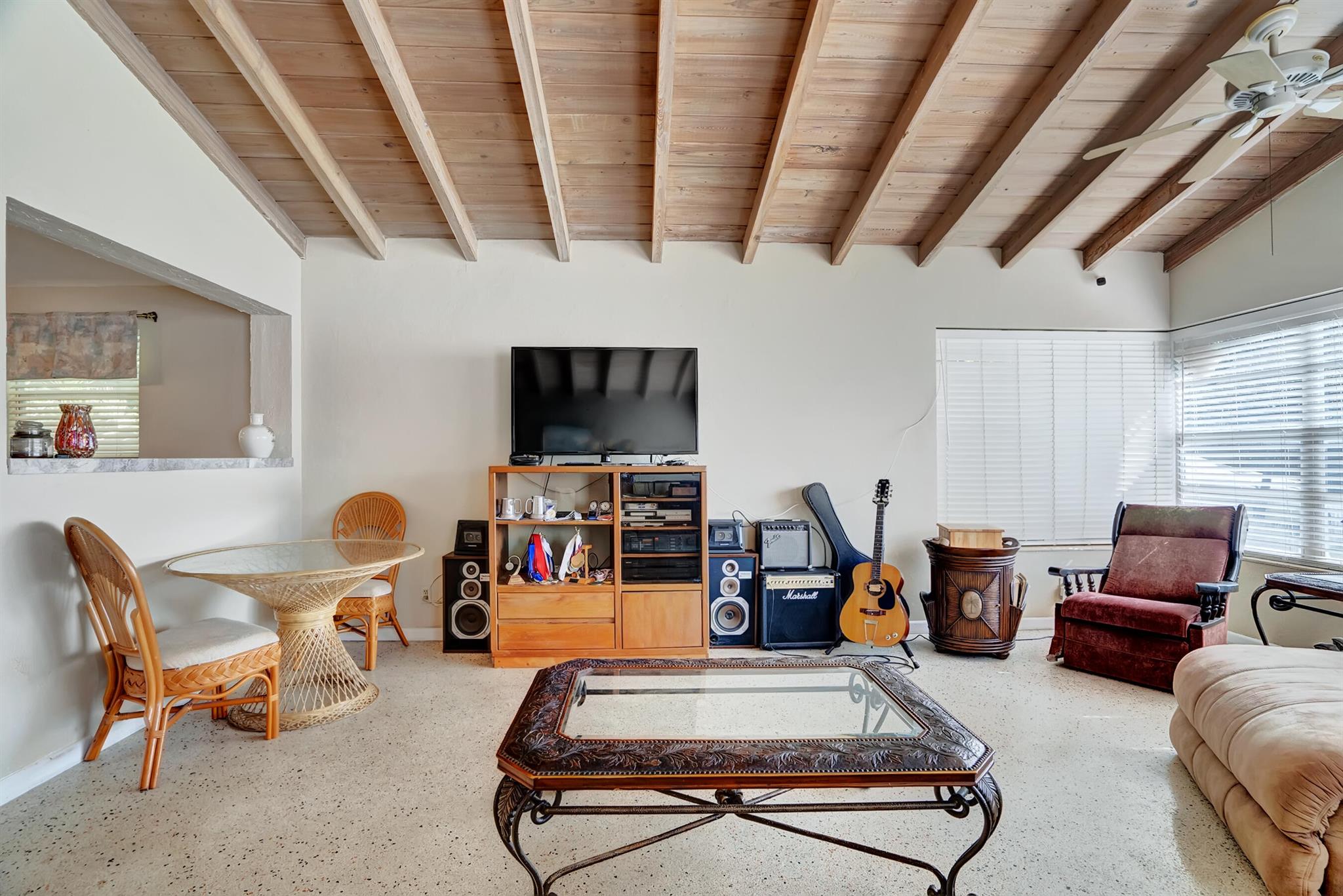 Boaters dream home. Rare waterfront property on NAVIGABLE canal with access to Clear Lake; Lake Osborne, Lake Ida and canal systems throughout Palm Beach. Open bright and spacious 3 bedroom 2 bath home. Updated kitchen with granite counter tops. Beautiful terrazzo flooring throughout living space with volume ceilings. Large exposed ceiling beams add character to this modernized home. 3 large bedrooms. Massive open living space for entertaining with walk-out to large deck with hot tub and barbeque station. A large fenced yard leads to custom dock on wide canal. Recent complete exterior painting. Oversized 2 car garage - room for boat. This home is centrally located with easy access to schools; shopping; beaches and highways. All of this in a lovely neighborhood with NO HOA