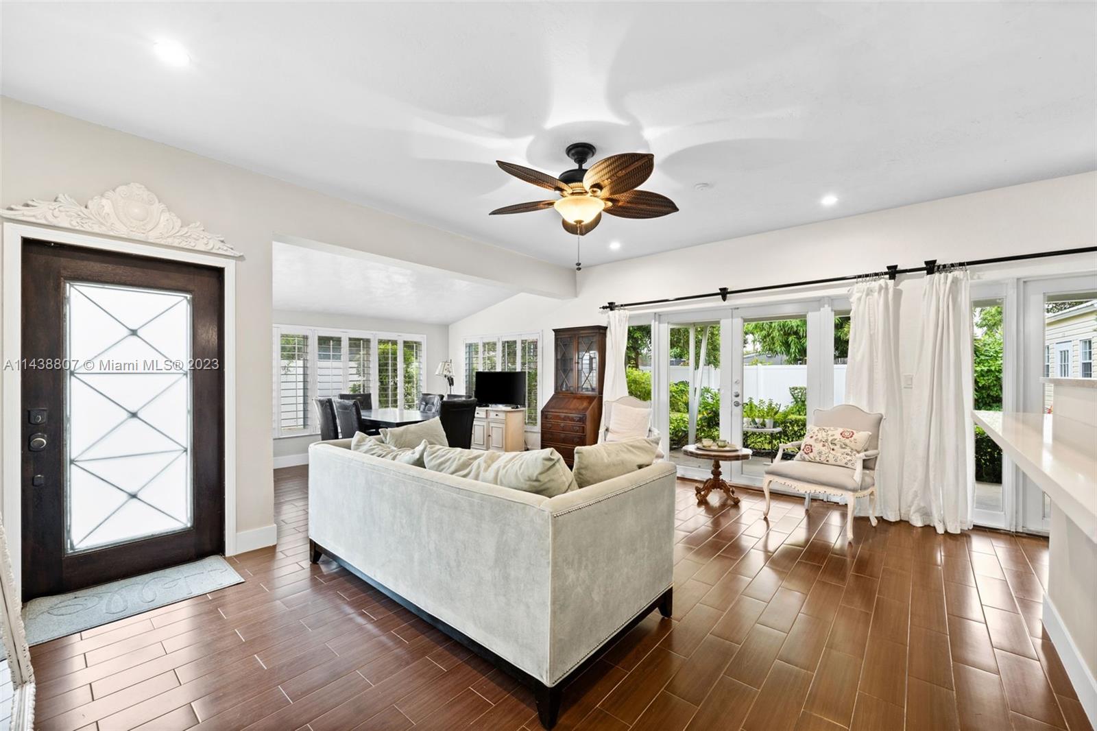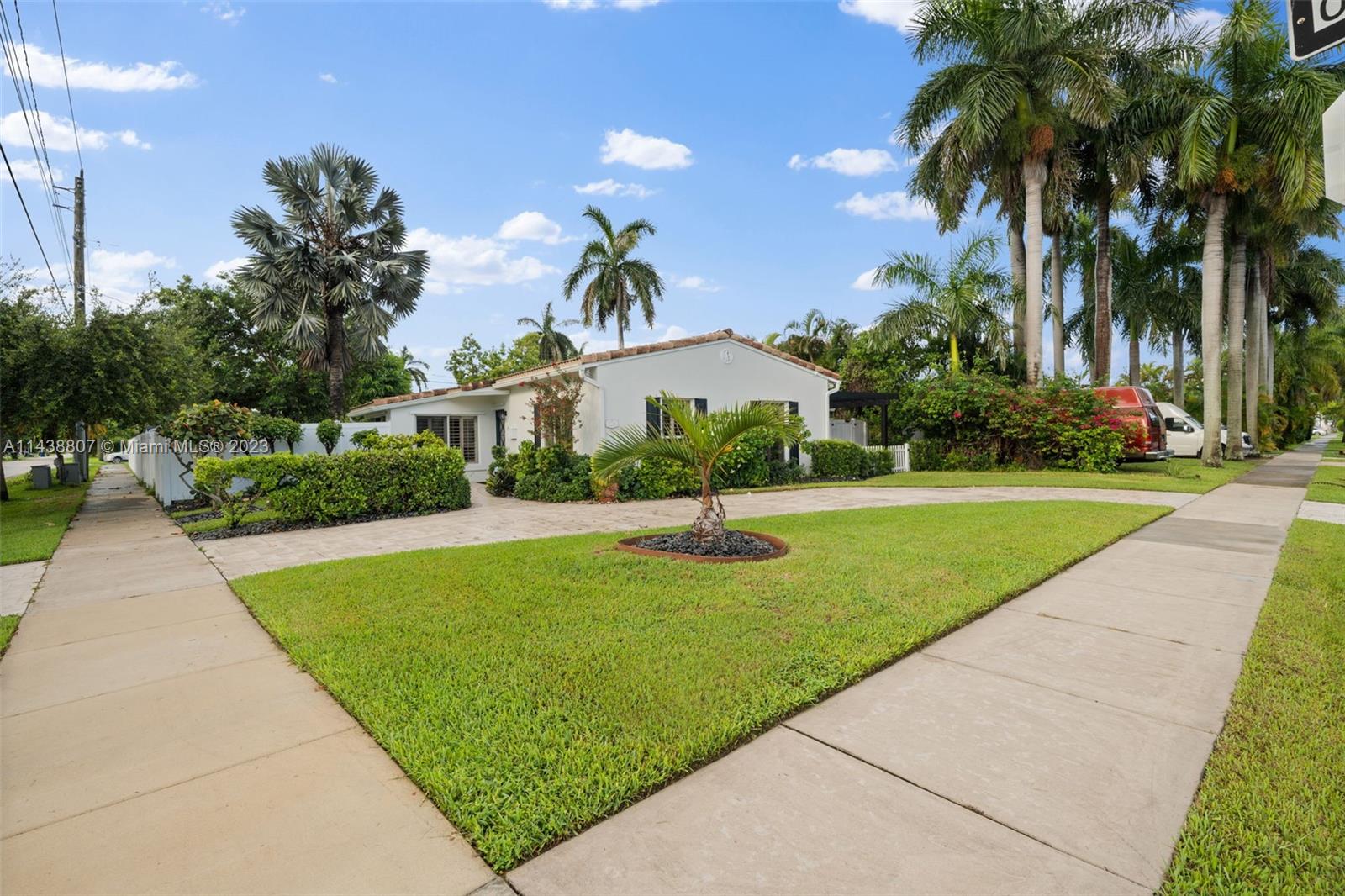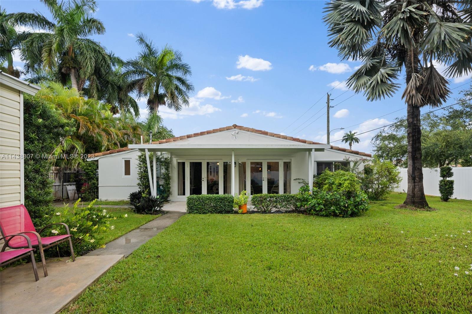 1,389 sq foot, 3-bedroom, 2-bath corner home in NE Hallandale Beach. well-maintained home with a circular driveway, a barrel tile roof, and beautiful landscaping. Once you enter this home, you will notice all the natural light through the plantation shutters and two French doors open to a covered porch overlooking the backyard with a she-shed. The primary bedroom has a full bathroom and a patio with French doors overlooking the front yard. The home is a split-bedroom floorplan with an open kitchen to the living and dining area. Other improvements are the exterior freshly painted in 2022, a new PVC fence, and beautiful landscaping. The she-shed has A/C, lighting, and two lofts, permitted on a concrete slab. Easy to show; appointment required. Attachments are included on the MLS.