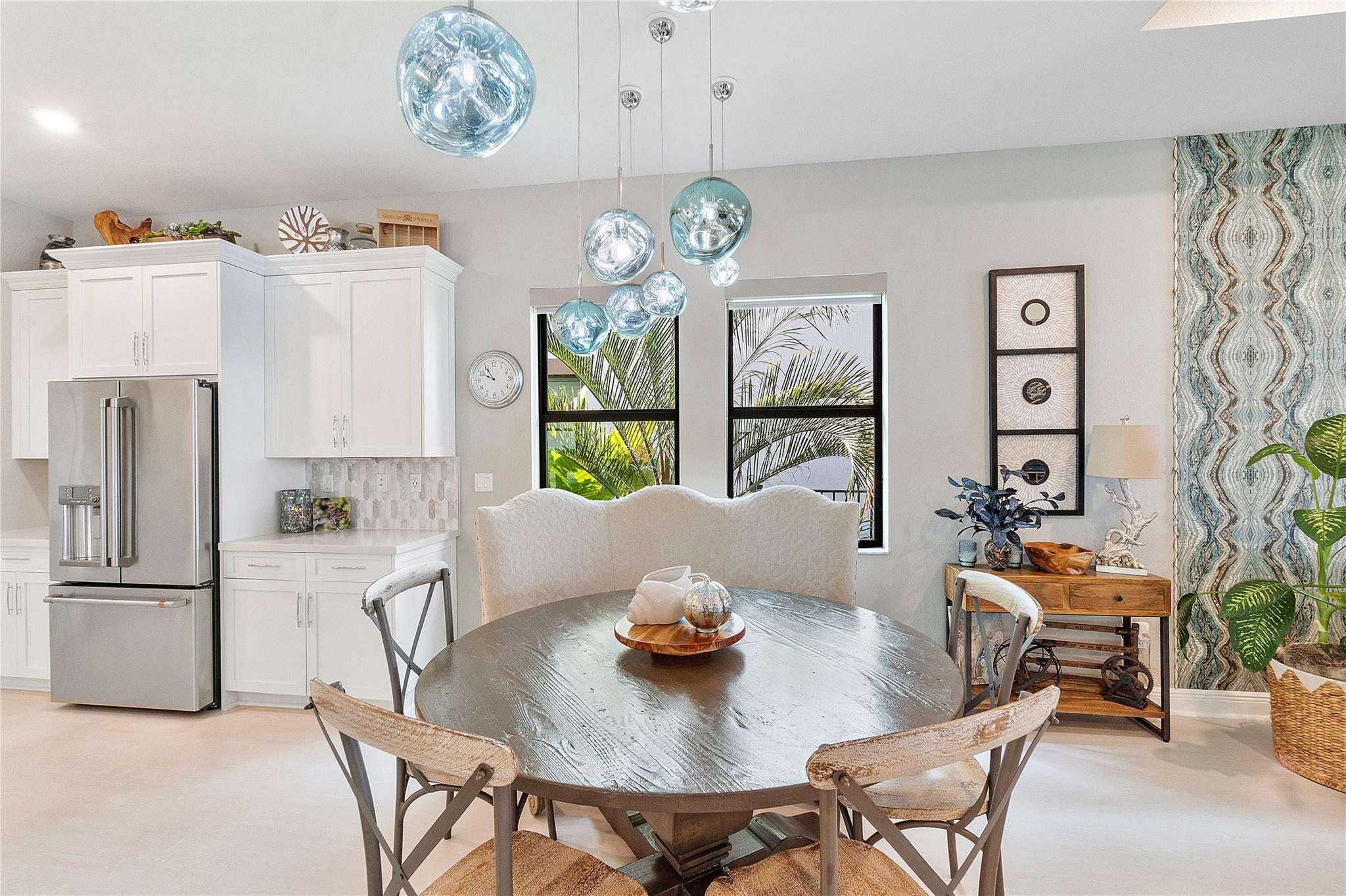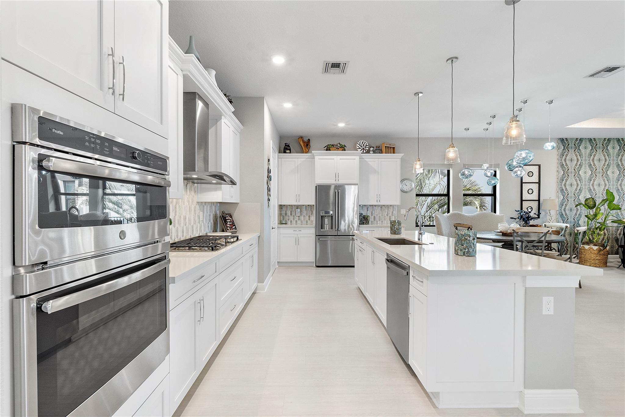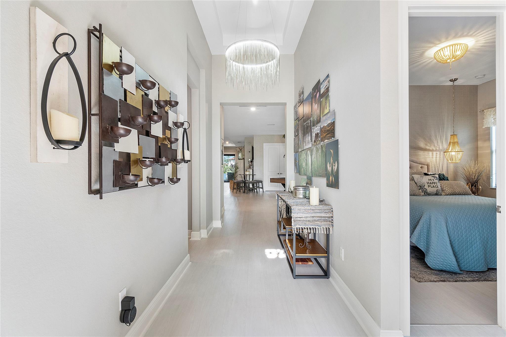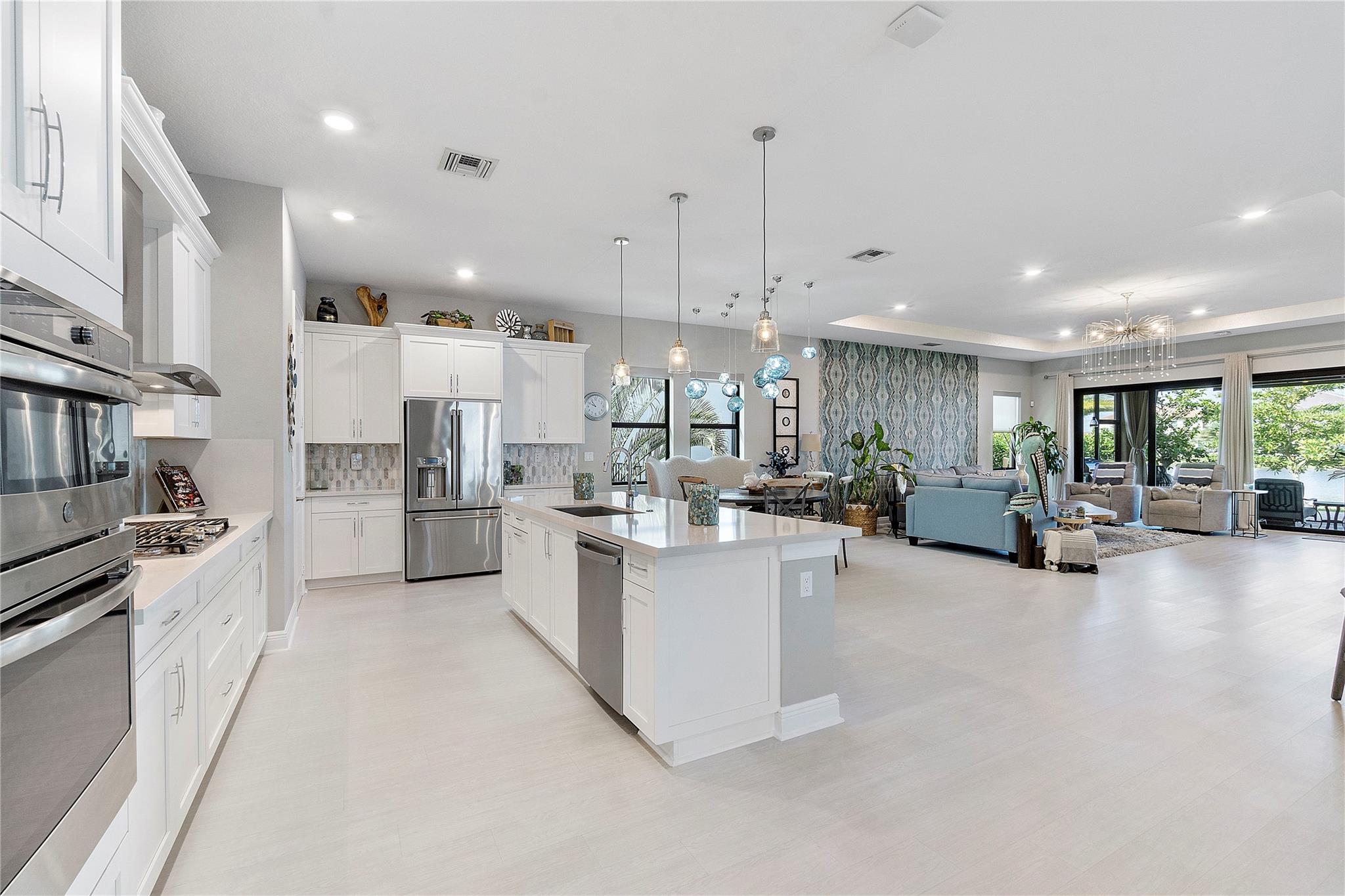 Magnificent lakefront home owned by a professional decorator who spared no expense. 10" ceilings throughout. Exquisite lighting and chandeliers will remain. The perfect home to entertain. The great room flows out onto the covered screened patio. Enjoy the postcard-perfect sunset views while you restore, relax and rejuvenate in your tropical paradise, featuring an outdoor Kitchen, AC system for the screened lanai, a hot tub and fire pit. A sculptured wall and tray ceilings enhance the main bedroom, along with your tranquil bathroom spa. This is an exquisite living experience community with resort-style amenities, featuring a 16,000 sq ft clubhouse with a fitness center, kids room, banquet rooms, bar, culinary studio, large beach entry pool, tennis courts and a basketball court.