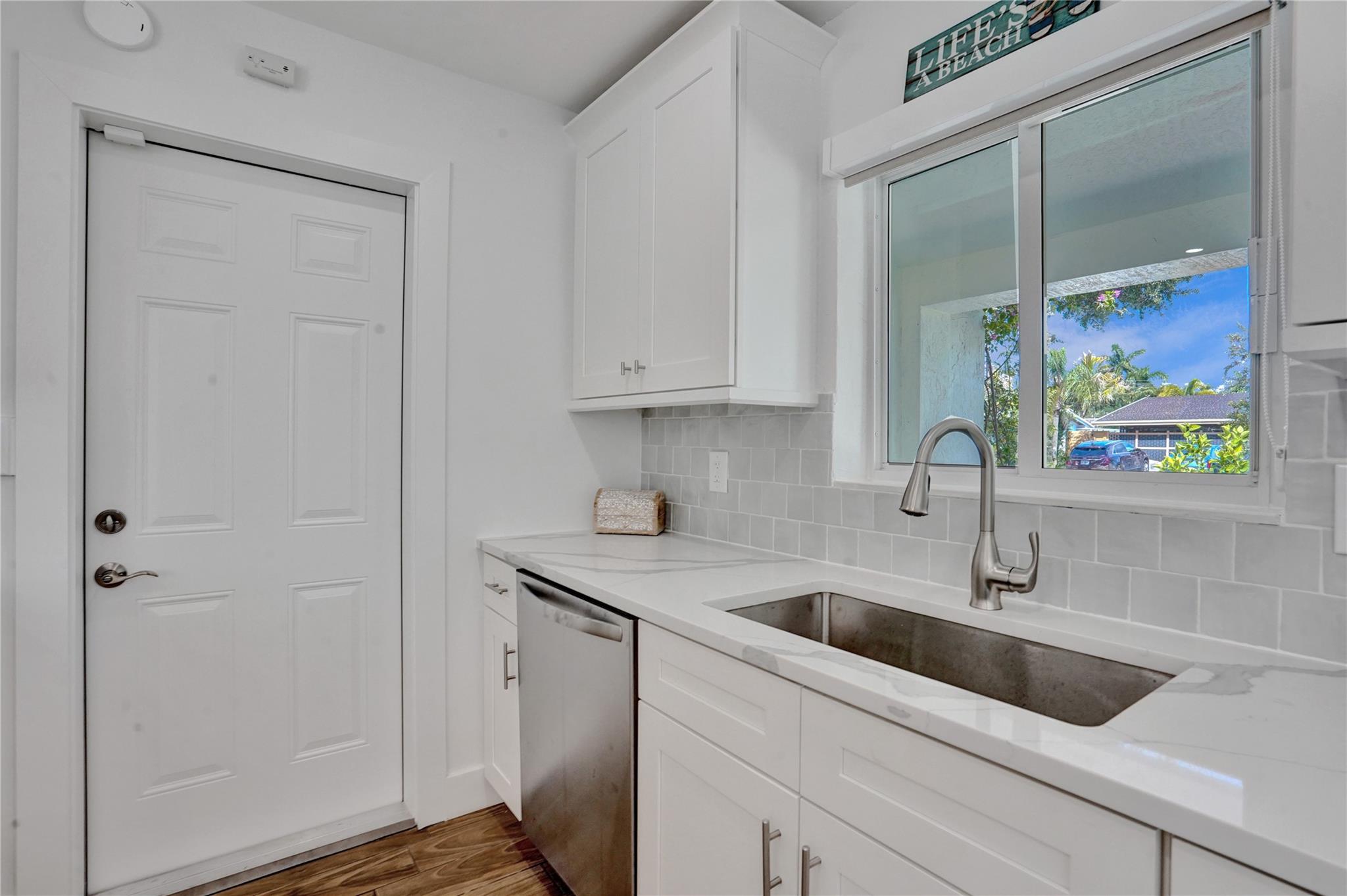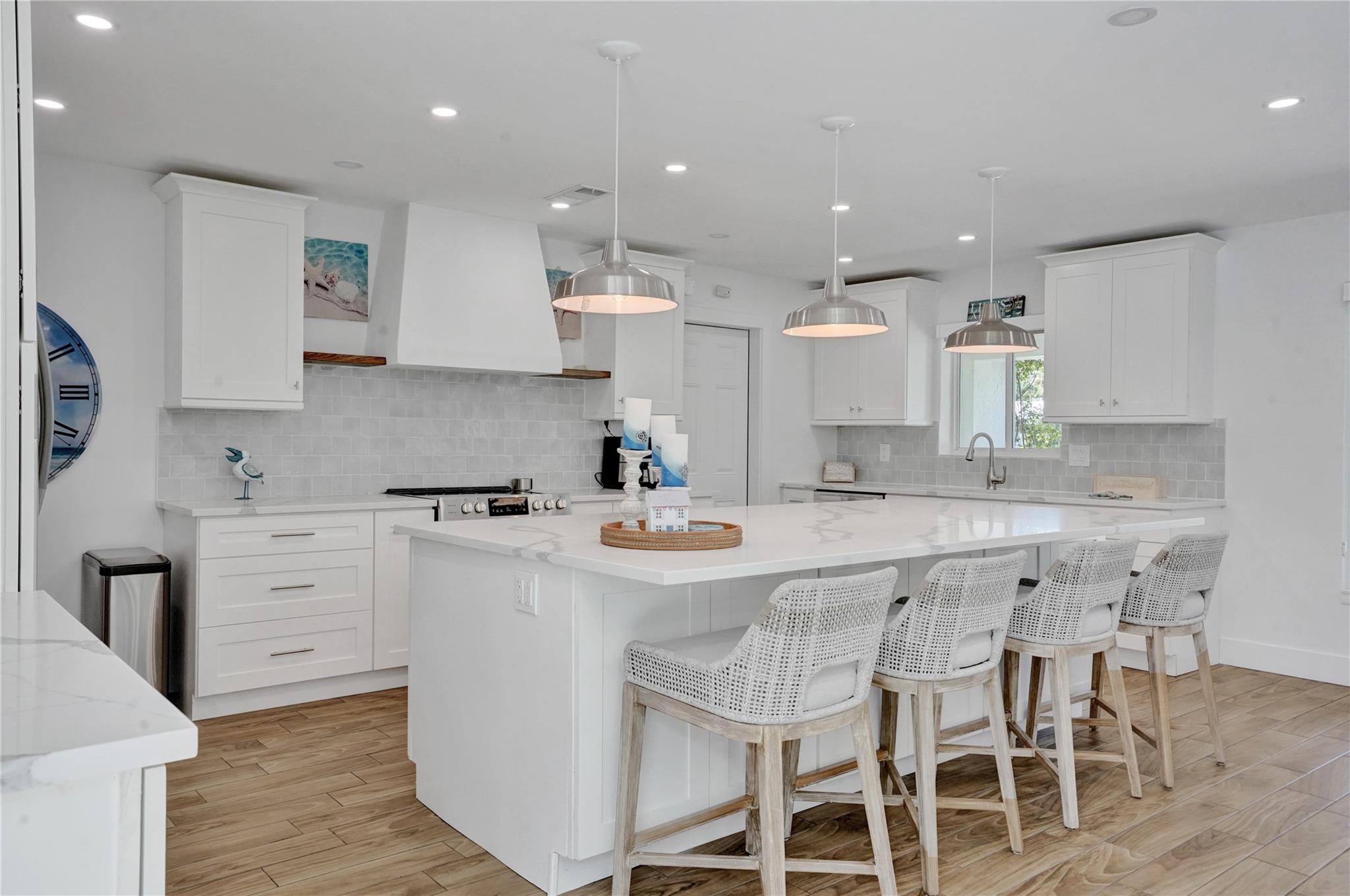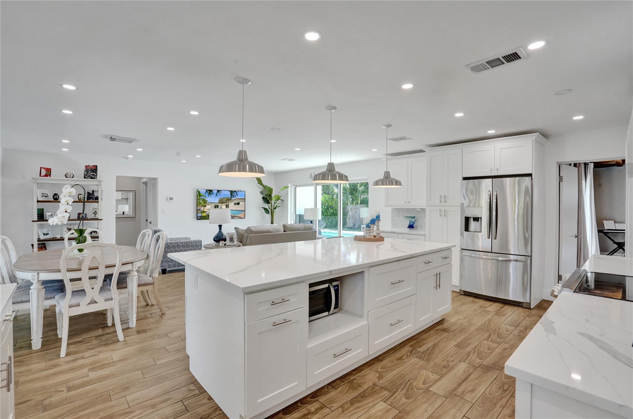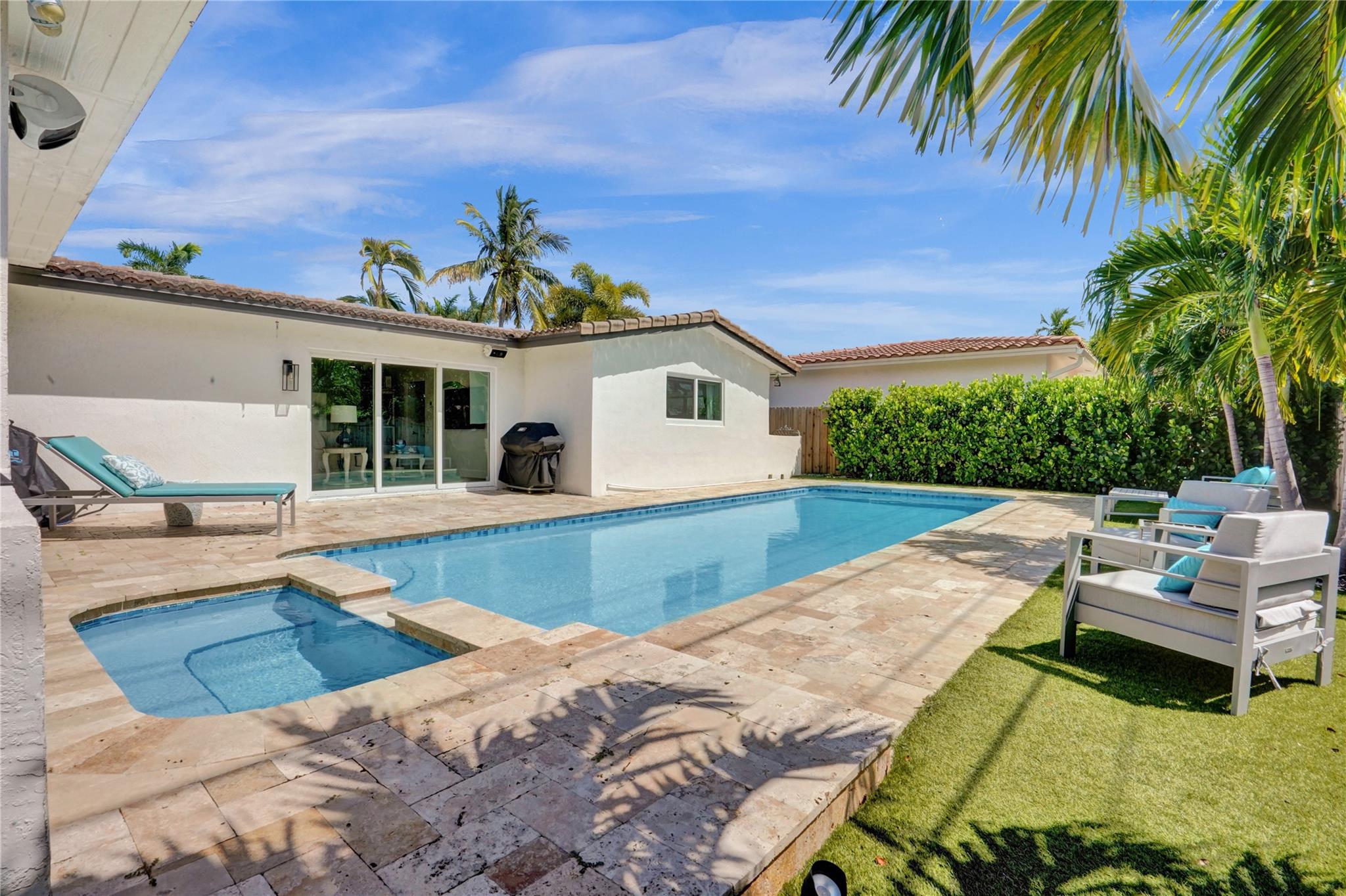 SELLER FINANCING AVAILABLE. Beautifully updated and spacious pool home features a split bedroom floor plan and two primary suites with wood-look porcelain tile throughout. Gorgeous, renovated kitchen with an expansive island, plenty of storage, quartz counter tops, stainless-steel appliances, tile back splash, and white shaker cabinets open to the spacious living and dining areas. All three bathrooms tastefully updated. This home also features impact windows and doors throughout, a whole house generator, a private fenced-in turf backyard with travertine patio surrounding the over-sized saltwater heated pool and spa, circular driveway and one car garage. This residence is ready for you to move in and enjoy! Great location just minutes to beach, shops, restaurants, schools and more!