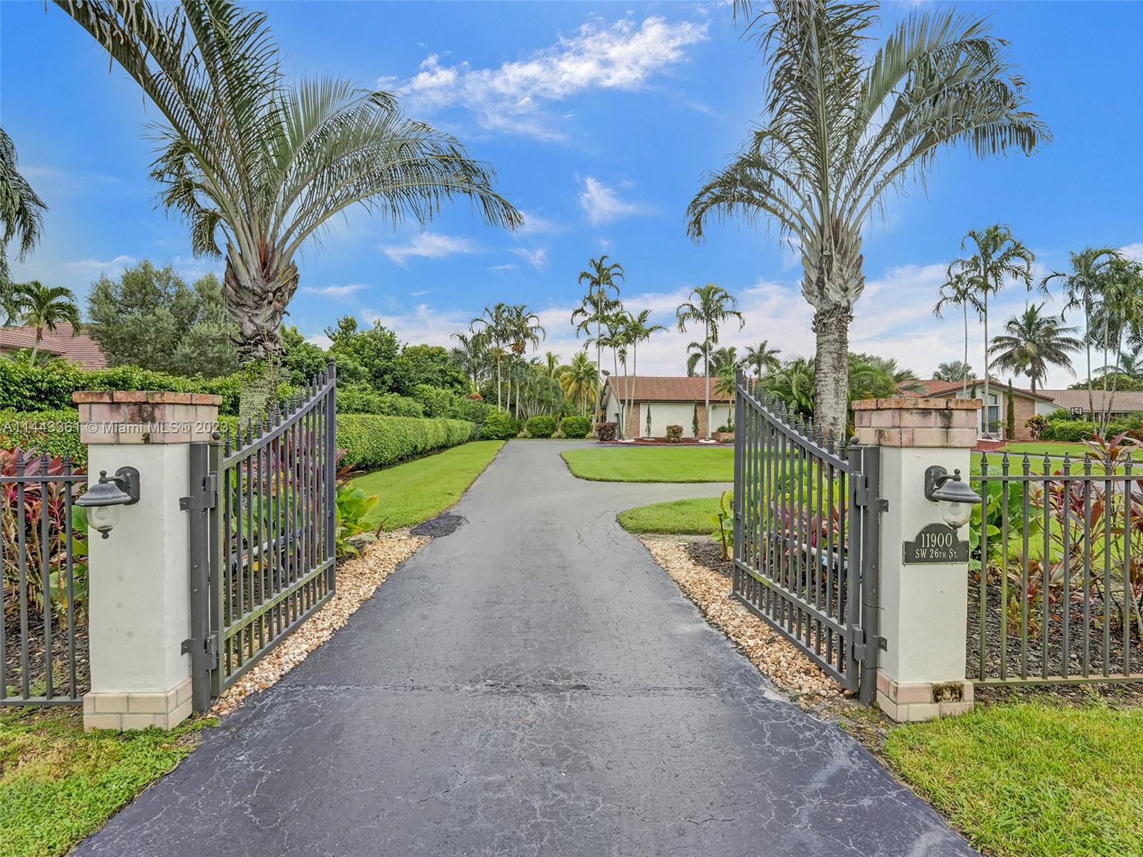 Come home to this captivating estate like entrance in the heart of sought-after Davie with close proximity to major highways & multiple top rated schools. As you enter through the private gates you feel the warmth of this home. This gorgeous property showcase a large, meticulously landscaped yard designed for both entertaining and leisure. The home features 4 bedrooms and 3 full baths, with a large master suite, hardwood flooring in majority of the home,bathrooms with marble & porcelain.The open floor plan is perfect for entertaining seamlessly blending indoor & outdoor spaces!The back of the house is walled mainly with glass allowing you to enjoy the serenity of backyard. Endless potential!! NO HOA, Fireplace is closed off at roof and can be reopened by new owner.Foyer light excluded.