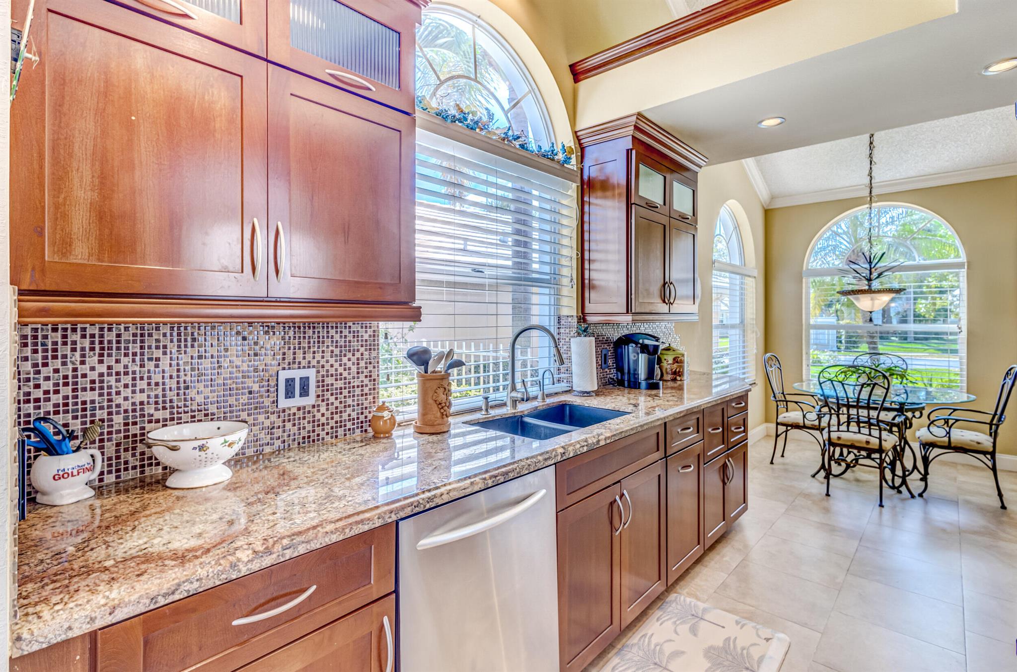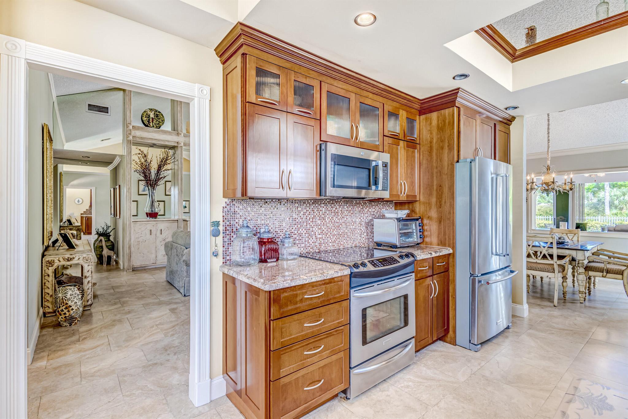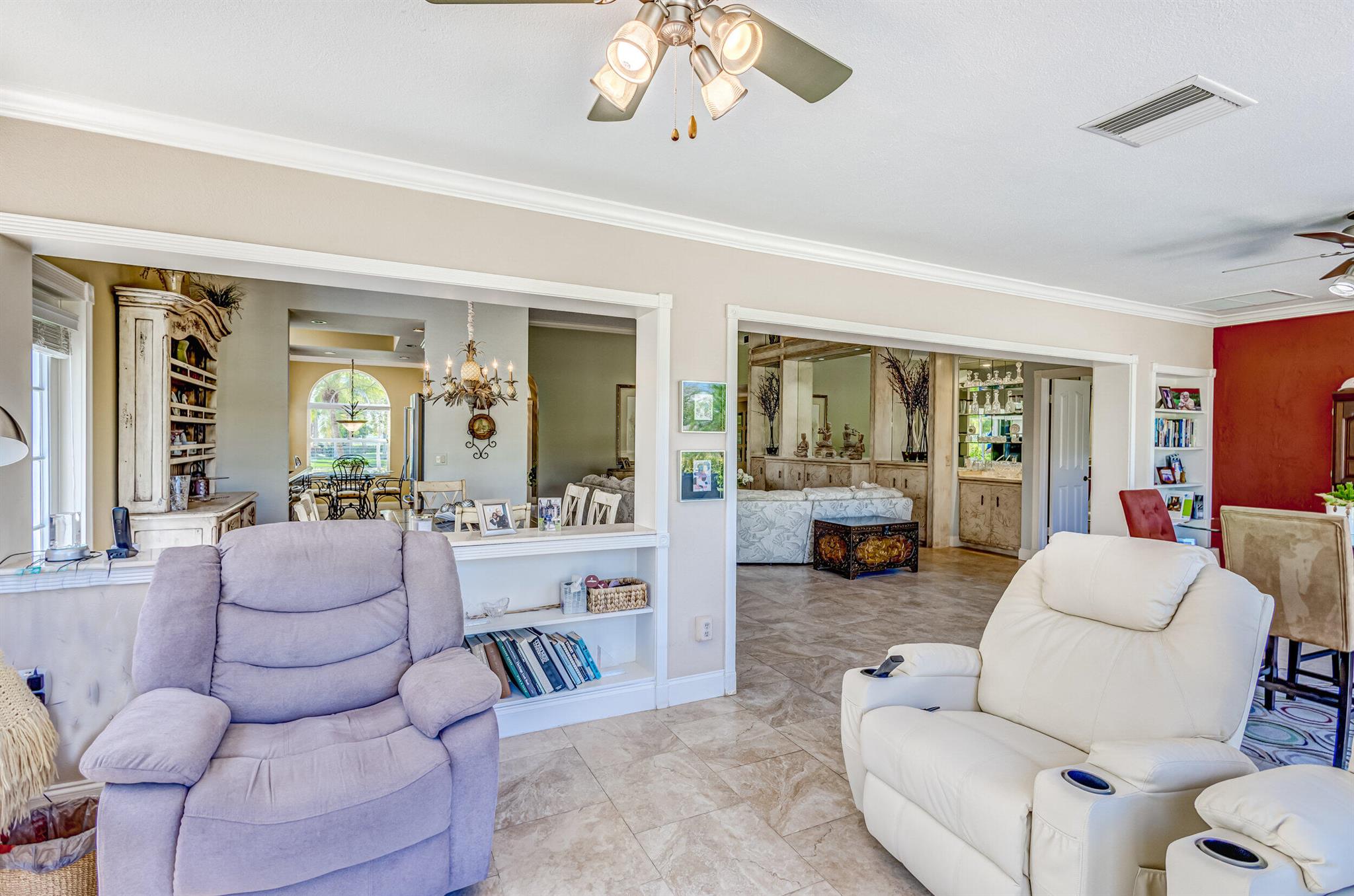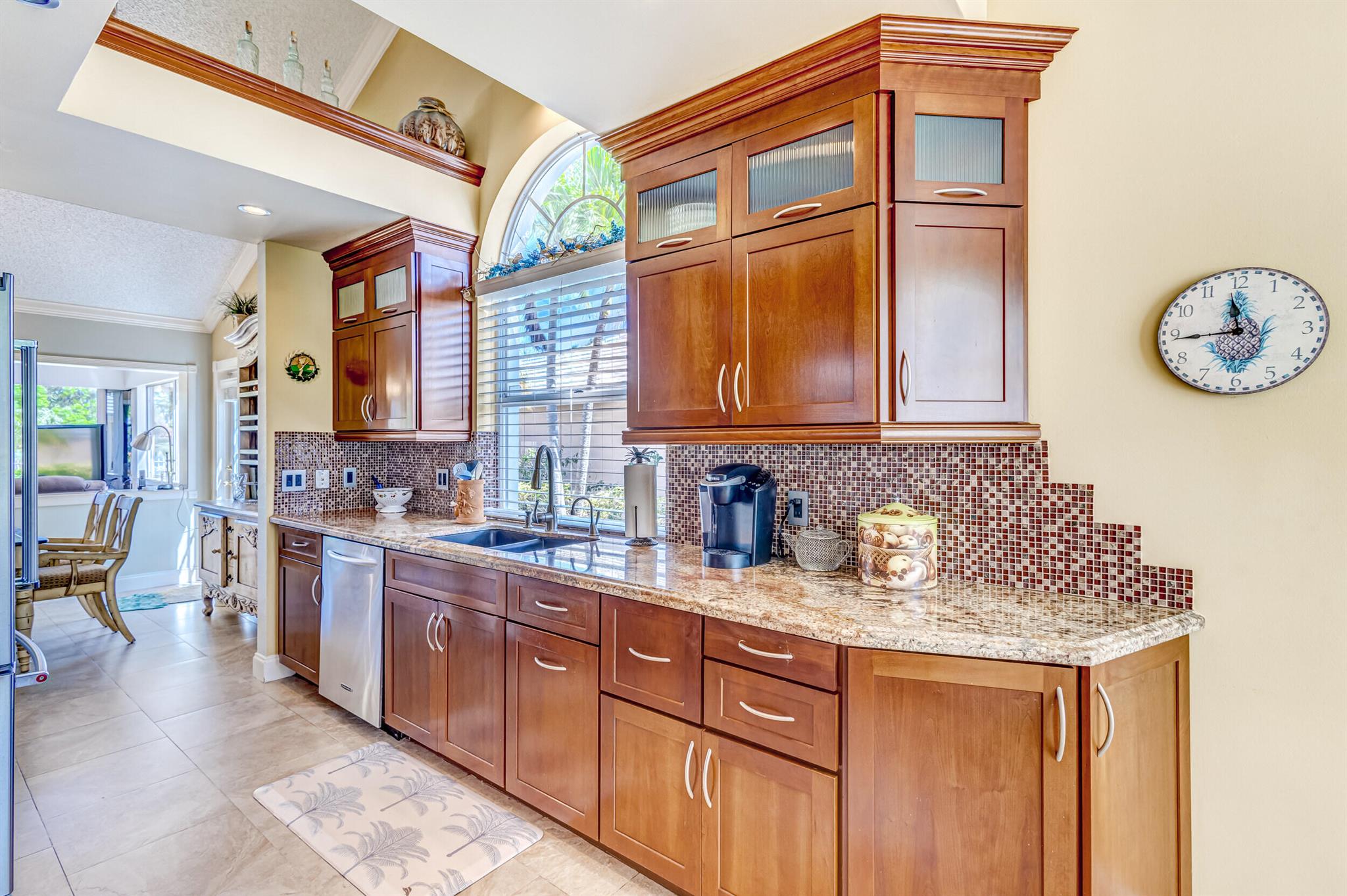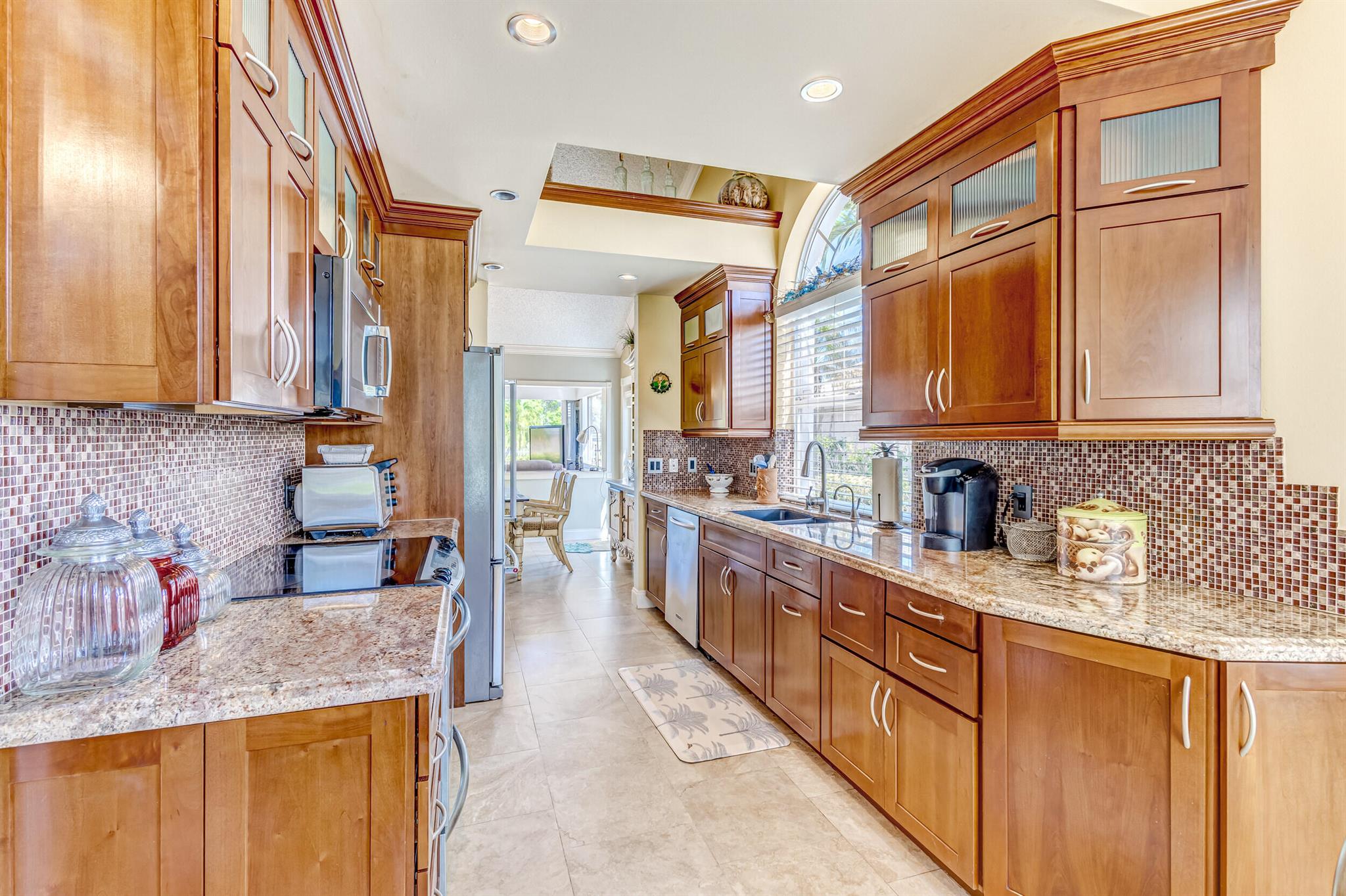 Lovely renovated home nestled on private OVERSIZED lot with sweeping views of the golf course and lake! This incredible single-story residence features 3 bedrooms, 2 full bathrooms, 2 car garage, extended lanai for added living area, located on one of the biggest lots in Saratoga Bay! Impressive upon entry, this open floor plan is awash with tons of sunlight and natural hues, vaulted ceilings, crown molding, beautiful tile inlay design at foyer, and separate dining and cozy breakfast areas. Spacious kitchen perfectly equipped with custom wood cabinets encased in matching crown, Kitchen Aid stainless steel appliances including French door refrigerator, granite counters and decorative tile backsplash. Generous living/great room offers built-in shelves and entertainment center, mirrors,