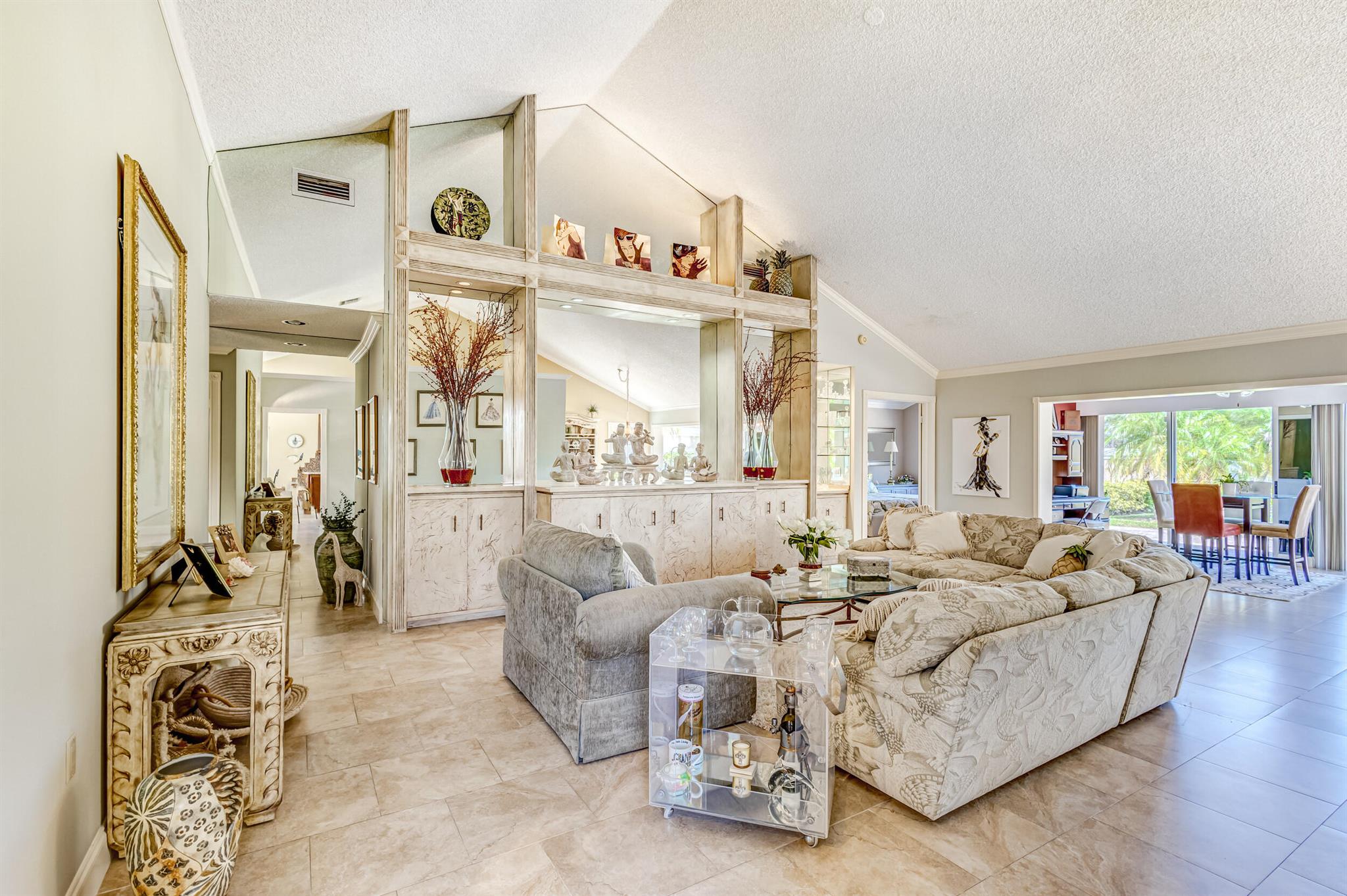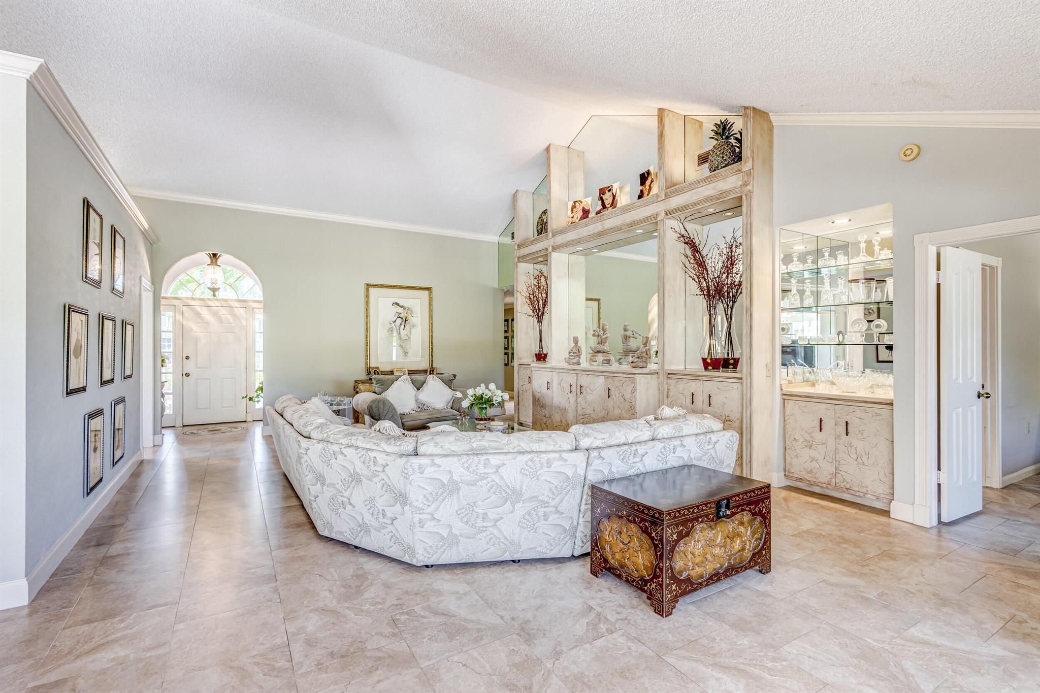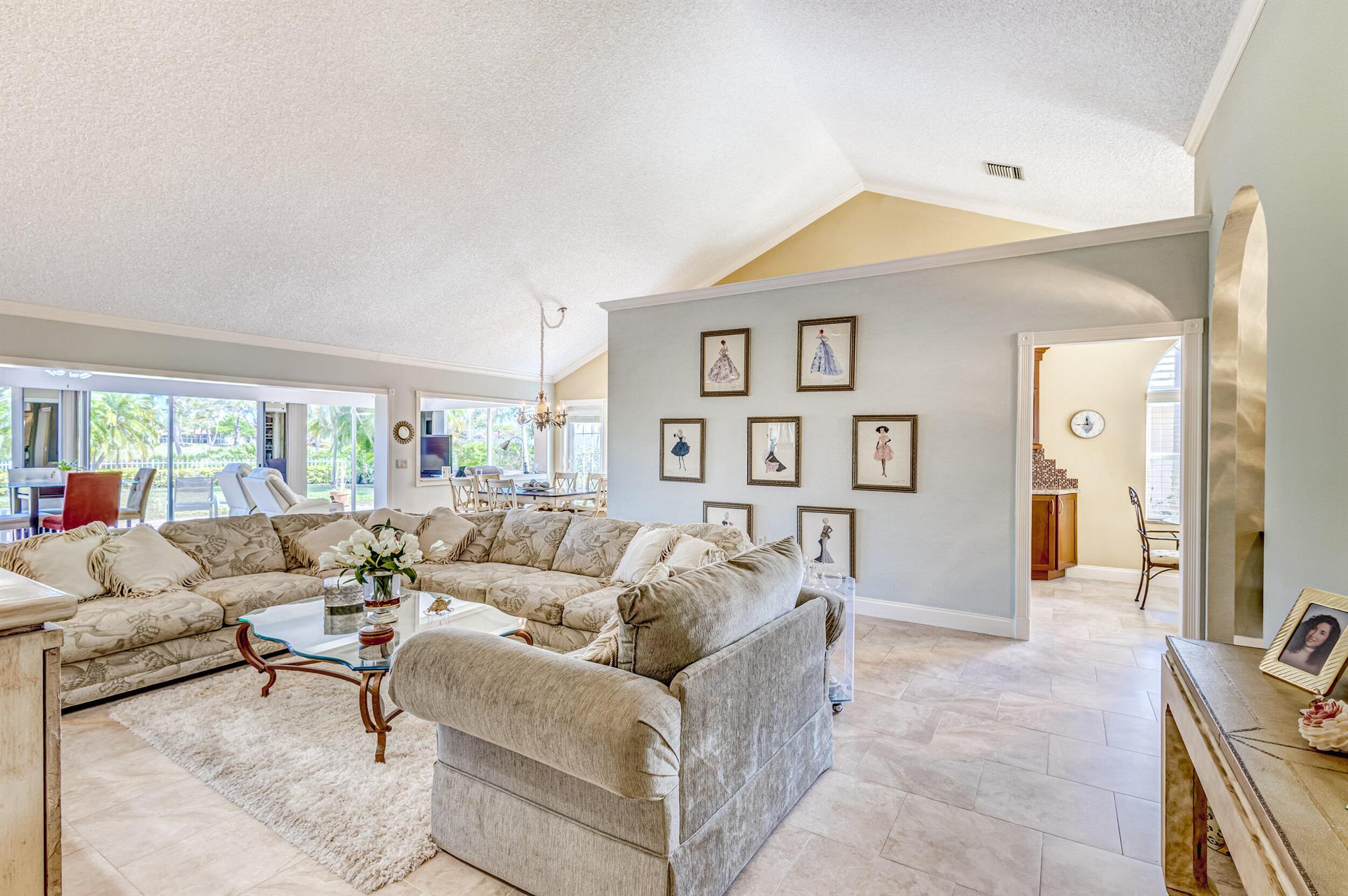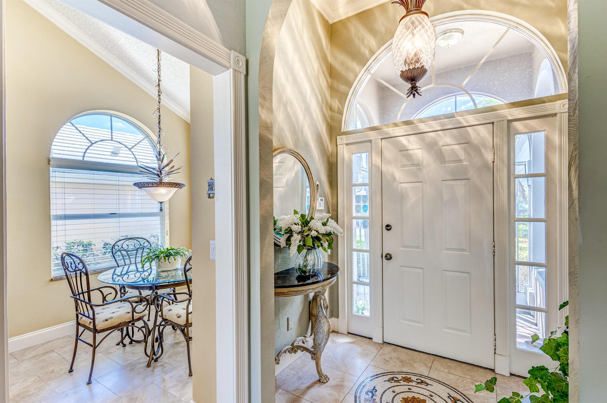 Lovely renovated home nestled on private OVERSIZED lot with sweeping views of the golf course and lake! This incredible single-story residence features 3 bedrooms, 2 full bathrooms, 2 car garage, extended lanai for added living area, located on one of the biggest lots in Saratoga Bay! Impressive upon entry, this open floor plan is awash with tons of sunlight and natural hues, vaulted ceilings, crown molding, beautiful tile inlay design at foyer, and separate dining and cozy breakfast areas. Spacious kitchen perfectly equipped with custom wood cabinets encased in matching crown, Kitchen Aid stainless steel appliances including French door refrigerator, granite counters and decorative tile backsplash. Generous living/great room offers built-in shelves and entertainment center, mirrors,
