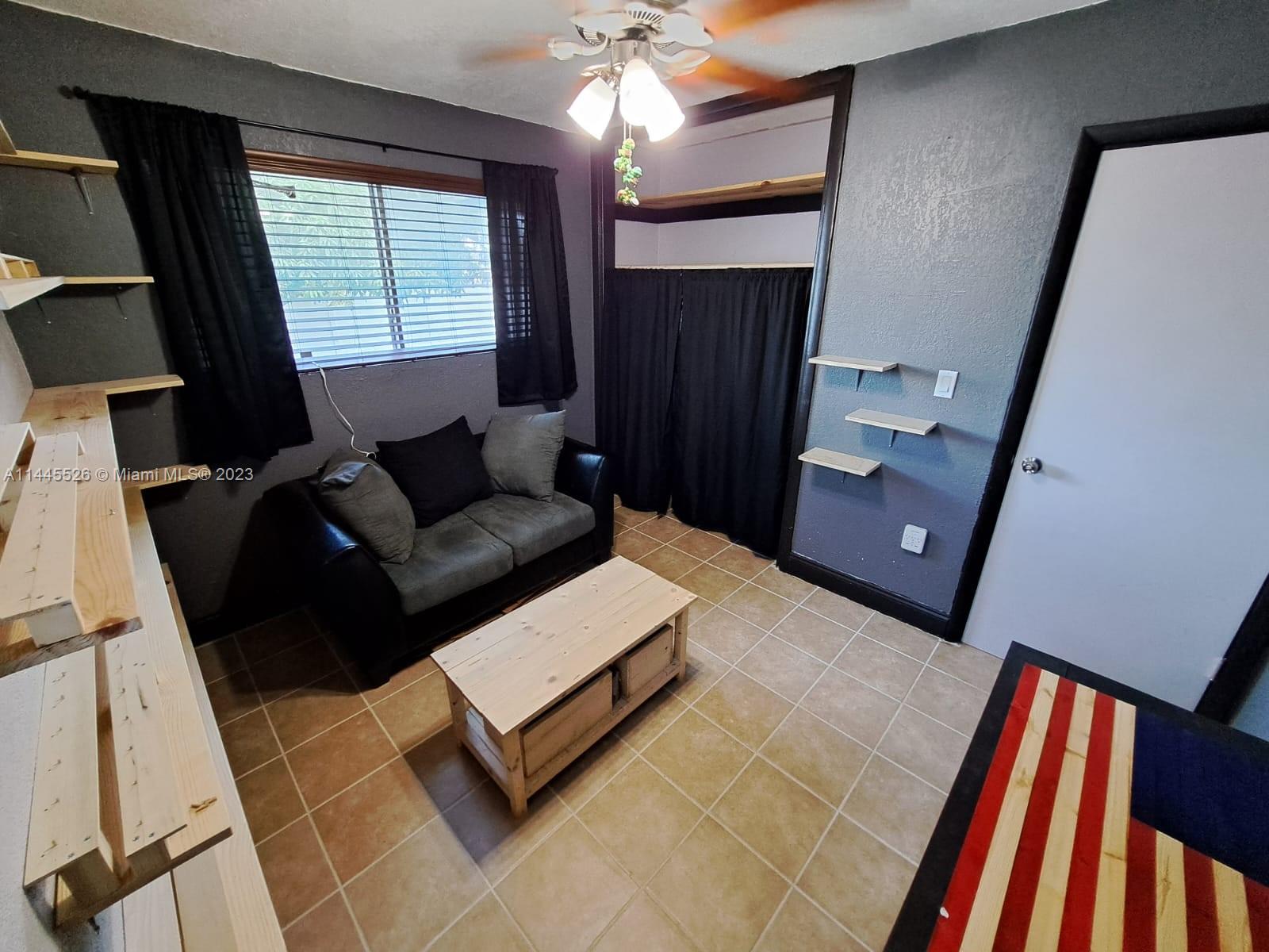 Lovely 2/1 with a circular driveway and plenty of room for addition and a pool. This house has an Open Floor plan with a Granite countertop in the Kitchen. Tiled throughout with entrance and bar with laminate floors. Bathroom with marble vanity top. All windows have hurricane shutters. The fridge and Microwave were replaced 2019. The roof is 2 years old (6/28/2021). The Gutters were replaced in 2021. HVAC system is 3 Years old (9/15/2020). The water heater was replaced in 2014. New White Vinyl Privacy Fence installed -4/20/2021. The Lawn Sprinkler Pump was replaced in 2020. Removable fire pit. Very Large backyard with Mango and Avacado trees. Shed in the back does not convey.