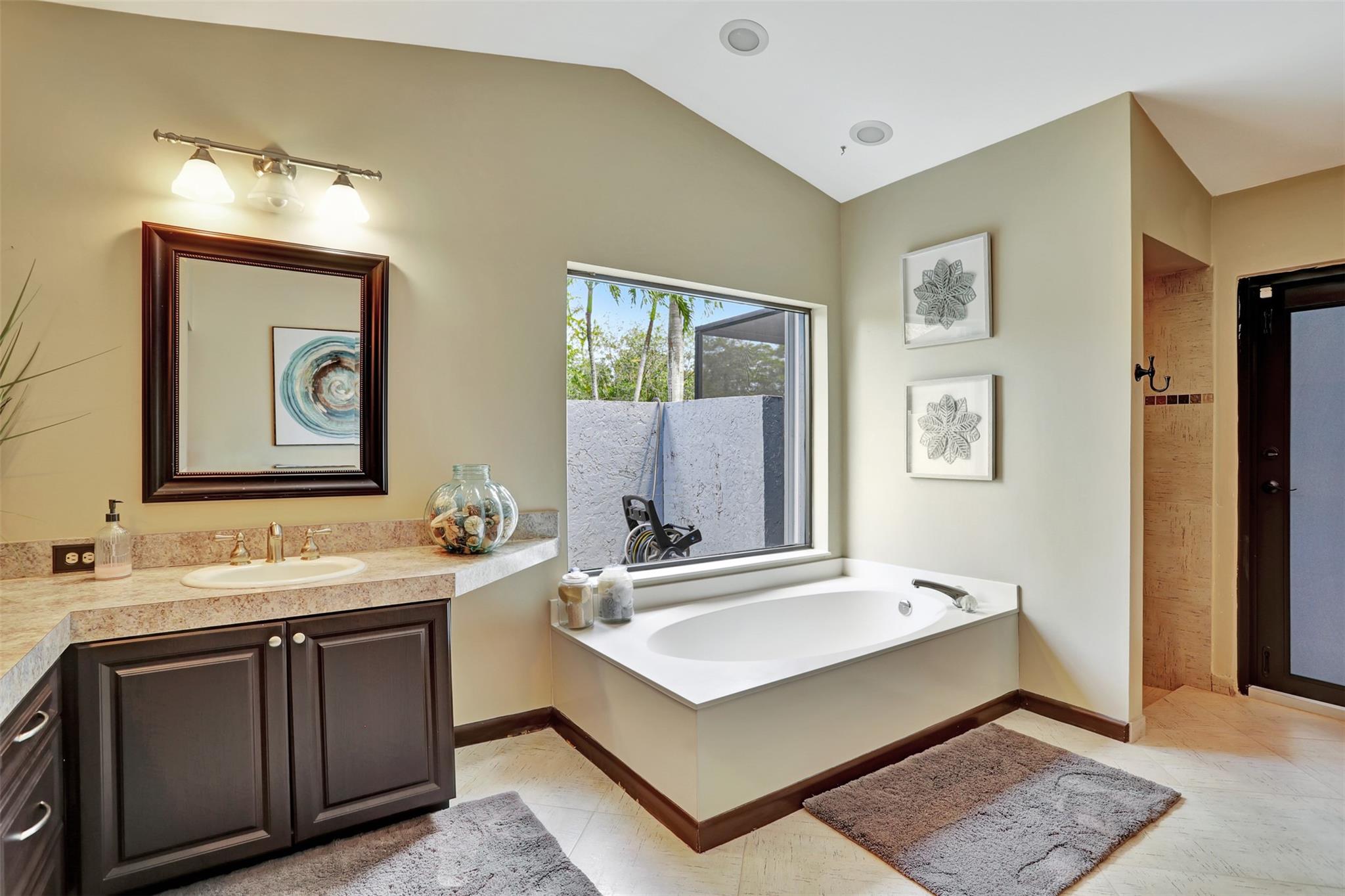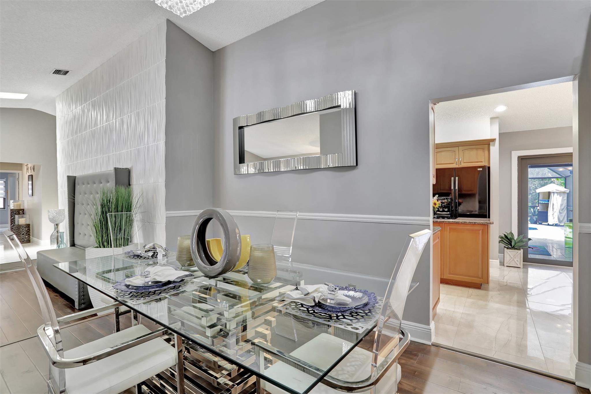 Brilliantly Remodeled Waterfront Home with Private Pool! Tucked away in an established community just moments from Coral Park Elementary, this 4BR/2.5BA residence emanates upscale vibes with tropical landscaping, a beautiful brick façade, vaulted ceilings, attractive wood and porcelain flooring, an elegant formal dining room, an expansive living room w/feature wall, and an entertainment-friendly kitchen boasting granite counters, built-in wine refrigerator, breakfast nook, and an adjoining family room. Host outdoor soirees with a screened-in pool, covered lanai, and serene water views. Retire to the oversized primary bedroom, which dazzles with dual walk-in closets and a spa-like en suite. Other features: 2-car garage, half-circle driveway, laundry room, near shops, and more!
