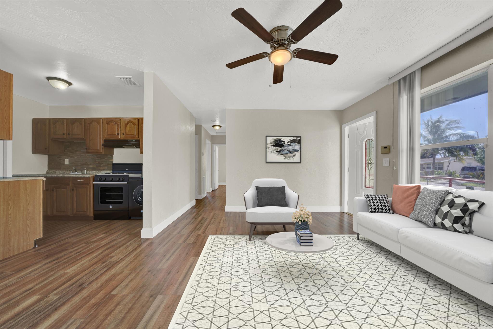 LOCATION, LOCATION, LOCATION! This one of a kind 3 bedroom, 1 bath single family CBS home in Roosevelt Estates. Whether you're looking to start or add to your investment portfolio, AirBNB or looking for a new residence, this is the one for you. Freshly painted interior & exterior boasting newer vinyl plank flooring throughout the house with newer baseboards, light switches & outlets, newer kitchen cabinets & counter tops, windows, vanities, ceiling fans, thermostat along with an upgraded bathroom. Utility room equipped with a gas water heater, panel shutters along with a dryer hookup with the possibility of adding the washer machine as well. This home is within close proximity to Outlet, CityPlace, Downtown, Live Arts, Brightline & Tri-rail stations, WPB airport & minutes from the beach.