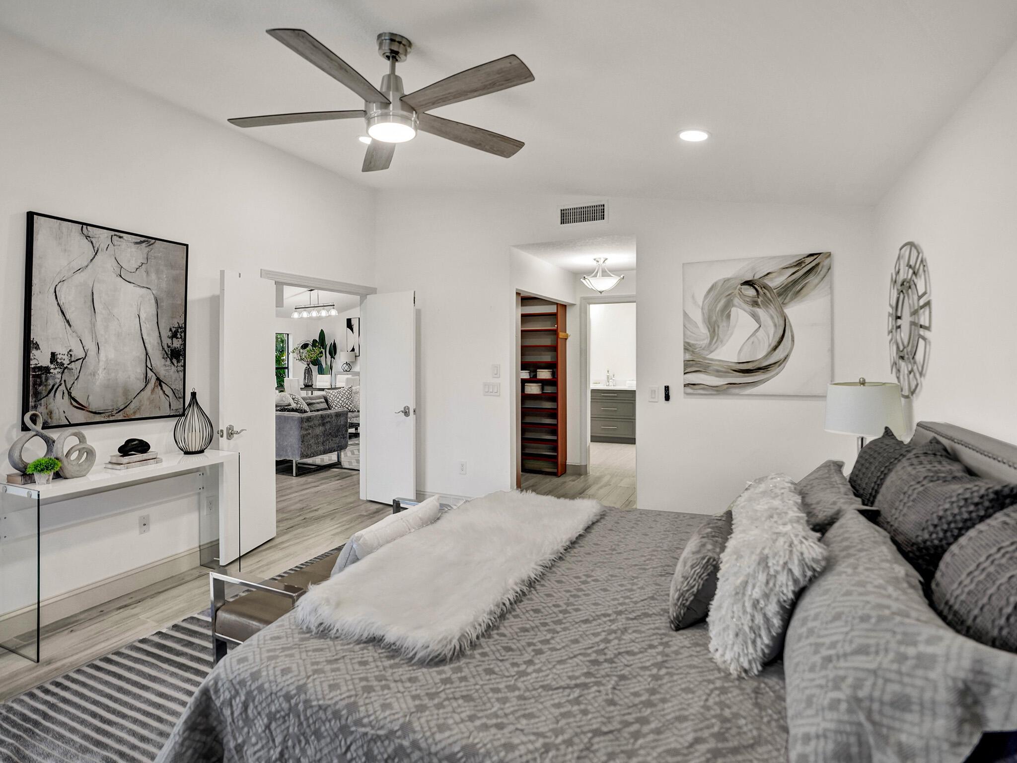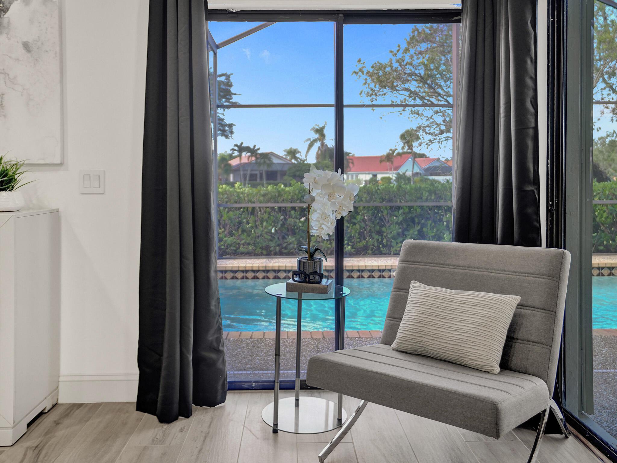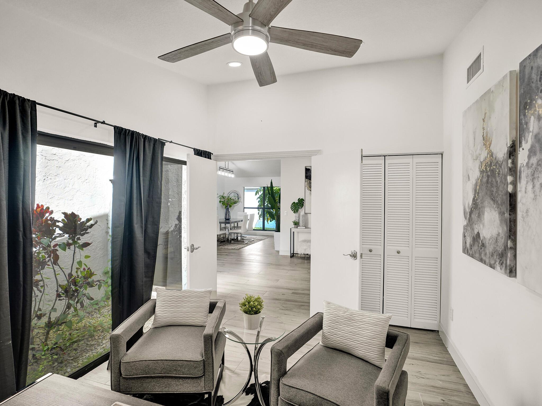 Stunning 2 bedroom PLUS den with golf view in prestigious Boca Woods Country Club. Elegantly remodeled with sleek and bright finishes. 11.5' ceilings in the great room and atrium. Natural light is abundant. Gourmet kitchen features stainless steel appliances, gorgeous white cabinets with gray quartz countertops, a large 9' x 3' island with enough seating for 4 at the bar plus a breakfast area. Master suite with a view of the pool has 2 completely outfitted walk-in closets and a luxury bath with skylight, large shower and vanity. Enjoy the view of your pool and the lush green golf course from your living room, kitchen, breakfast area and dining room. Seller is offering a $25,000 credit towards Boca Woods Golf Membership to enjoy the stunning newly renovated clubhouse and tennis courts.