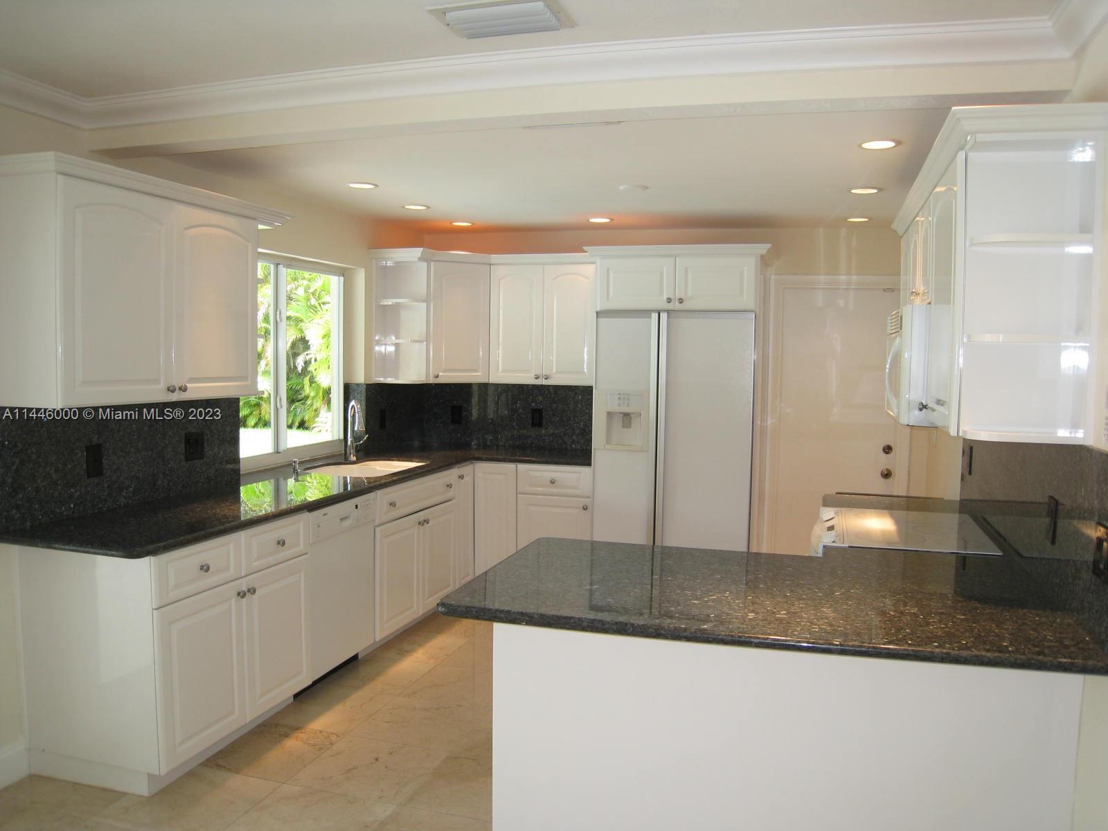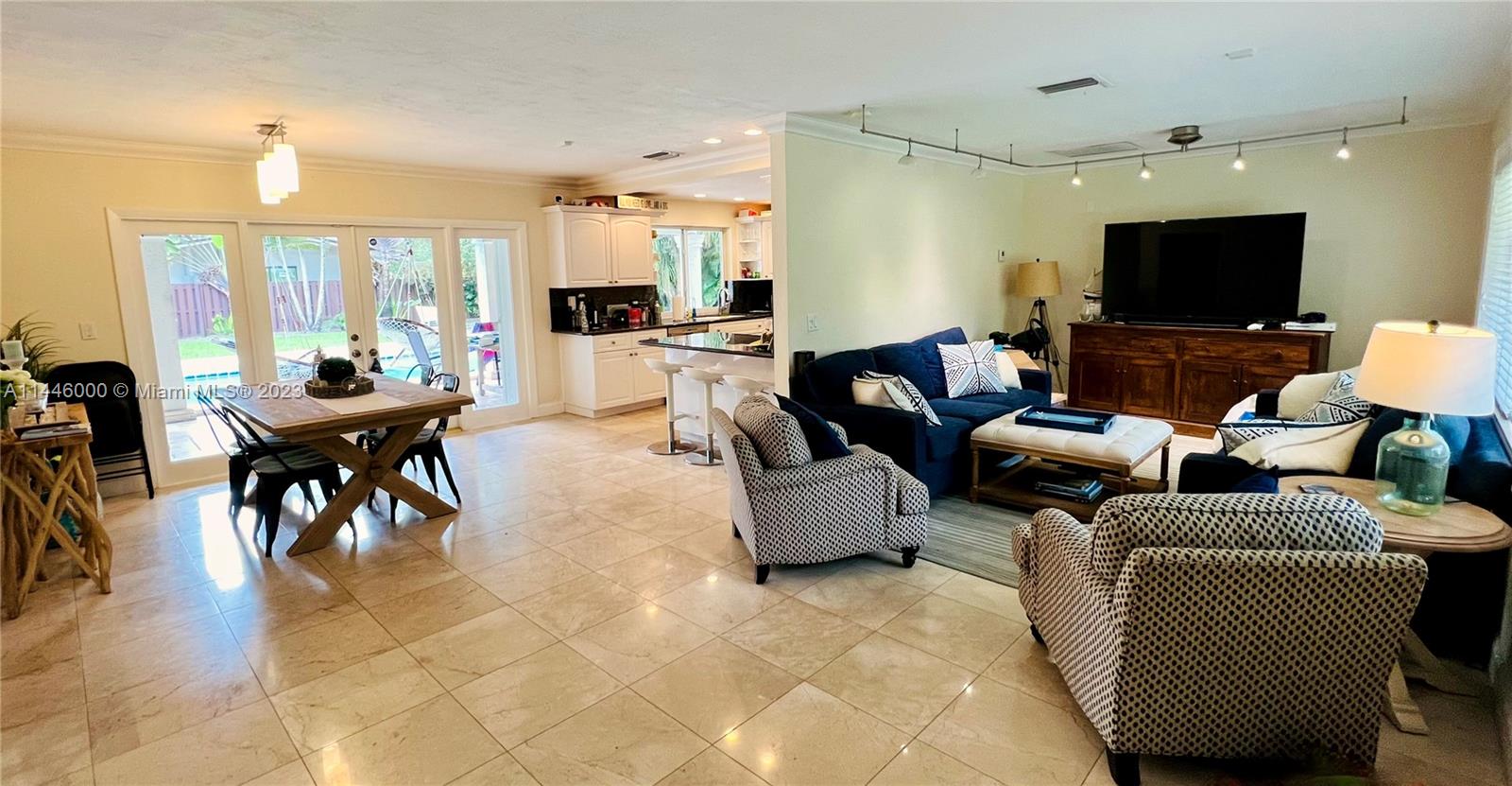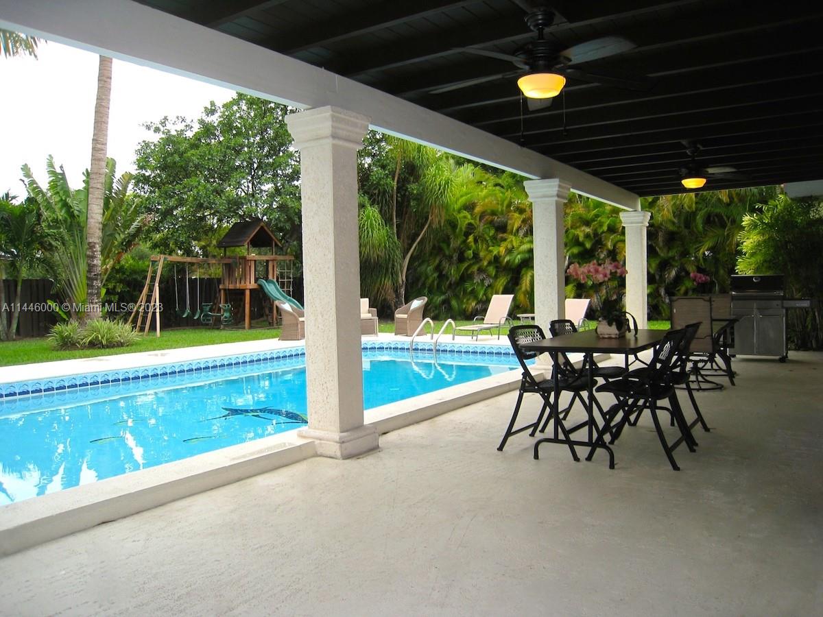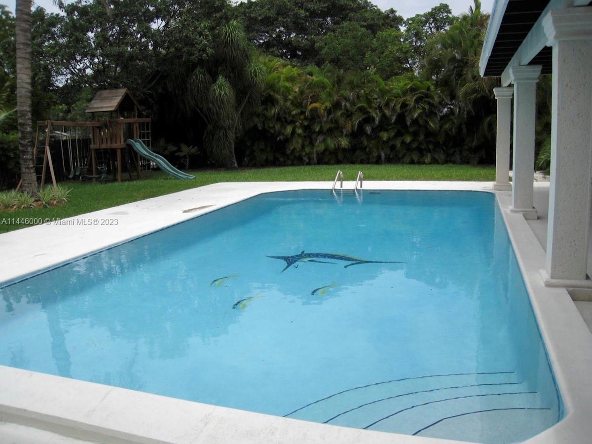 Perfect family home in North Pinecrest on a quiet, family friendly street. Excellent school district and nearby parks. 5 bedrooms with wood floors and marble in living areas. Beautiful kitchen and baths and well maintained. French doors wrap around covered patio overlooking pool and landscaped yard in a private setting. Impact windows, accordions and generator hook-up.