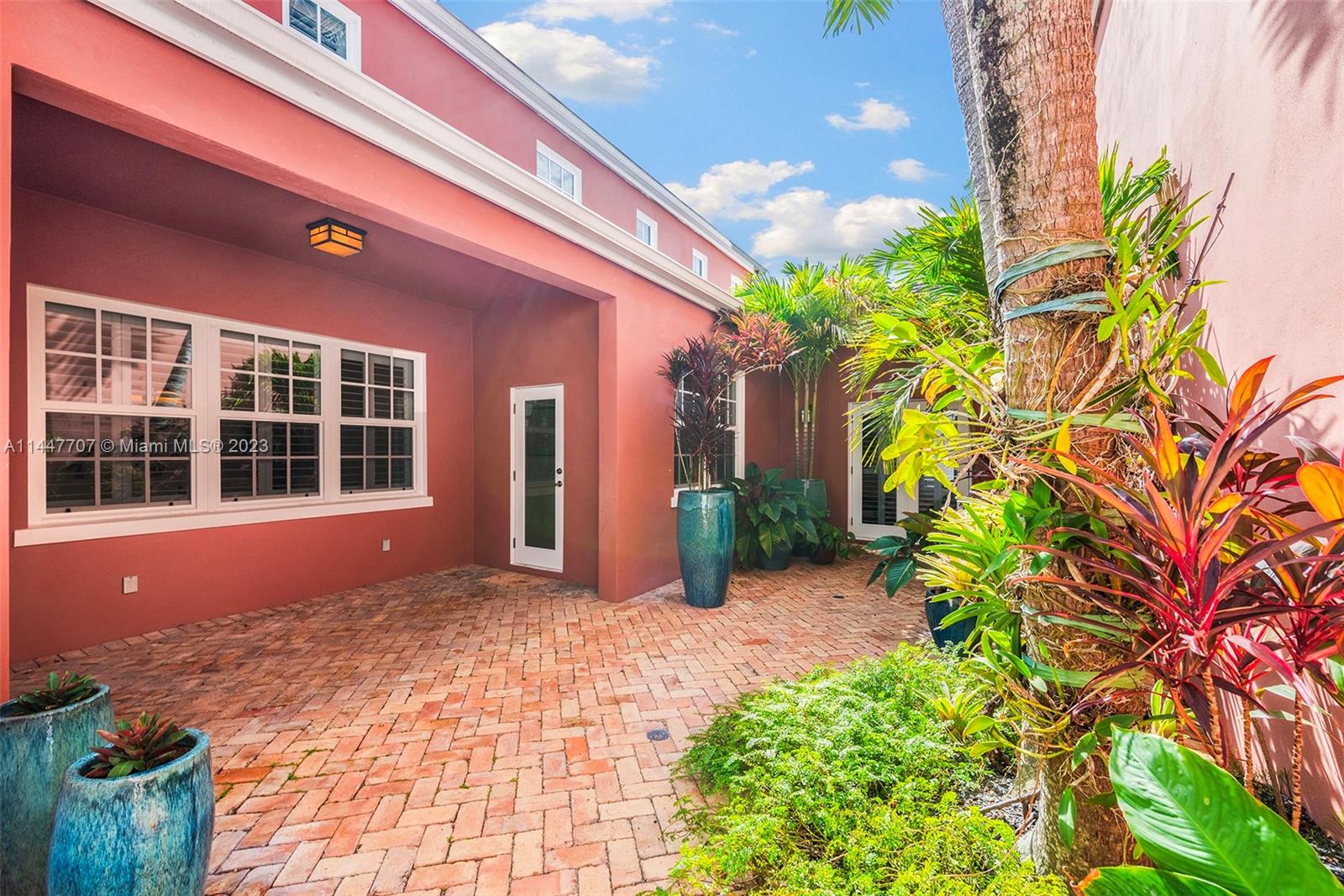 Crafted in the spirit of George Merrick's famous exotically themed Gables neighborhoods this tropical Bermuda style modern townhome delivers serene private courtyard-style living on a quiet tree-lined street with the convenience and desirability of a central Gables location. Through the front gate a lush private courtyard leads to a formal foyer entrance & sunlit great room w/ volume ceilings. From there a stunning marble kitchen, formal dining room, & 1st floor primary suite w/ luxe marble bath, 2 en-suite beds upstairs+bonus office space. 2-car garage with ample built-in storage, alarm system, wine fridge, stylishly chic new floors, California Closets throughout. Walk to Merrick Park, minutes from downtown Coral Gables, Coconut Grove, & South Miami. Rare chance to own in Bermuda Village!