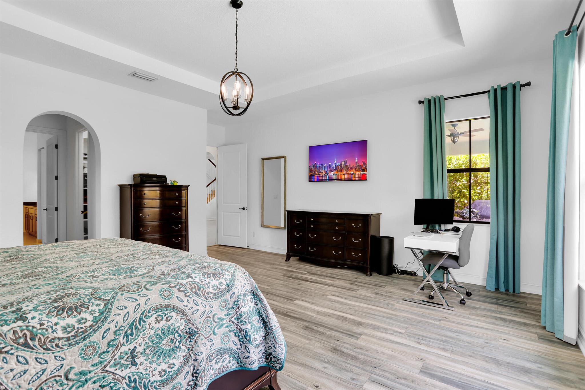 MOTIVATED SELLER! MODERN & SPACIOUS 4 bedroom 4.5 bathroom POOL home with Open Floor Plan. PRIMARY BEDROOM DOWNSTAIRS. Office/Den downstairs. This home features designer detaiils. Ceramic tile, custom arches & exposed beam ceilings. Hurricane impact windows & doors. Gourmet kitchen features stainless steel appliances, granite countertops & oversized island with bar seating. Ground floor owner's suite offer bath with dual vanities, sep tub & shower. 2 walk-in closets. Outdoor space includes covered terrace, sundeck & pool with water feature. Fencing & lush landscaping offer added privacy. Upstairs bonus loft area plus expansive outdoor balcony. Resort-style community amenities include lakeside pool & spa, clubhouse, fitness studio, tennis,/basketball courts, dog park, A Rated schools