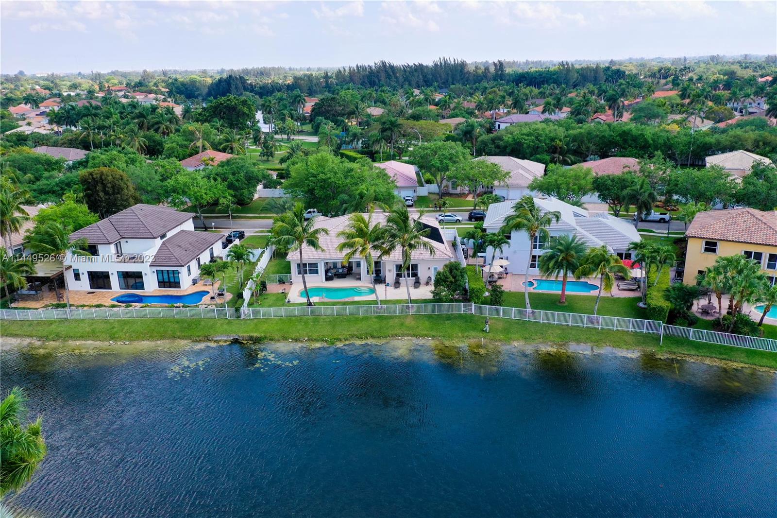 Amazing 4 Bed/3 Bath home located in the gated community of Windsor Palms. Enjoy beautiful lake views, heated swimming pool in a fenced backyard with 2 mango trees. One of the baths is connected to the pool patio. Primary Bath has dual vanities and sinks, bidet, separate tub and shower. This home includes a full house generator, solar panels to heat the pool and home theater system installed in family room. One room converted into home office with floor to ceiling wood bookcase. Stainless steel kitchen appliances (double oven) and granite counter tops, ceramic tile through out the home. 3 car garage, the doors replaced in 2023, Accordion shutters, Electric Porch Awning, Water Heater in 2020, Plumbing replaced in the home 2022.