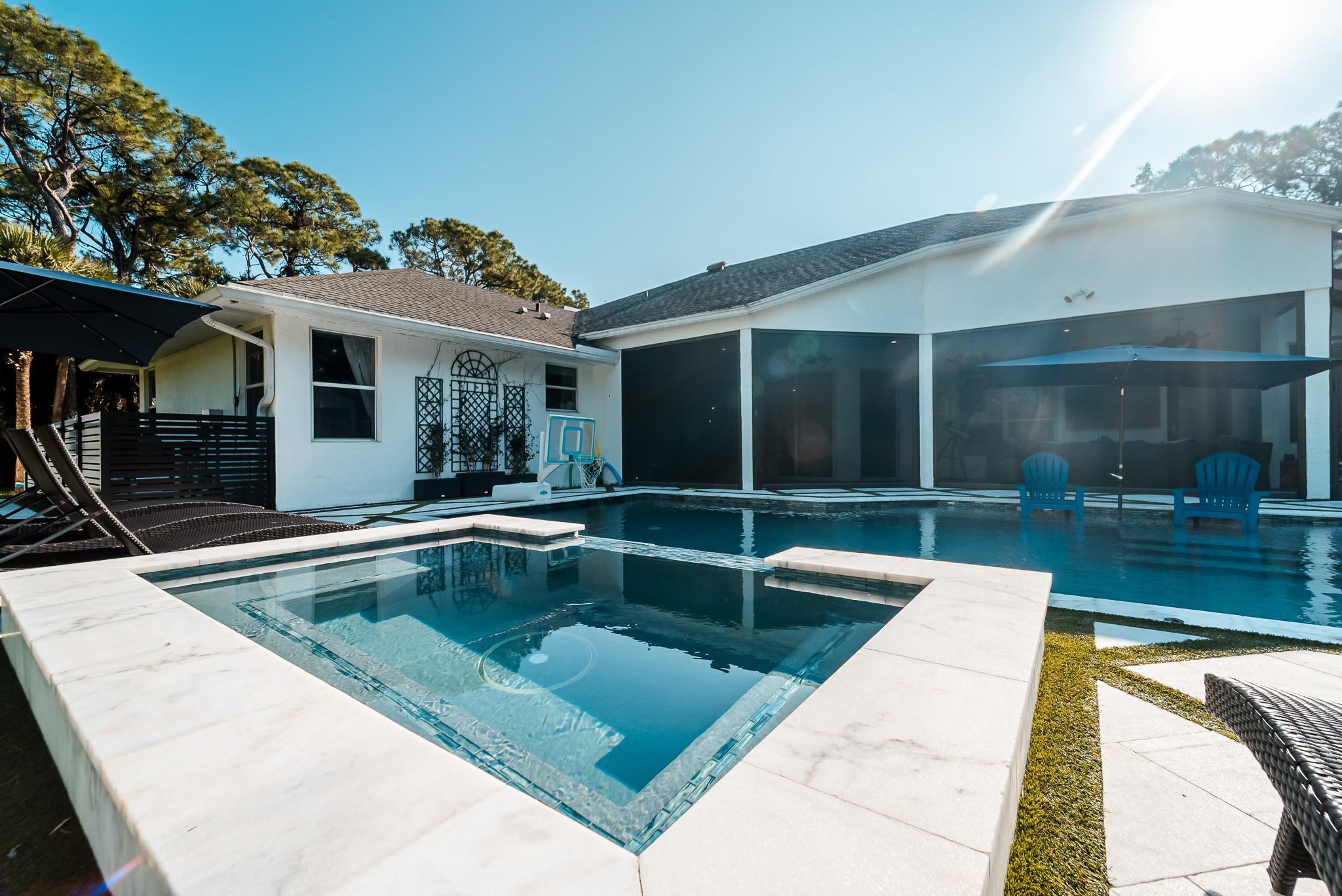 Welcome to this Beautiful Estate Home in the Highly Desirable Palm Beach Country Estates neighborhood sitting on 1.17 acres. This 4 Bedroom + Den/Office, Formal Living Space, Family Room, 2 and 1/2 Bath home features vaulted ceilings throughout and boasts over 2500 square feet of living space. **New Roof In Progress** A tastefully remodeled Kitchen offers an open concept living space wonderful for families and entertaining. The Outdoor Pool and Spa was renovated in 2020 with turf and pavers to surround updated pool and spa. Motorized Screens installed in 2020 to offer a screened in Lanai Covered Patio and Enjoy a game of Pickleball or Basketball on your very own court in your backyard. HVAC and Water Heater updated 2021. 12 x 24 foot Storage Shed on property will convey.