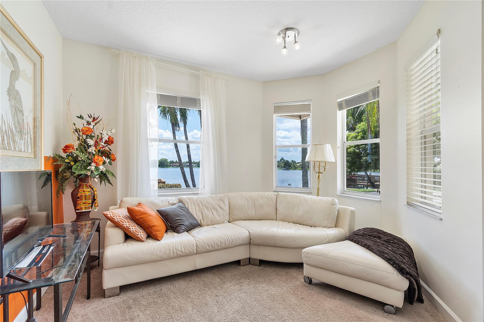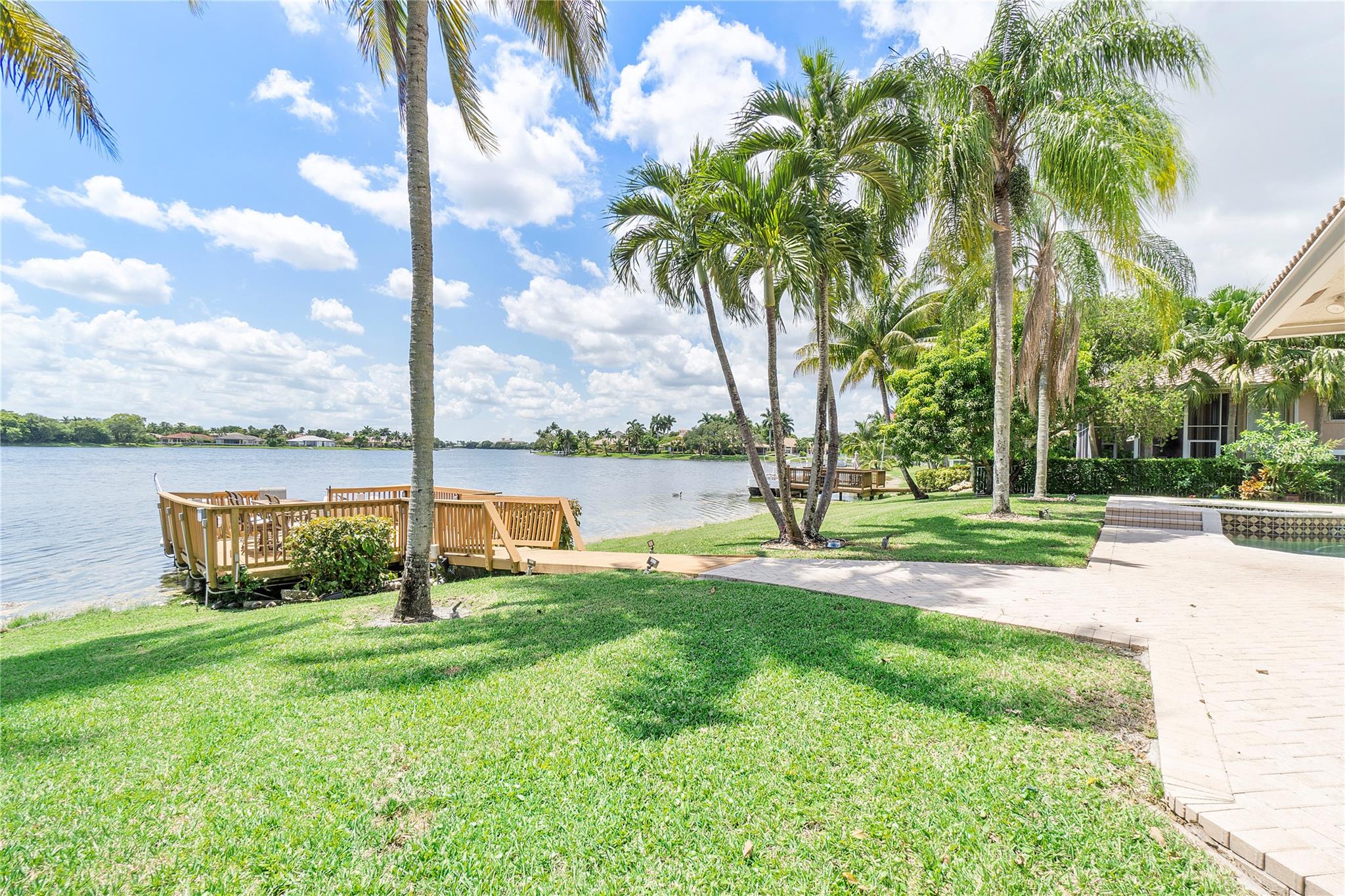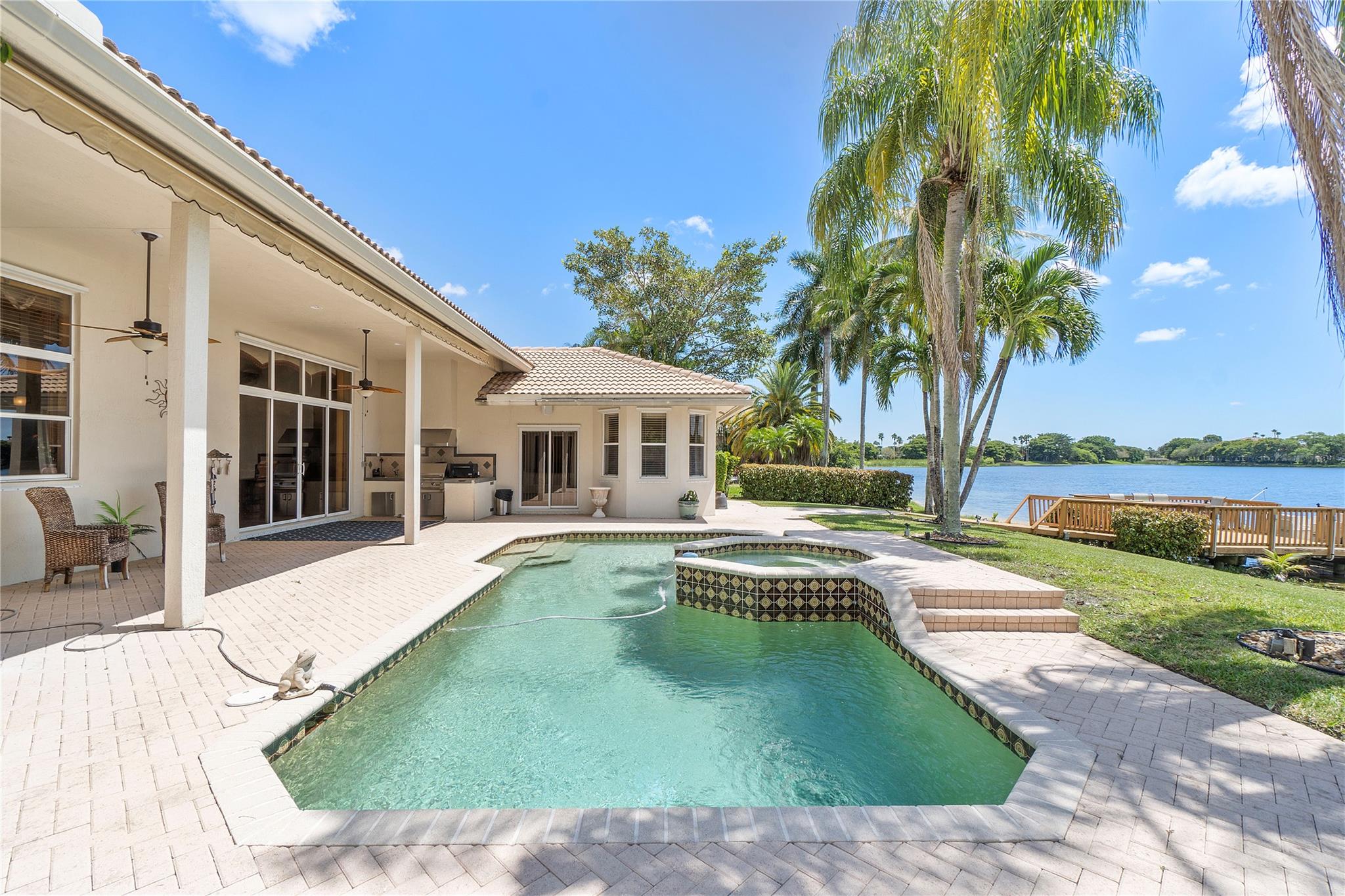This 4 bedroom, 3.5 bathroom oasis has breathtaking views of 125 acre Lake. Boasting a circular driveway and 3 car garage, this spacious home features laminate floors throughout and carpeted bedrooms, recessed lights, surround sound speakers, and a bar with wine cooler. The kitchen is adorned with granite counters, a center cooking island, breakfast area, pantry and wood cabinets. With a spacious dining and living room, this triple split floor plan offers privacy and comfort. Relax in the large primary bedroom with sitting area and indulge in luxury with a large built-out walk-in closet. This tropical paradise also features a pool and hot tub in the backyard overlooking a huge lake perfect for boating. Enjoy the summer kitchen for BBQs with delicious mango and avocado trees.