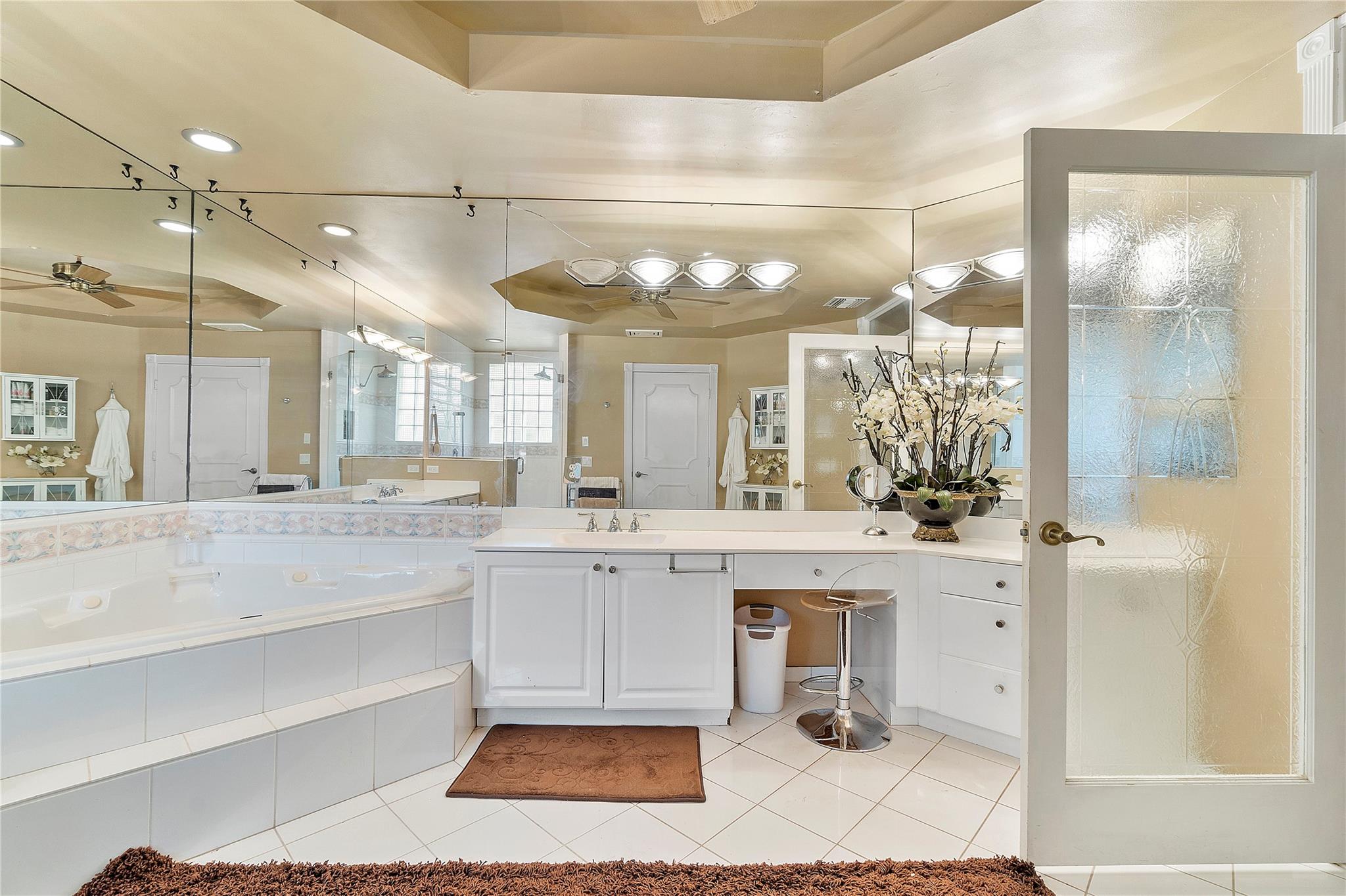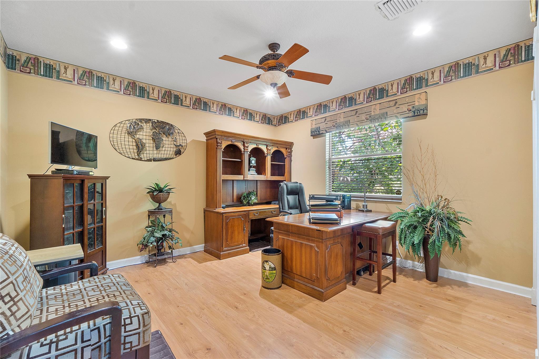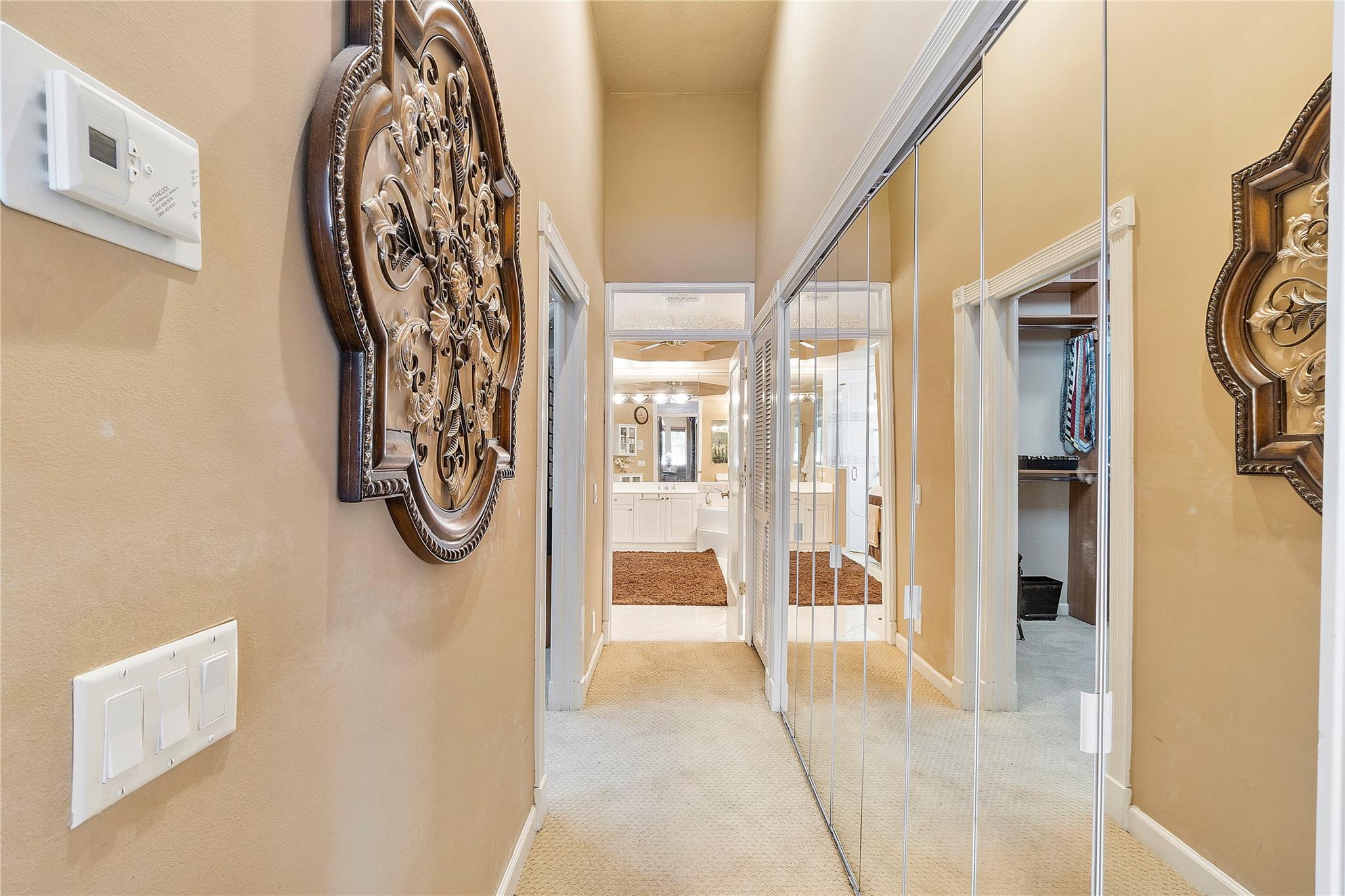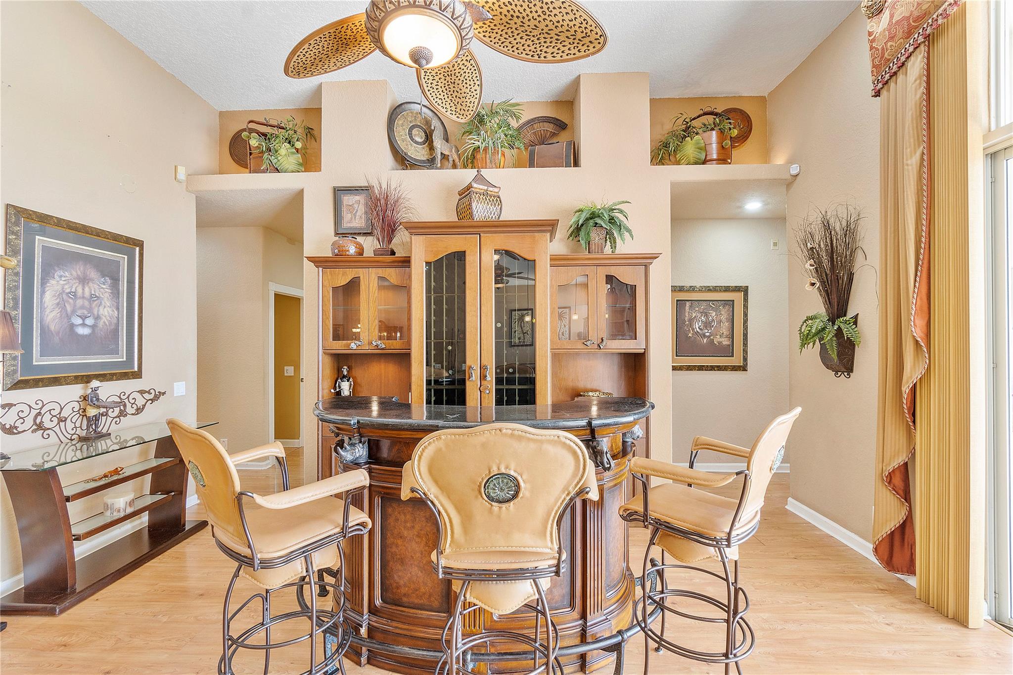 This 4 bedroom, 3.5 bathroom oasis has breathtaking views of 125 acre Lake. Boasting a circular driveway and 3 car garage, this spacious home features laminate floors throughout and carpeted bedrooms, recessed lights, surround sound speakers, and a bar with wine cooler. The kitchen is adorned with granite counters, a center cooking island, breakfast area, pantry and wood cabinets. With a spacious dining and living room, this triple split floor plan offers privacy and comfort. Relax in the large primary bedroom with sitting area and indulge in luxury with a large built-out walk-in closet. This tropical paradise also features a pool and hot tub in the backyard overlooking a huge lake perfect for boating. Enjoy the summer kitchen for BBQs with delicious mango and avocado trees.