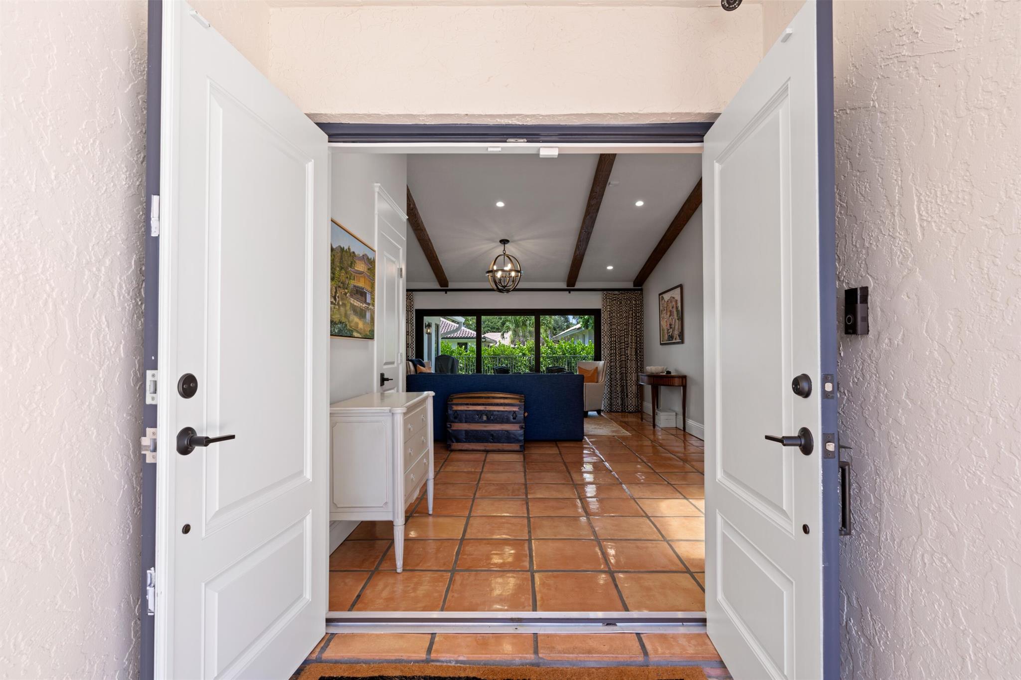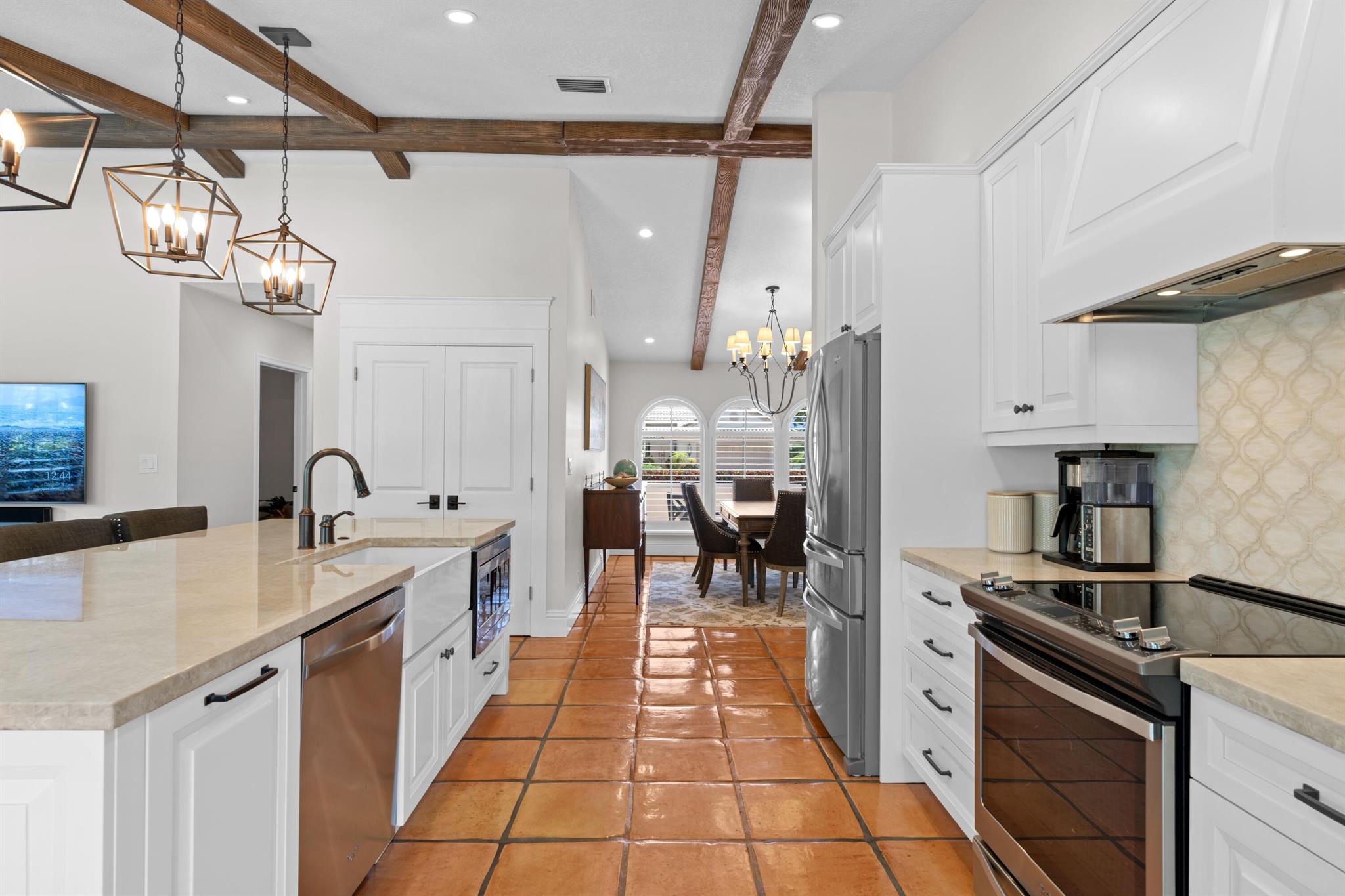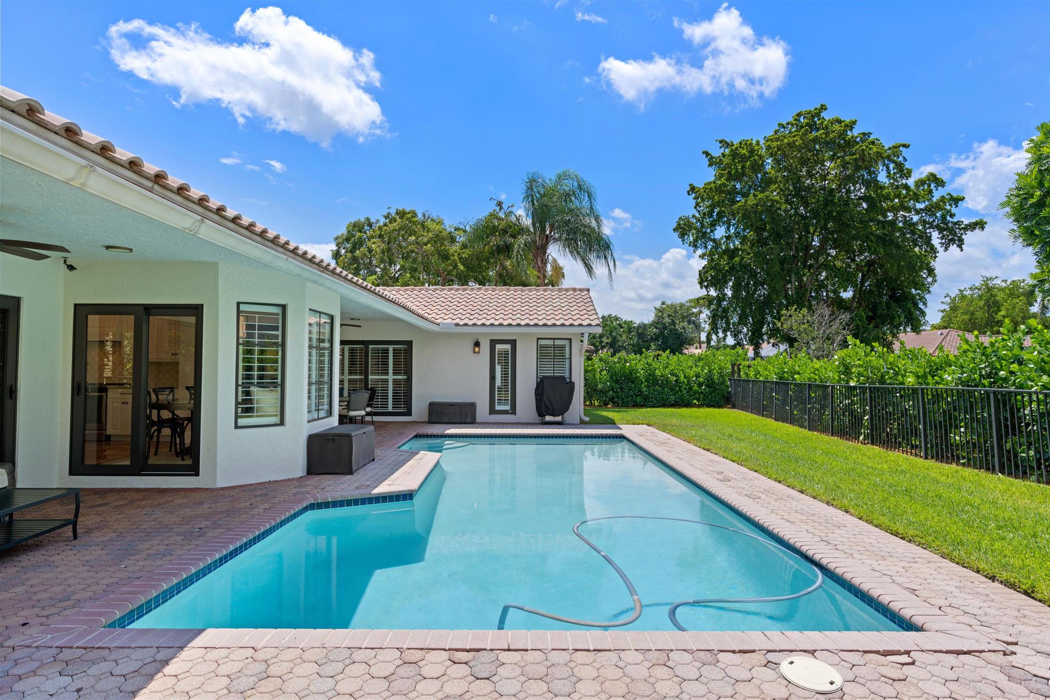 Updated 4BR/2.5 pool home located in the central Boca Raton community of New Floresta. Renovation completed by the interior design firm The Tailored Pillow. Volume wood beam ceilings complete with recessed LED lighting. Formal living room with sliders to the patio area framed with custom draperies. Spacious dining room perfect for any special occasion. Open kitchen with island features SS appliances, quartzite counters and additional storage in the island. Large pantry with double doors and shelving provides ample space for groceries and small appliance storage. Custom banquet ideal for everyday meals. Split floor plan with wood floors in all the bedrooms. All bedrooms include closet organizers. Primary suite opens to pool with sliding glass doors. Luxurious primary bathroom adorned in