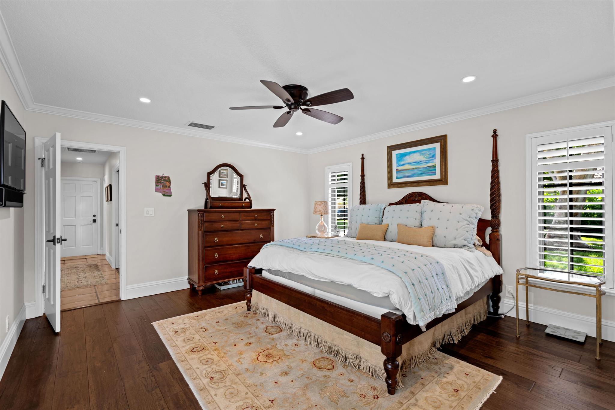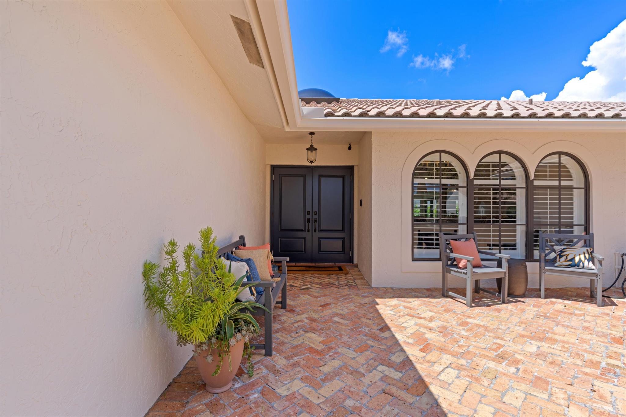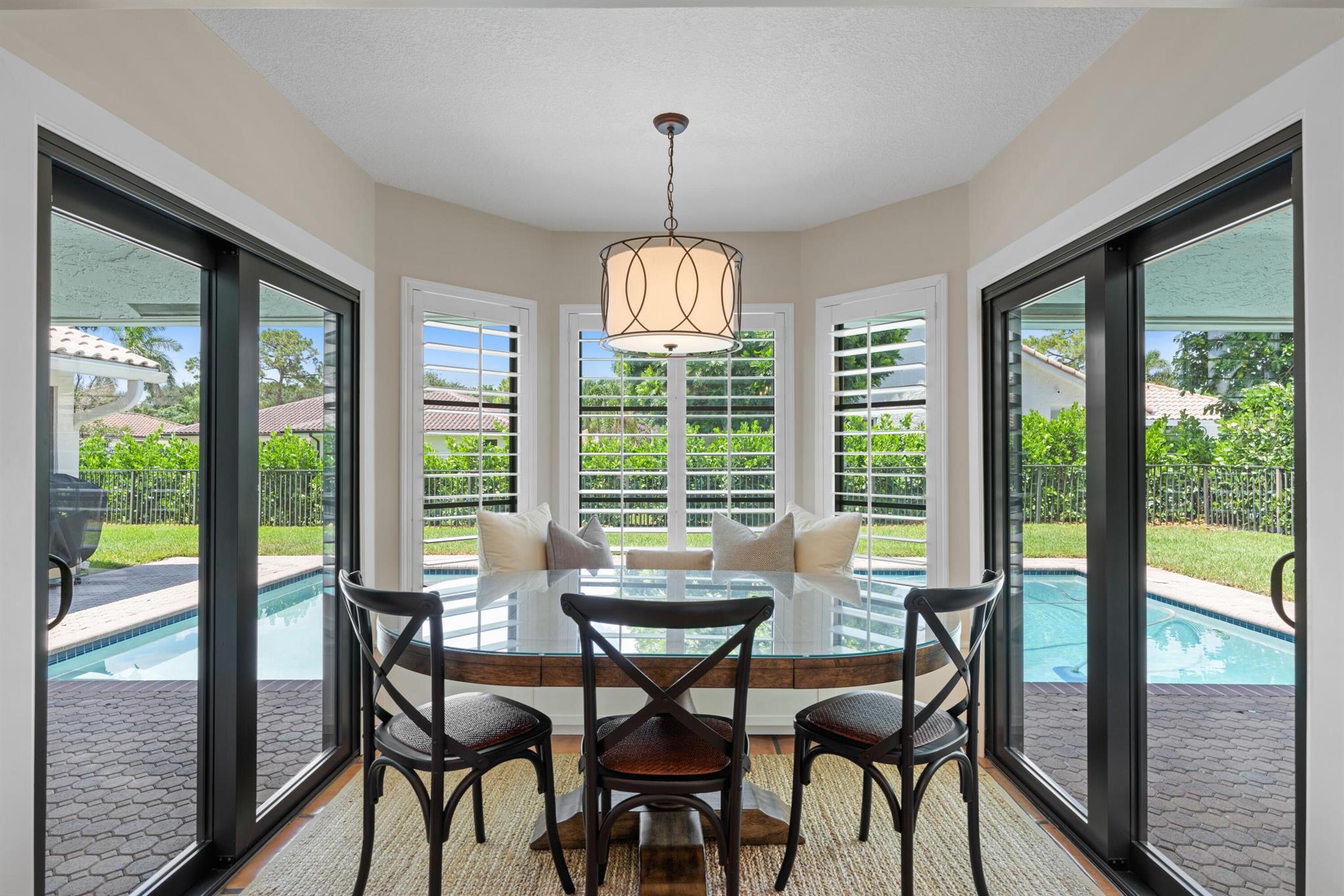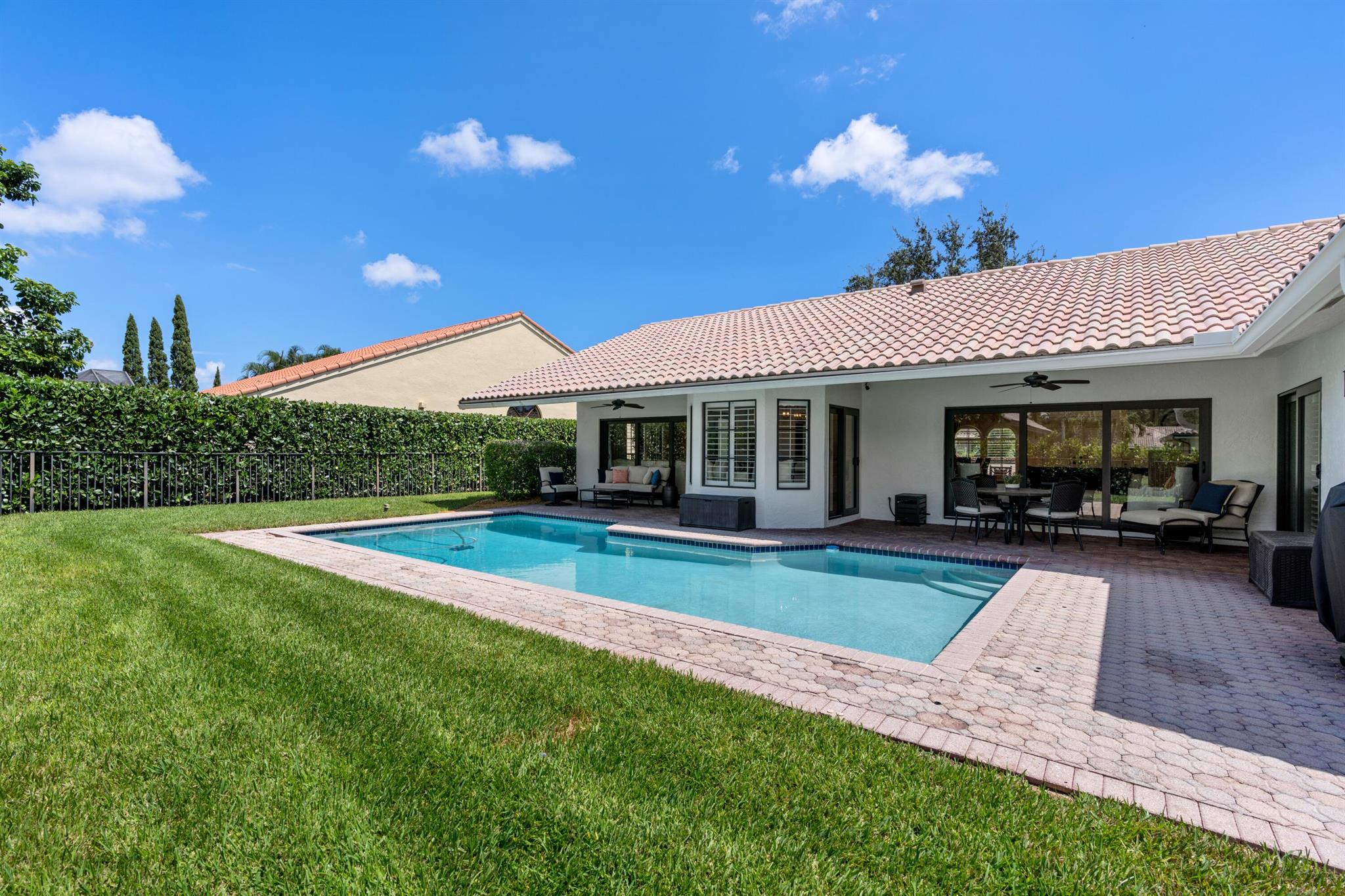 Updated 4BR/2.5 pool home located in the central Boca Raton community of New Floresta. Renovation completed by the interior design firm The Tailored Pillow. Volume wood beam ceilings complete with recessed LED lighting. Formal living room with sliders to the patio area framed with custom draperies. Spacious dining room perfect for any special occasion. Open kitchen with island features SS appliances, quartzite counters and additional storage in the island. Large pantry with double doors and shelving provides ample space for groceries and small appliance storage. Custom banquet ideal for everyday meals. Split floor plan with wood floors in all the bedrooms. All bedrooms include closet organizers. Primary suite opens to pool with sliding glass doors. Luxurious primary bathroom adorned in