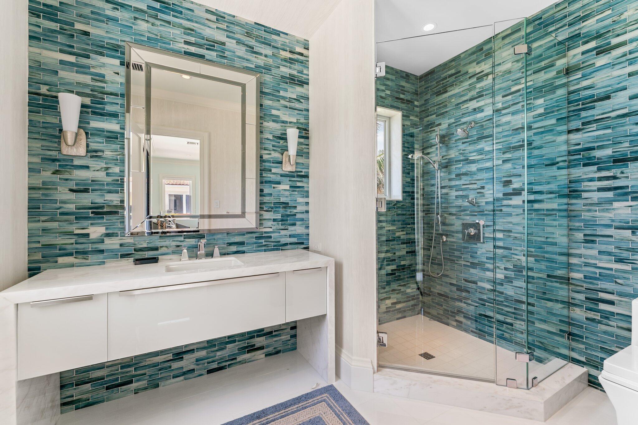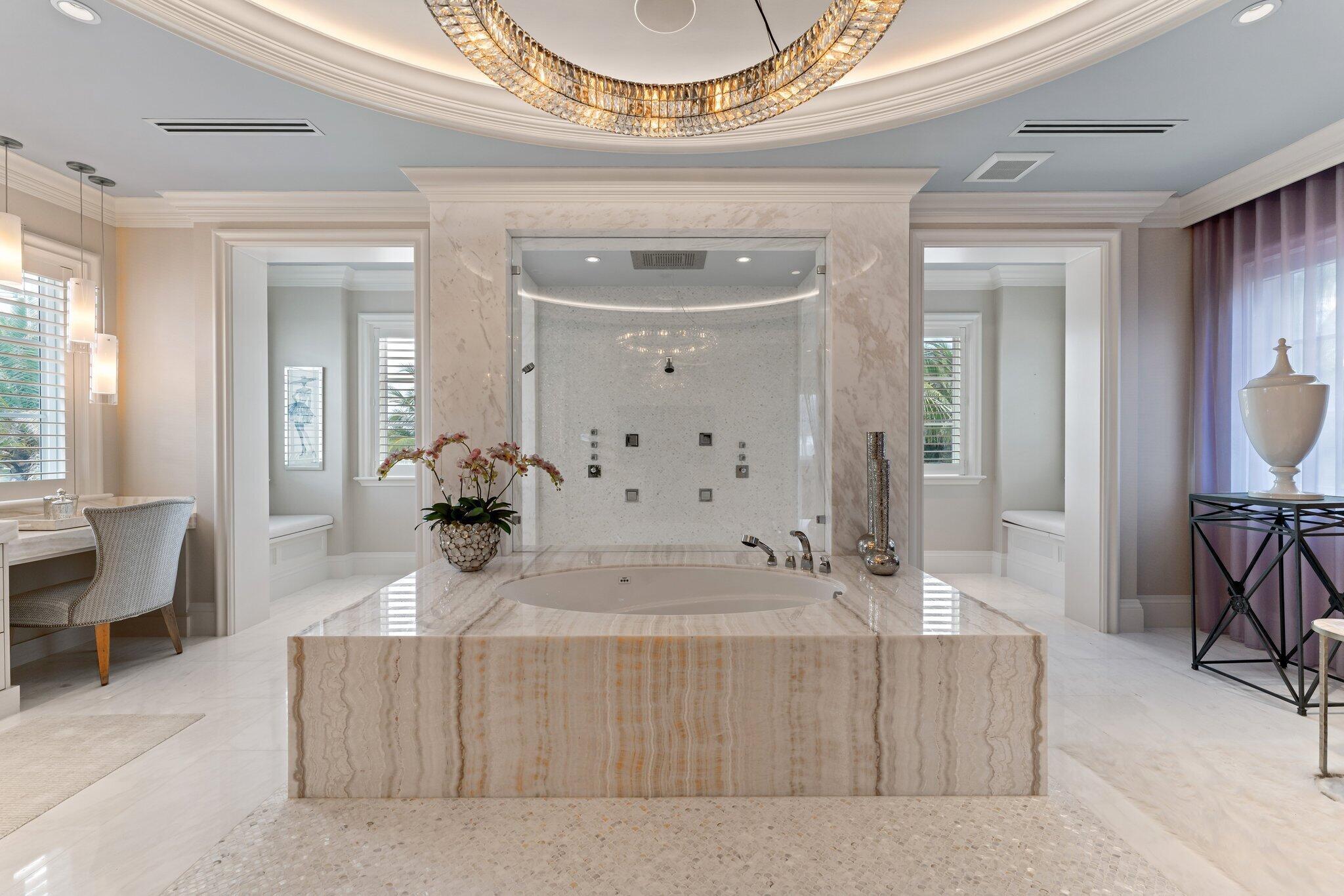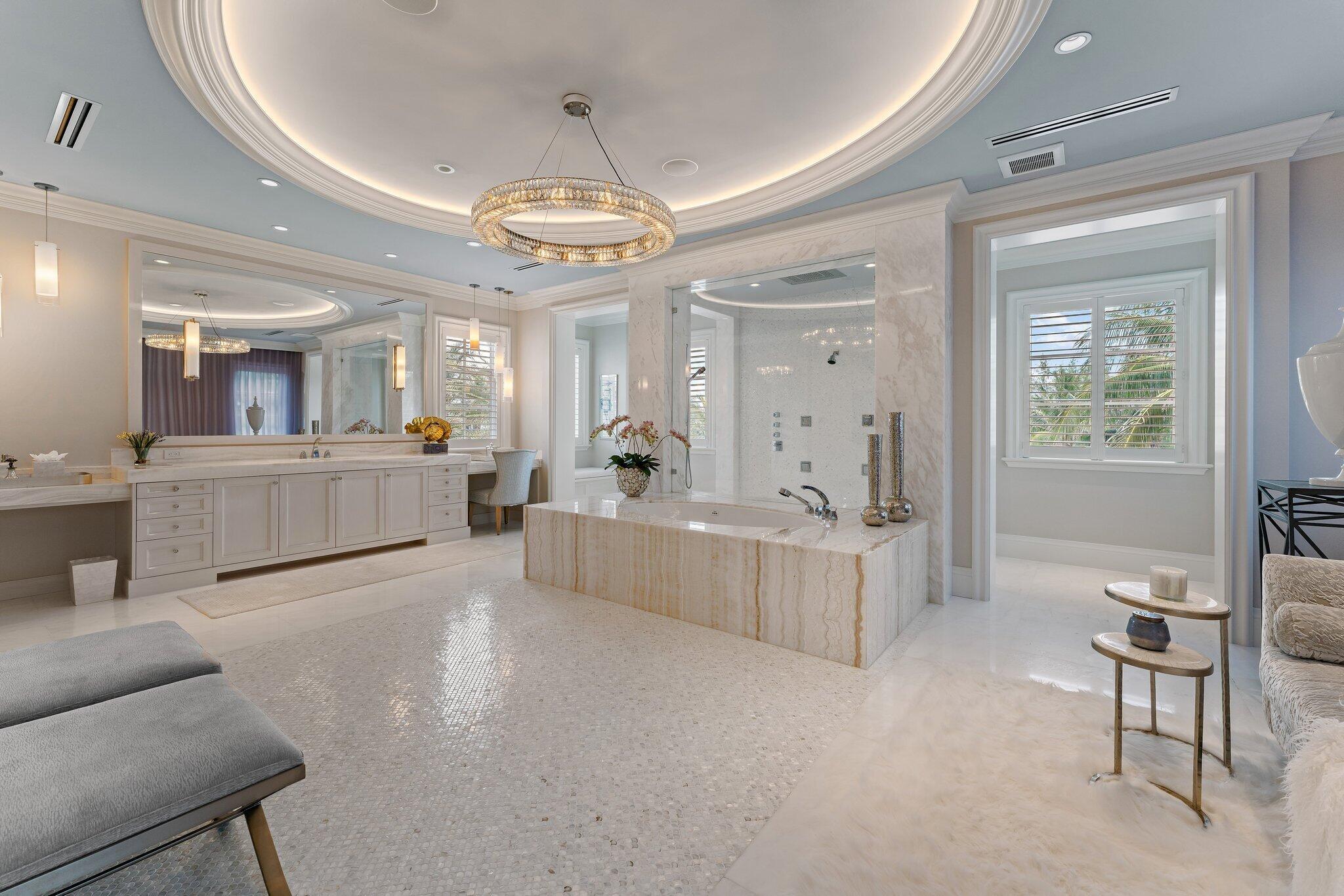 ''Villa Oceano Azul'' -1400 S Ocean Blvd. Manalapan, Florida. This magnificent estate residence is situated between the Atlantic Ocean and the Intracoastal Waterway in the exclusive estate section of Manalapan. As its name implies, this extraordinary property totals nearly 2 acres with over 200 feet of direct oceanfront and an accompanying 200 feet on the Intracoastal Waterway equipped with a full-service concrete dock. Offered fully furnished and turnkey with transitional coastal inspired interiors by Marc-Michaels Interior Design, this stunning European-inspired Villa creates graciously proportioned rooms in a grand total of 20,712 square feet with seven bedrooms, nine full and four half baths, including a guest​​‌​​​​‌​‌​​​​‌‌​‌​​​​‌‌​​‌‌​​‌‌ house.